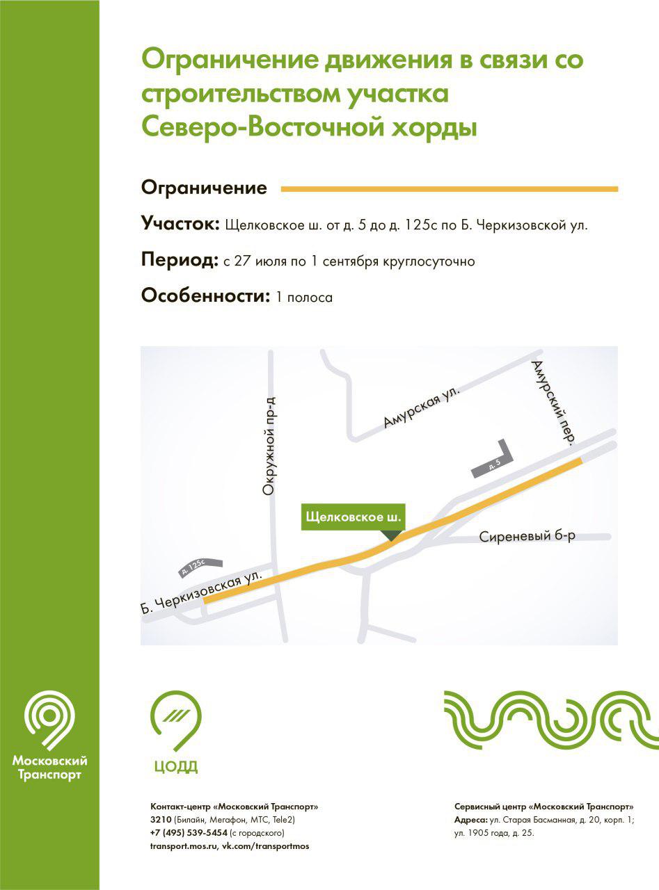 В связи со строительством участка Северо-Восточной хорды сужение в одну полосу предусмотрено с 27 июля по 1 сентября на участке от д. 5 по Щелковскому шоссе до д. 125с по ул. Большая Черкизовская.