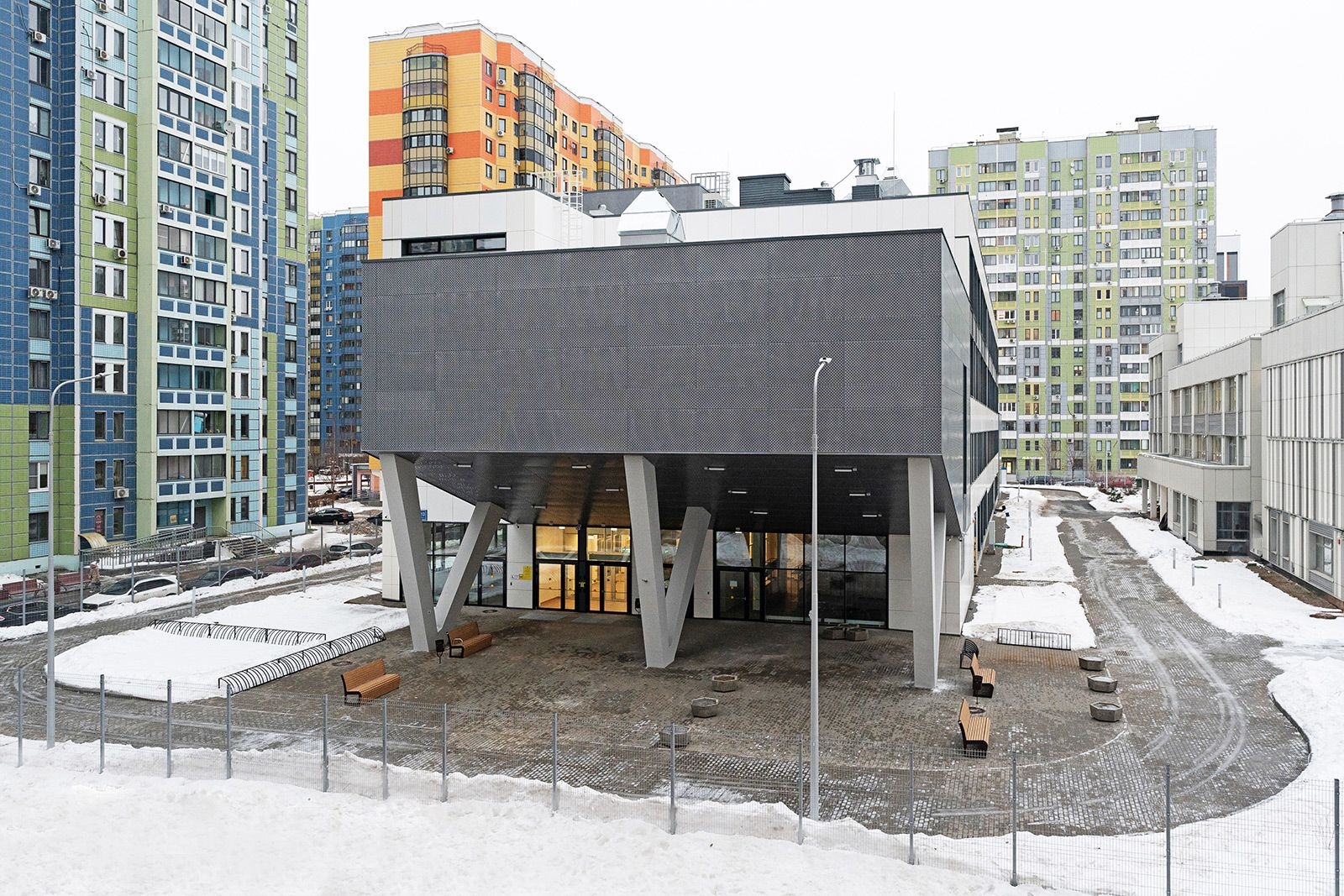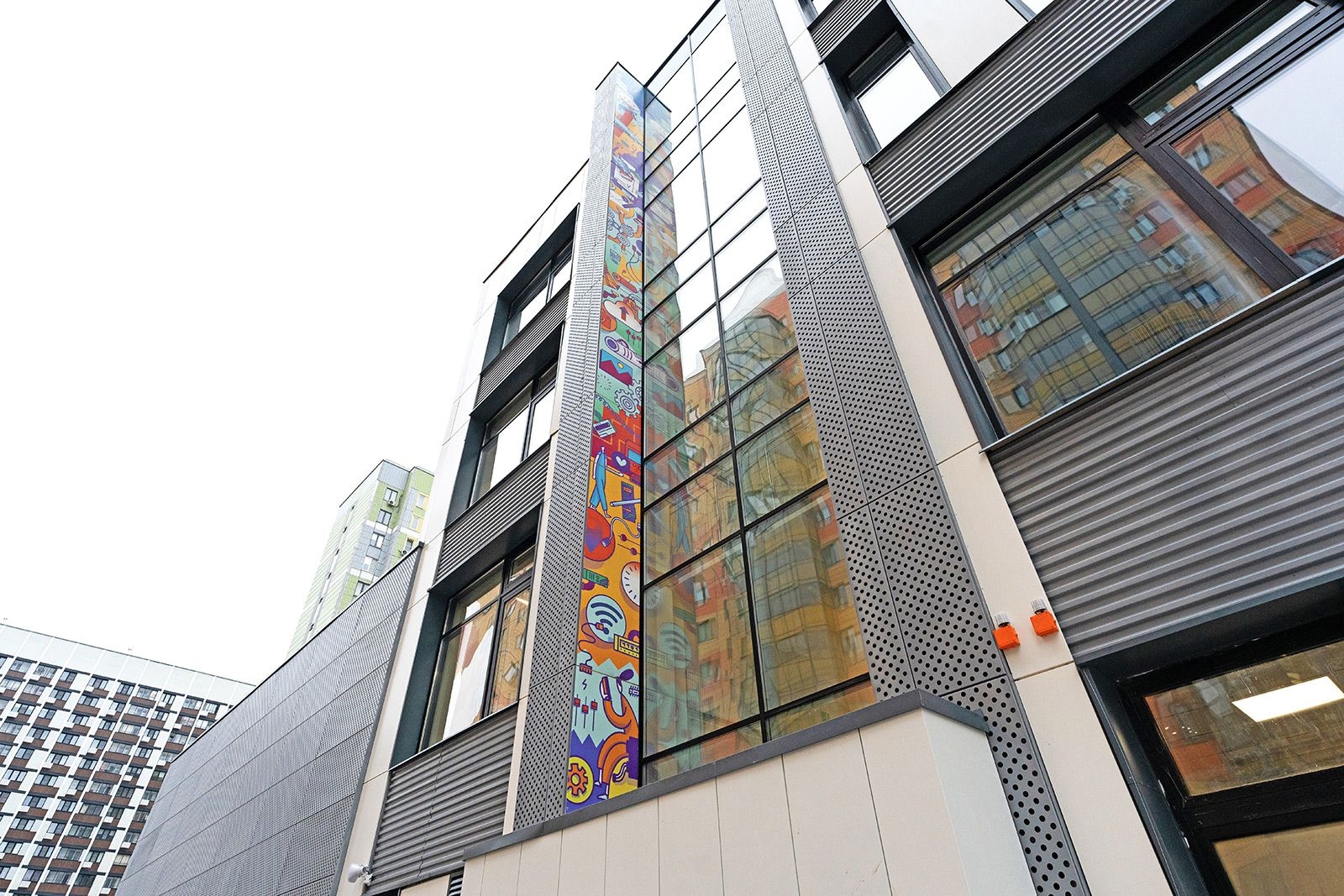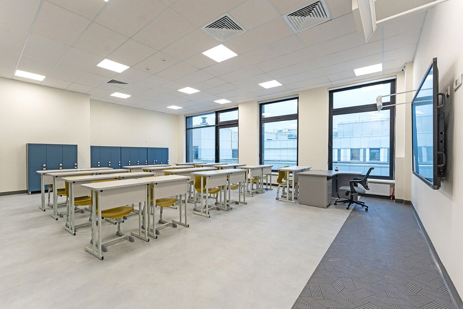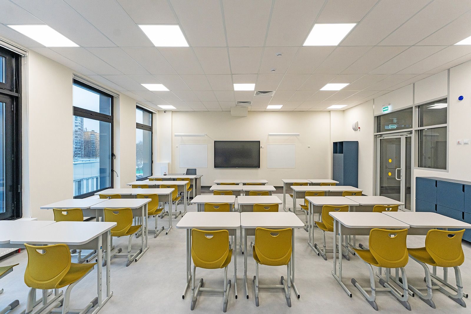 Школьное здание площадью более 6,6 тыс. кв. м построили по адресу: Большой Тишинский переулок, д. 39 в центре столицы. Здесь предусмотрены ИТ-полигон и обучение 3D-программированию, современные учебные кабинеты, медиатека.