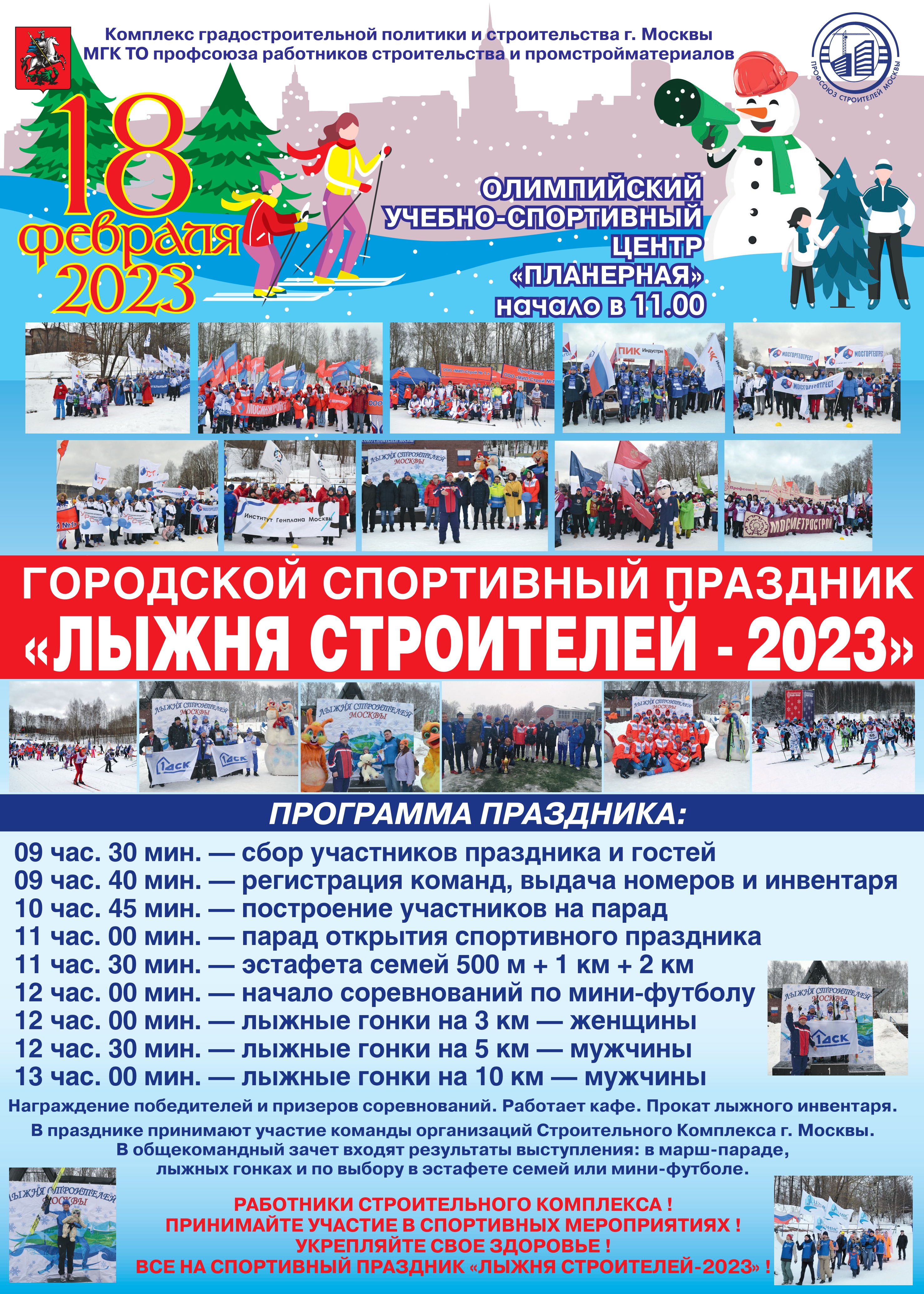 18 февраля в Олимпийском учебно-спортивном центре «Планерная» пройдет «Лыжня строителей» Стройкомплекса столицы. В этом году традиционный праздник спорта состоится в 34-й раз.