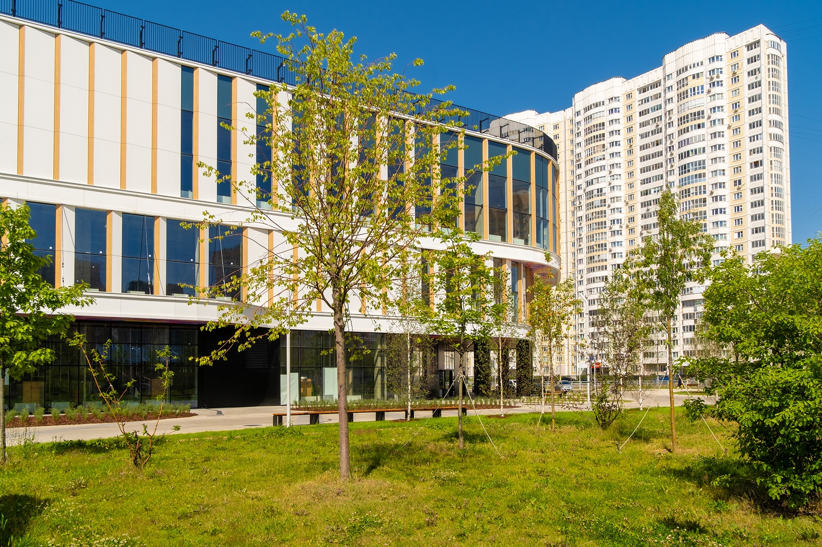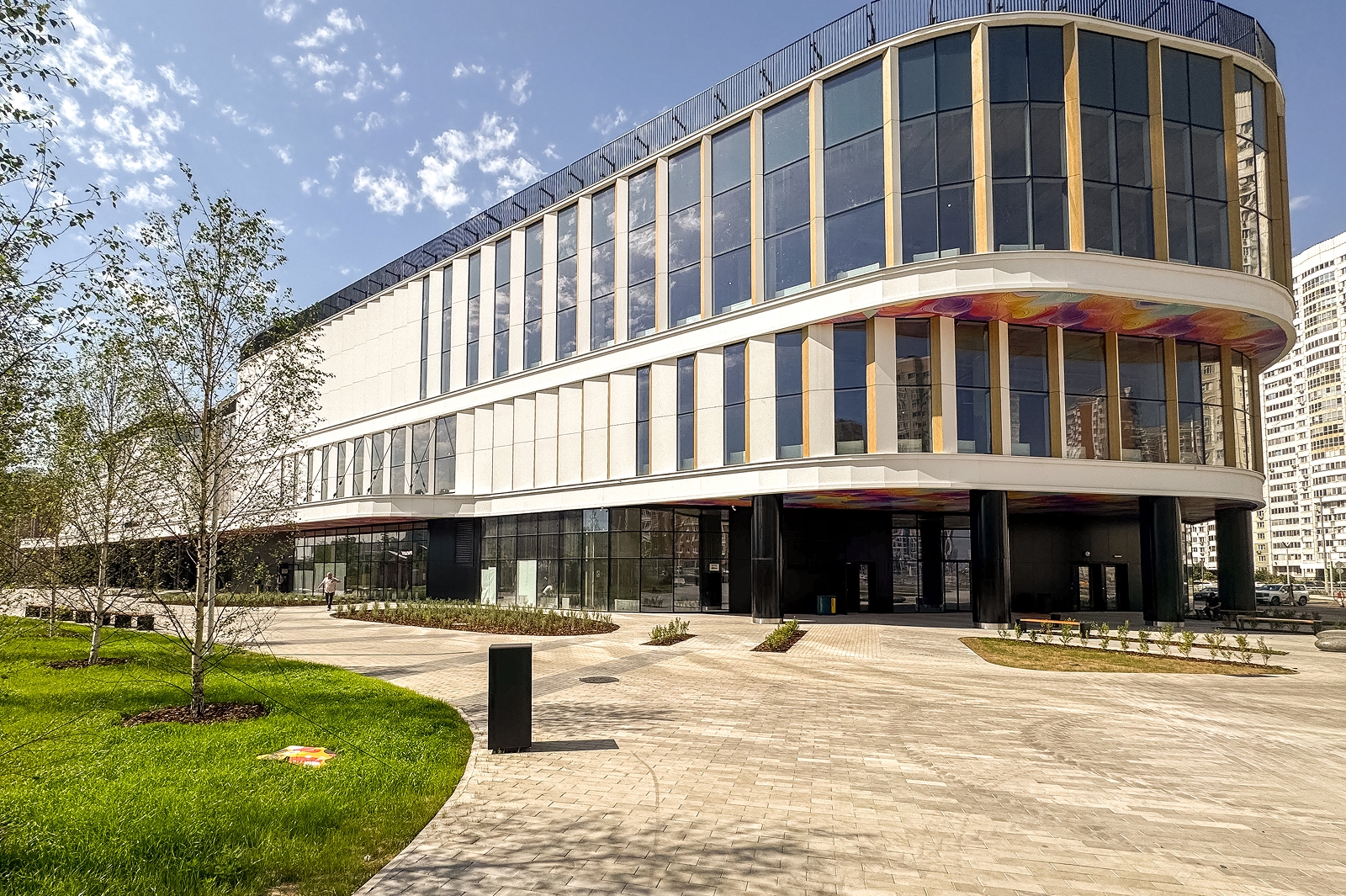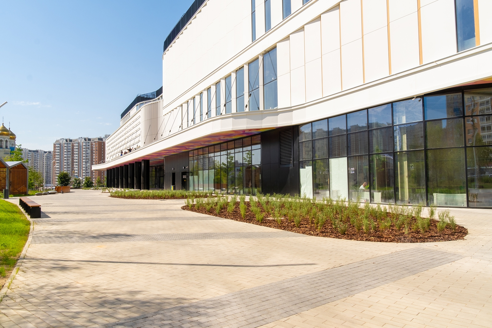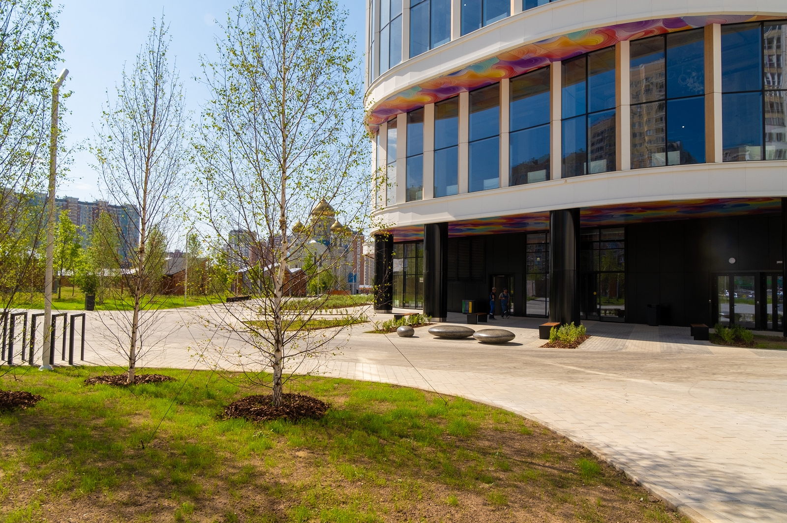 По его словам, вокруг здания разбиты цветники, высажены деревья и травы-многолетники, обустроена зона отдыха с прогулочной аллеей, амфитеатром и скамейками.