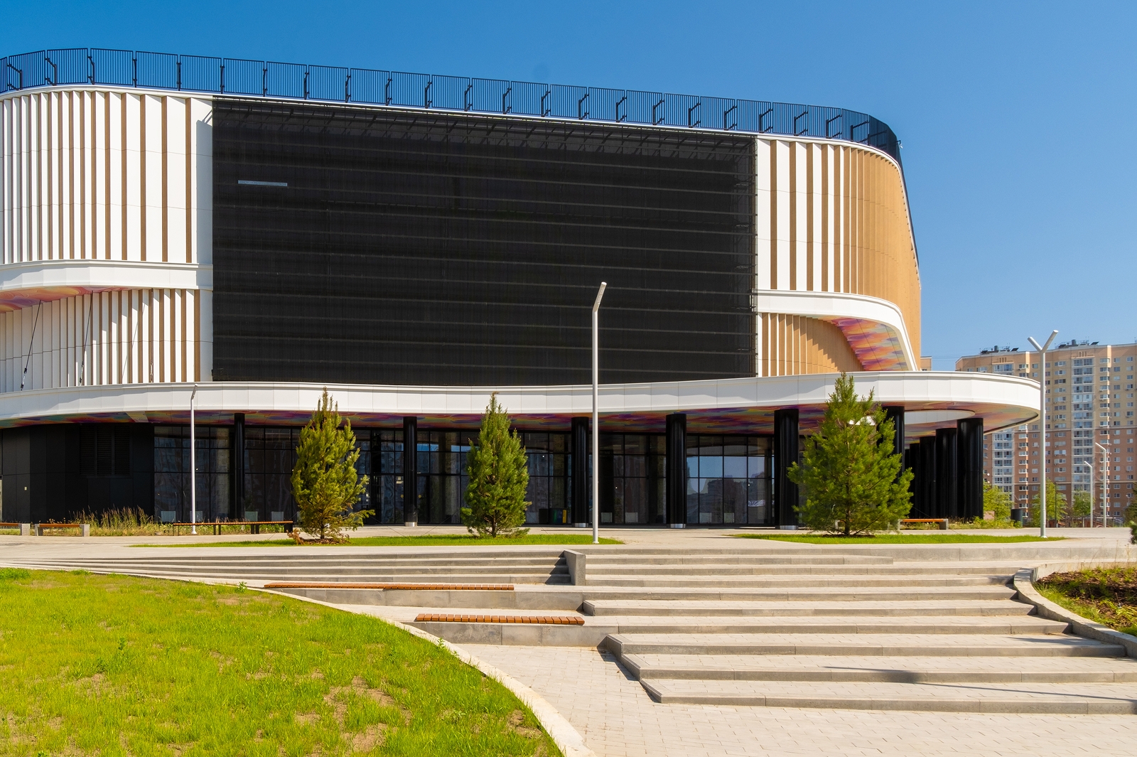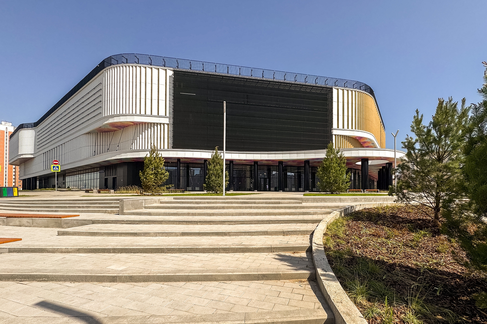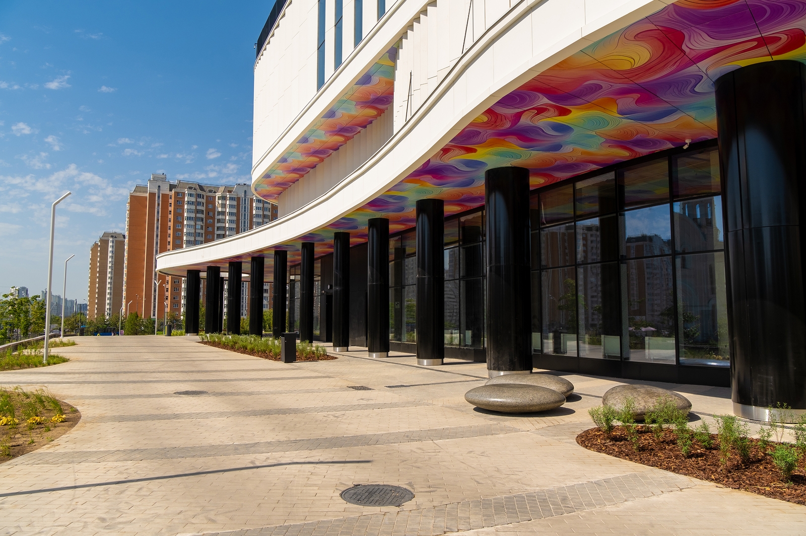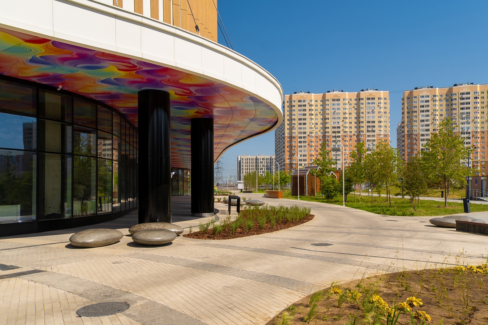 По его словам, вокруг здания разбиты цветники, высажены деревья и травы-многолетники, обустроена зона отдыха с прогулочной аллеей, амфитеатром и скамейками.