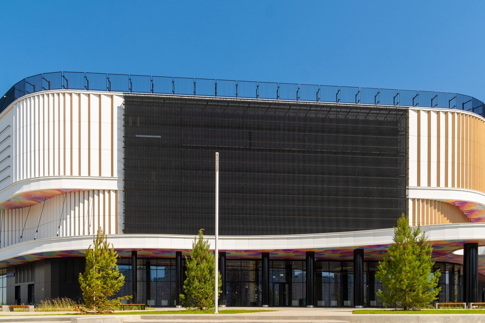 При отделке фасада ТРЦ использованы металлокассетные панели, витражное остекление. Все три входа, включая главный, выполнены на уровне земли, чтобы доступ в здание был удобен всем посетителям, в том числе маломобильным.