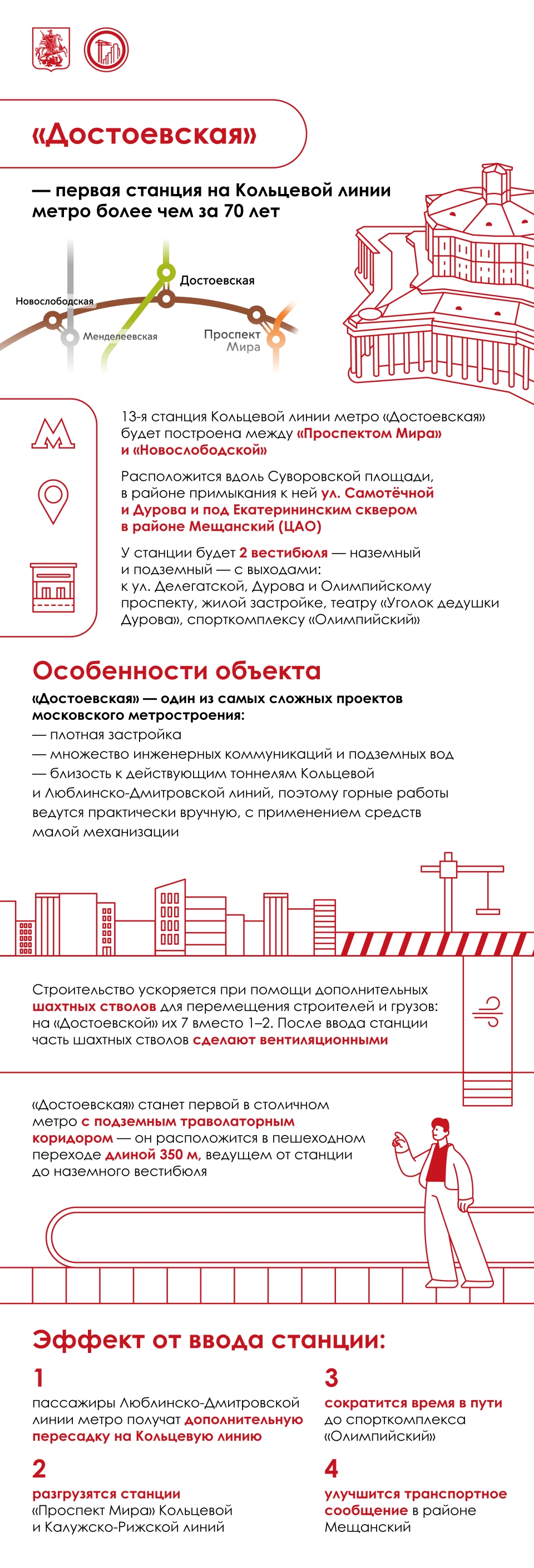 «Работы ведутся в историческом центре Москвы в условиях плотной застройки, множества инженерных коммуникаций и подземных вод, что делает этот проект одним из самых сложных в столичном метро. Чтобы не останавливать на время основного этапа строительства станции «Достоевская» движение поездов на Кольцевой линии, создаются обходные тоннели протяженностью более 1,7 тыс. метров. Из них свыше 1,3 тыс. метров пройдут горным способом, который подразумевает фактически ручную проходку с использованием средств малой механизации», – сказал Владимир Ефимов.
