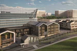 Снаружи стены дома облицуют керамогранитными плитами в составе навесной фасадной системы, а в уровне первого этажа предусмотрена декоративная бетонная плитка. Территорию около дома благоустроят и озеленят.