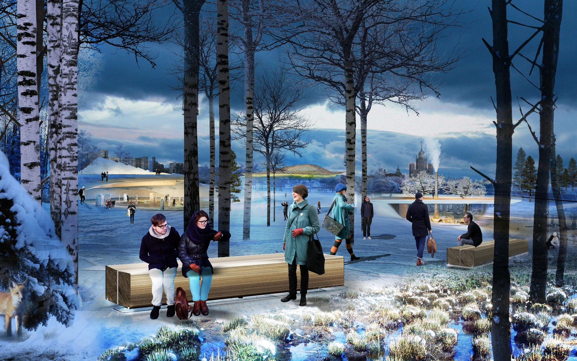В «Зарядье» появятся лавочки-светильники и амфитеатр с деревянными сиденьями