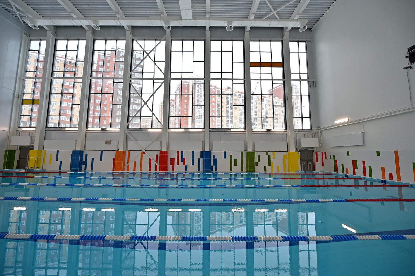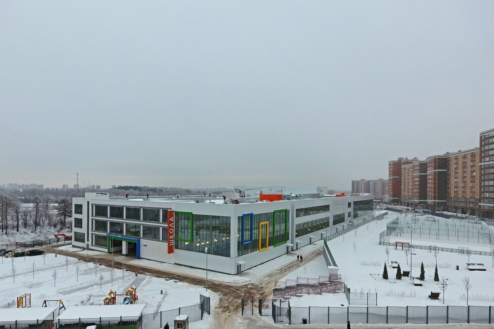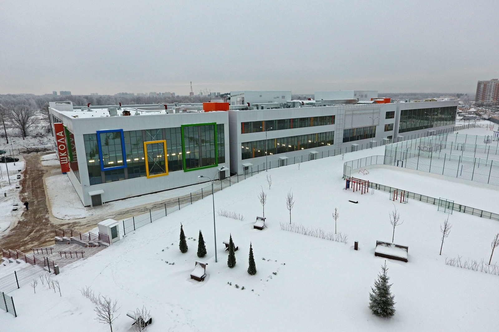 В здании есть спортзалы и бассейн. Спортивные объекты на пришкольной территории доступны всем жителям Коммунарки.