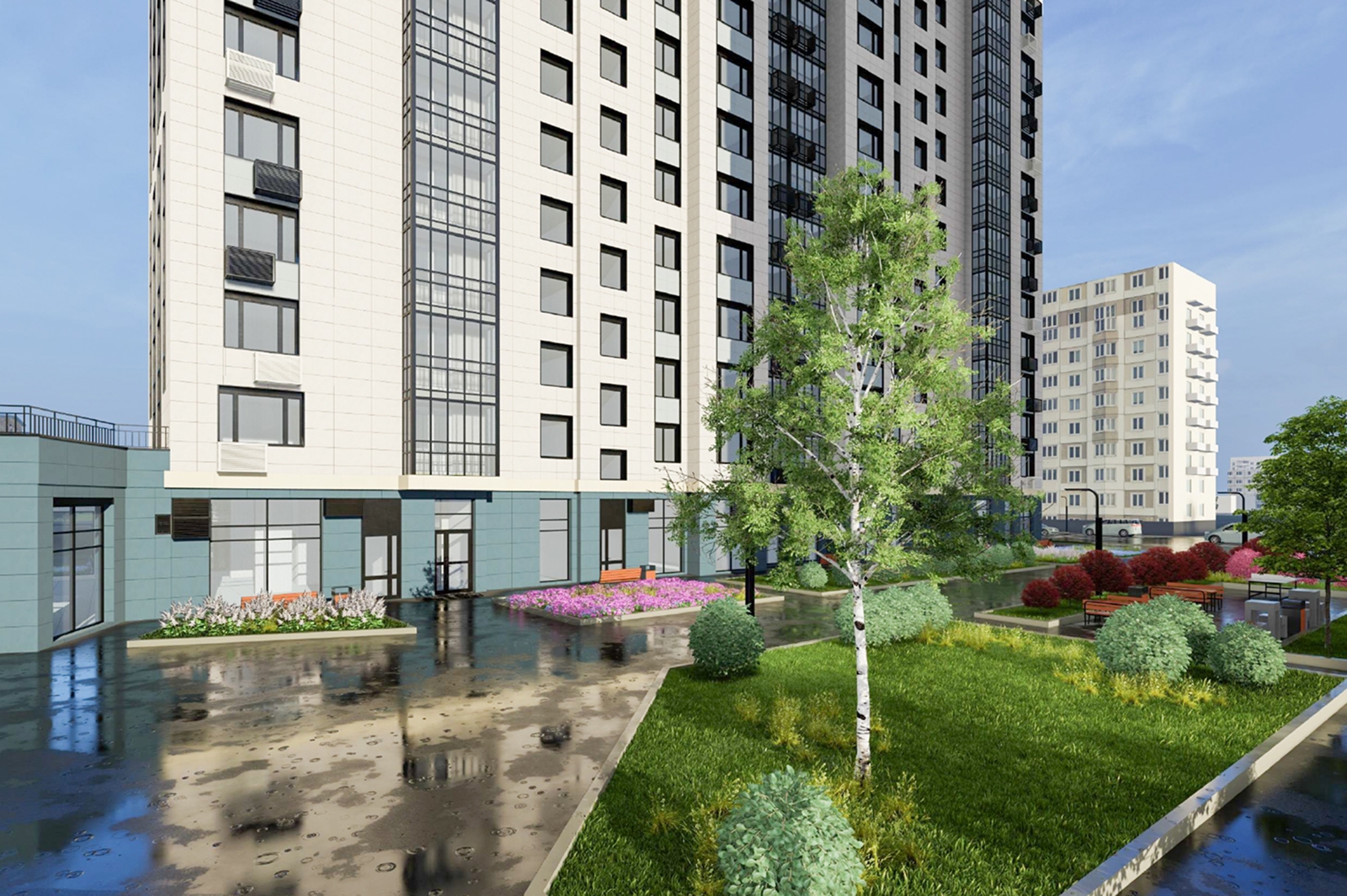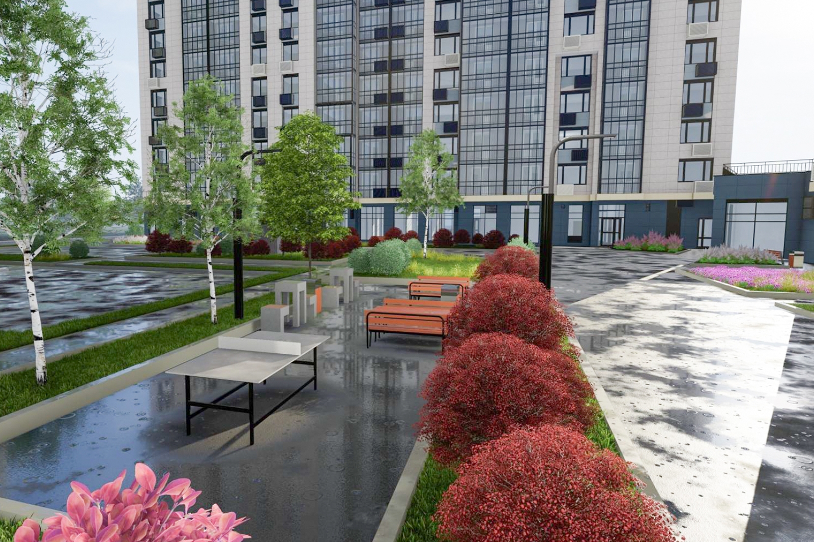 Возле дома обустроят проезды и тротуары. В закрытом от автомобилей дворе появятся места для отдыха, детская и спортивная площадки с покрытием из резиновой крошки.