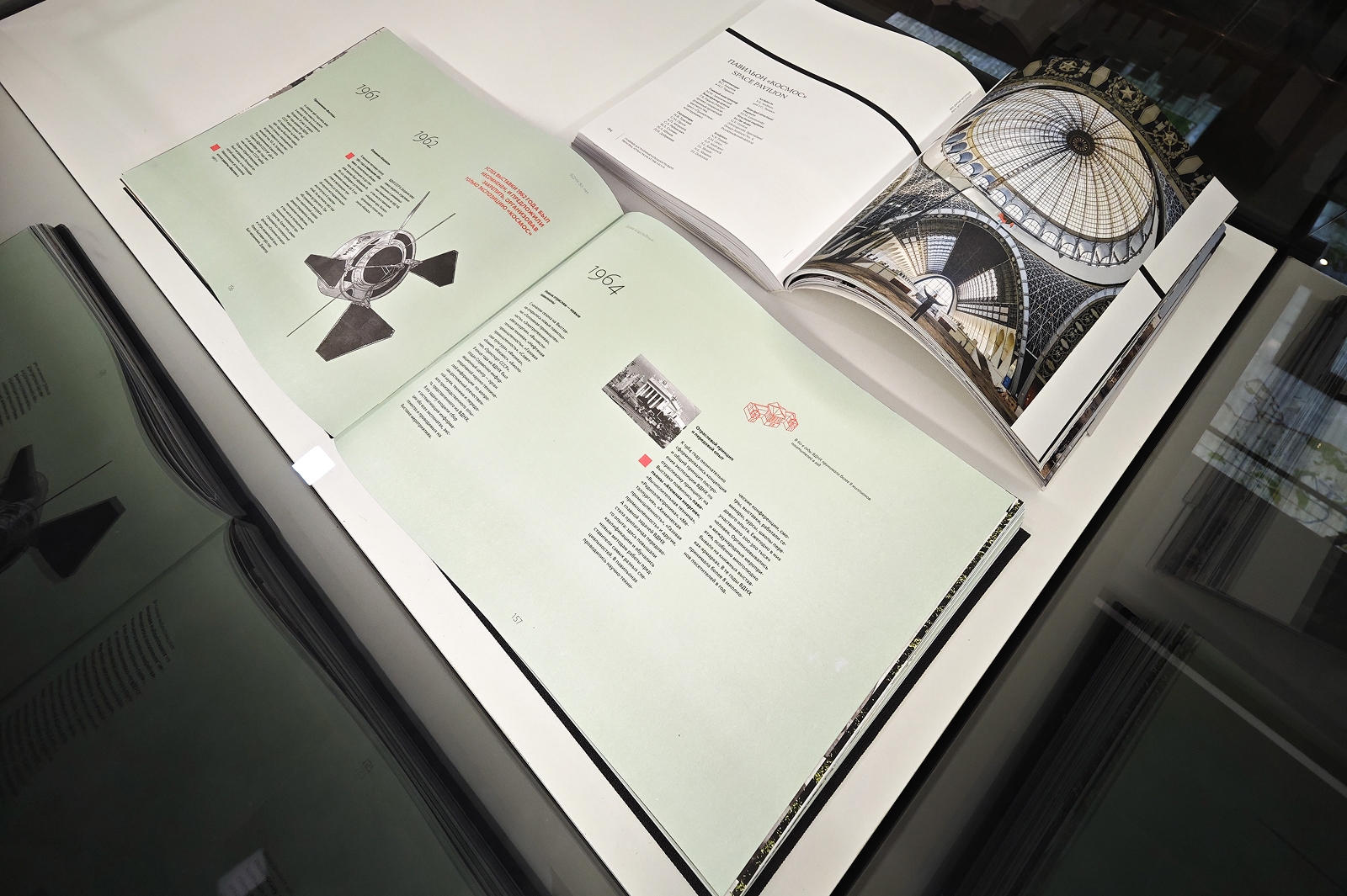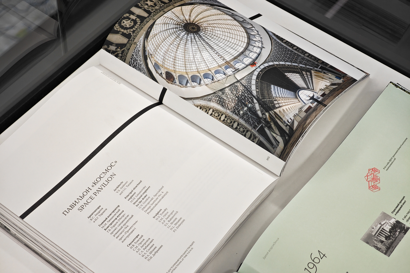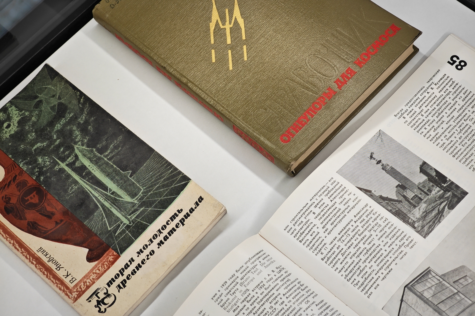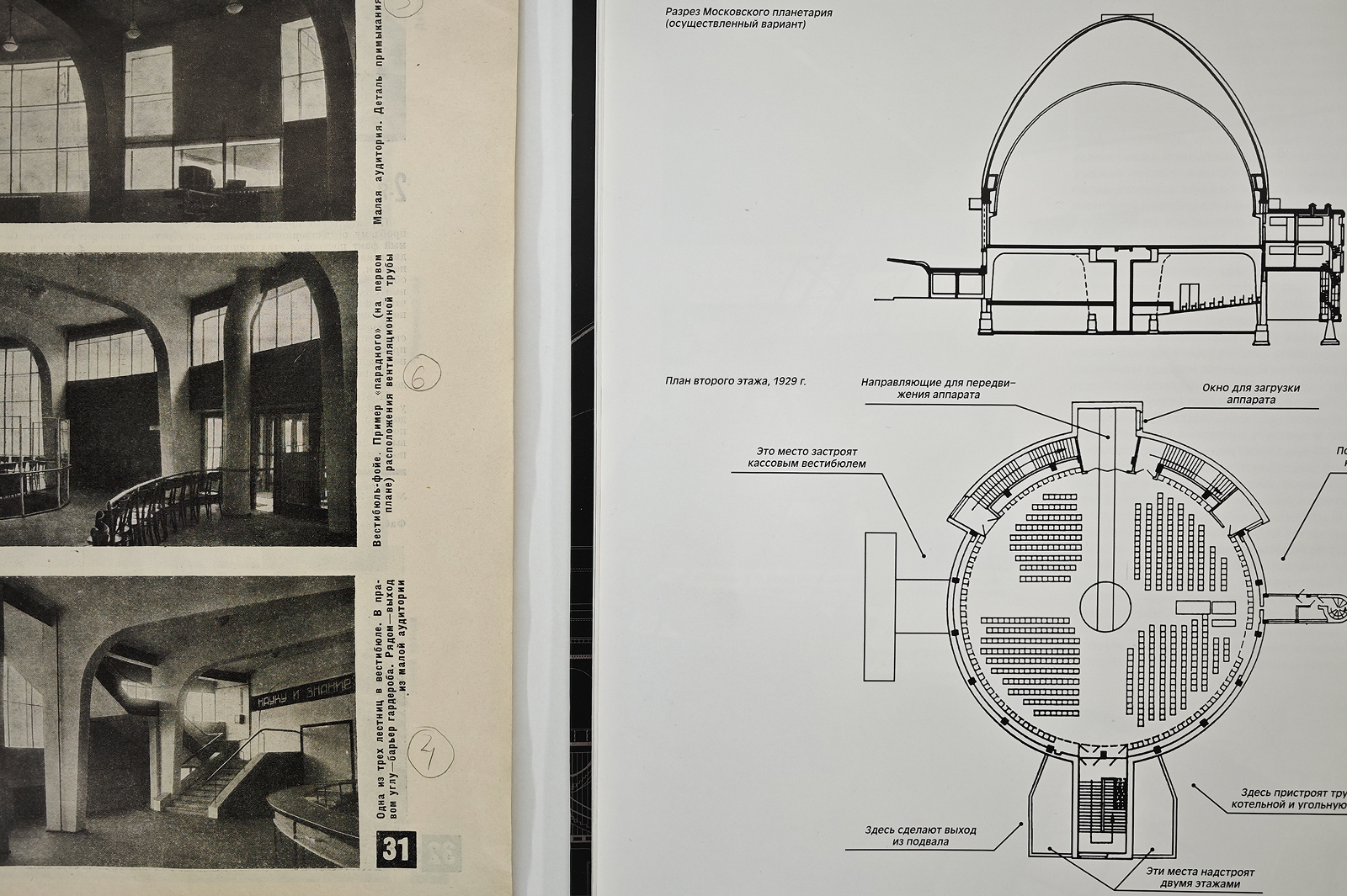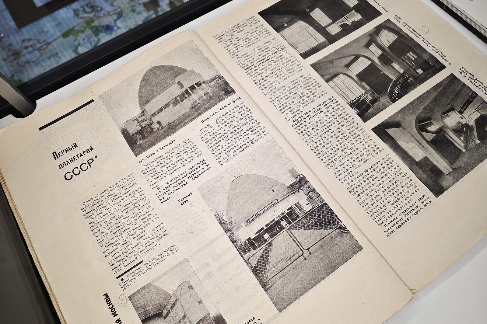 Экспозиция дополнена материалами об уникальных проектах советских архитекторов, вдохновленных космической тематикой, в том числе об открытии первого планетария в СССР.