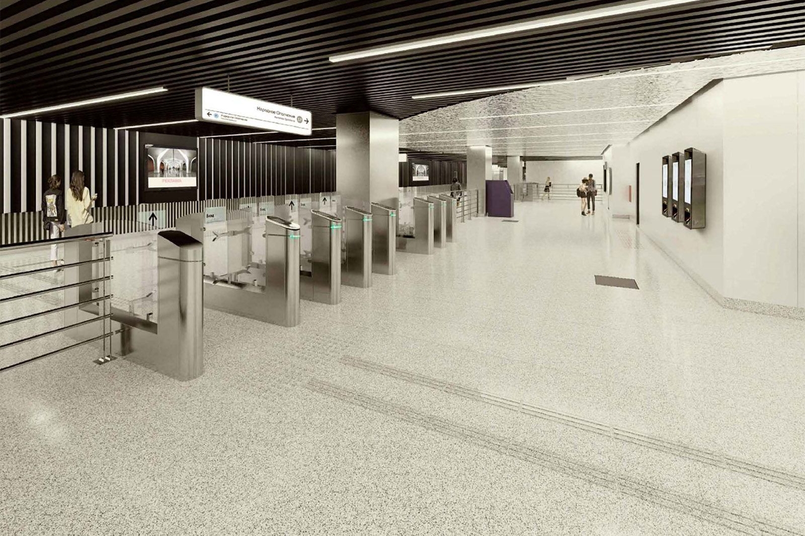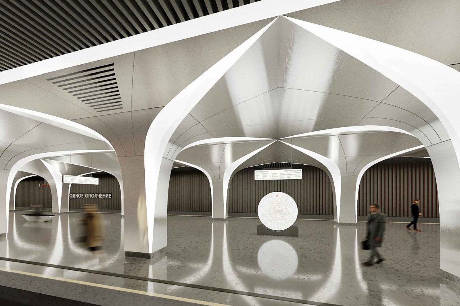«Центральным элементом оформления станции «Народное Ополчение» станут колонны сложной формы, выделенные яркой подсветкой и размещенные в два ряда. Их облицовку выполнят из алюминия. Полы покроют светло-серым гранитом, цоколи путевых стен и колонн – черным, а путевые стены – алюминиевыми сотовыми панелями черного и красного цветов», – отметил генеральный директор АО «Мосинжпроект» Максим Гаман.