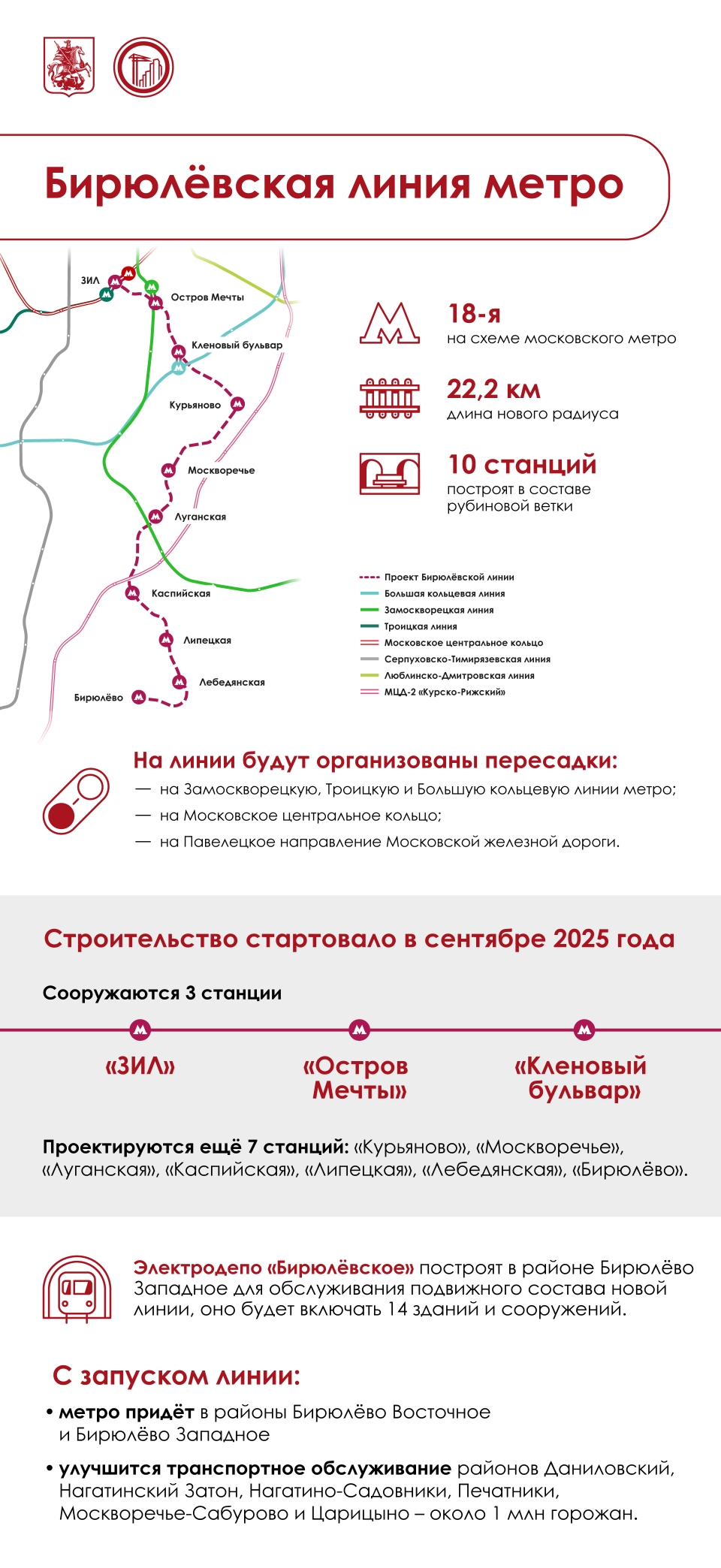 Бирюлёвская линия длиной 22,2 км пройдет от застраиваемой территории бывшей промзоны «ЗИЛ» до районов Бирюлёво Западное и Восточное. На ней будет 10 станций.