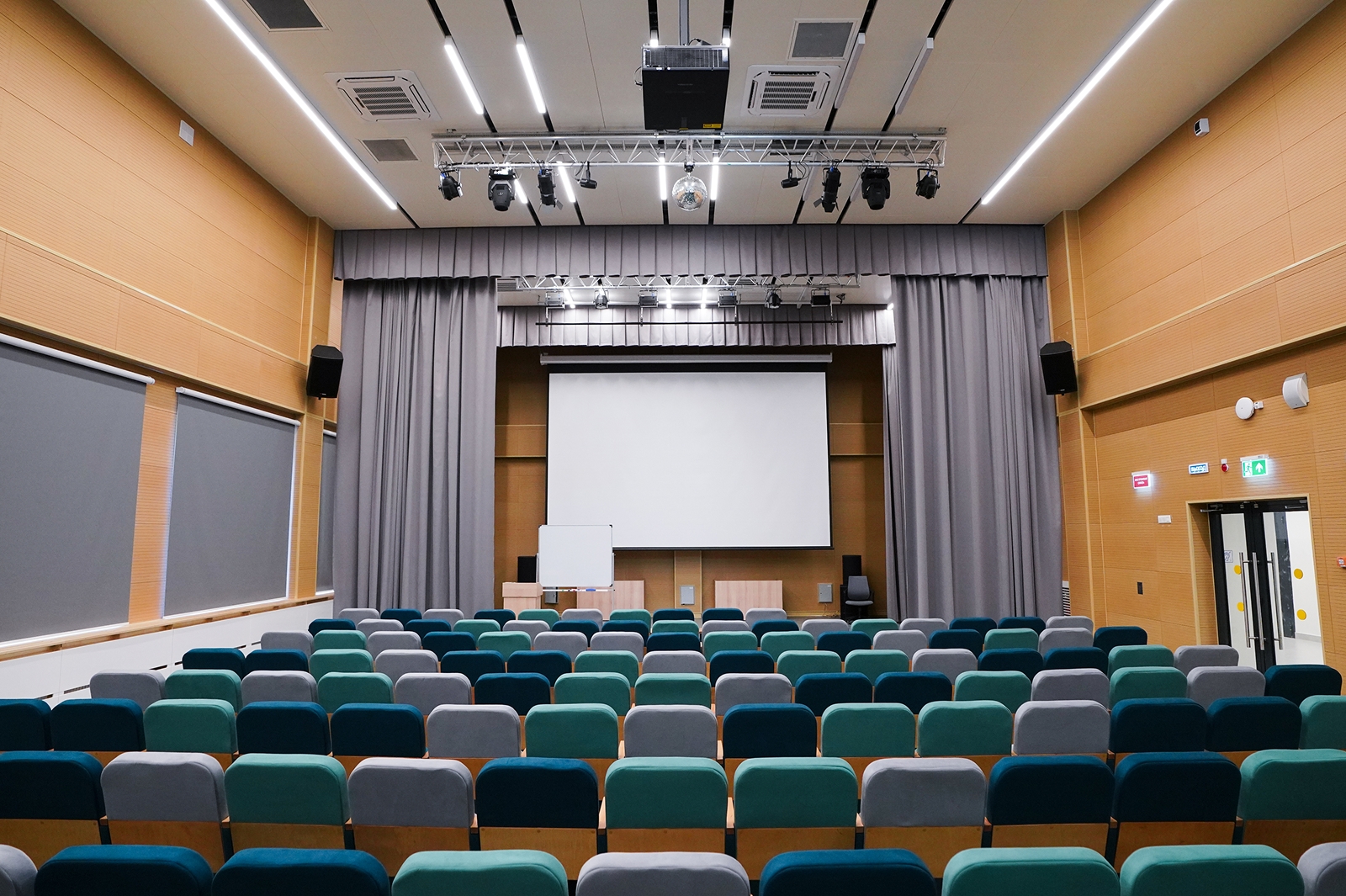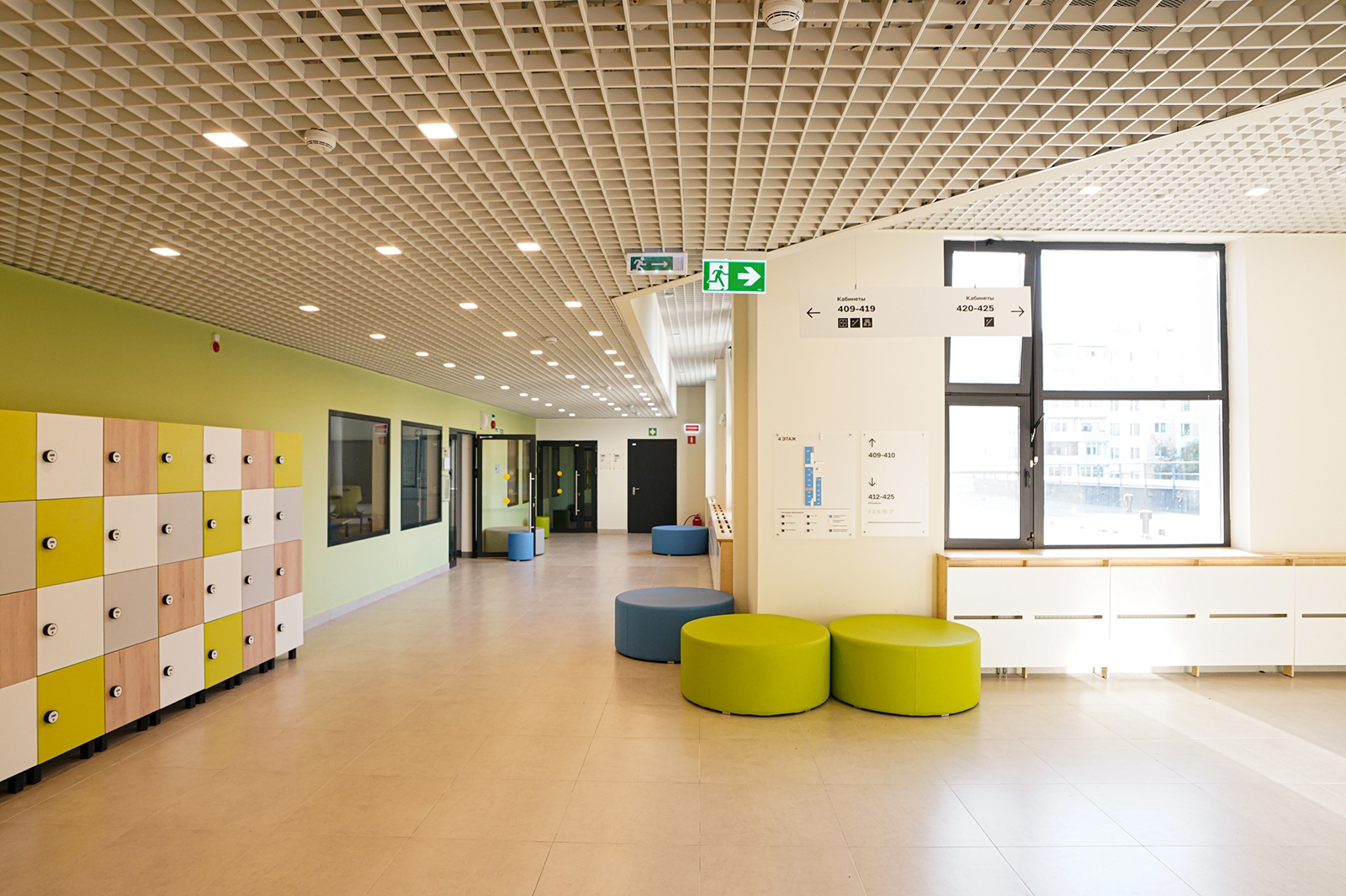 На втором этаже расположены универсальные и специализированные учебные кабинеты, зоны отдыха, зал для проведения мероприятий со светозвуковым и видеопроекционным оборудованием, а также с шумопоглощающими панелями.