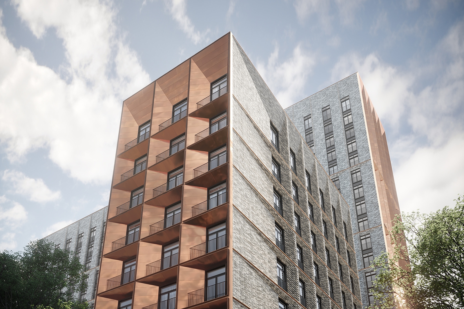 Архитектором проекта «Медный 3.14» выступило бюро Сергея Скуратова. В отделке фасадов домов использовали натуральную медь, стекло и клинкерный кирпич.