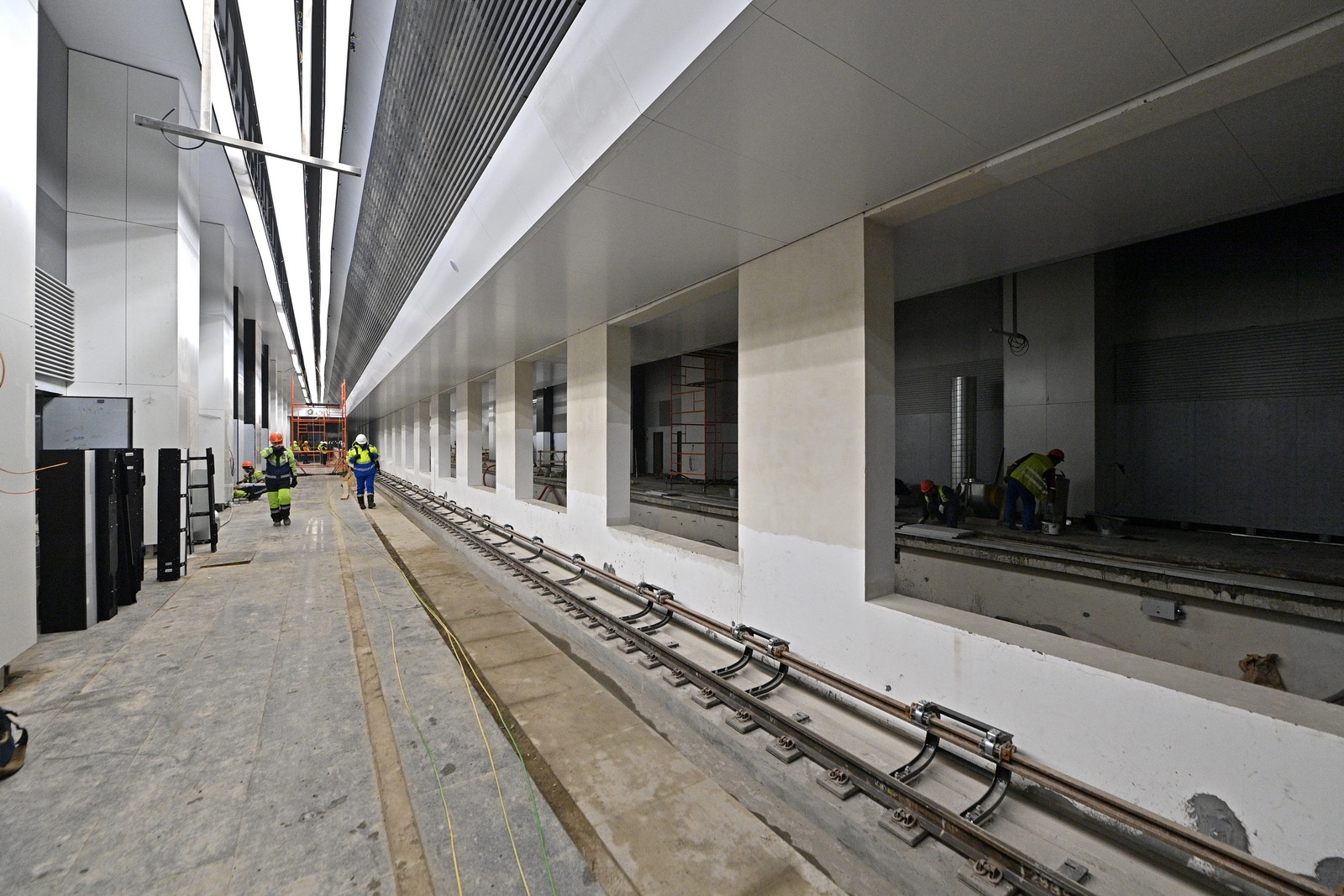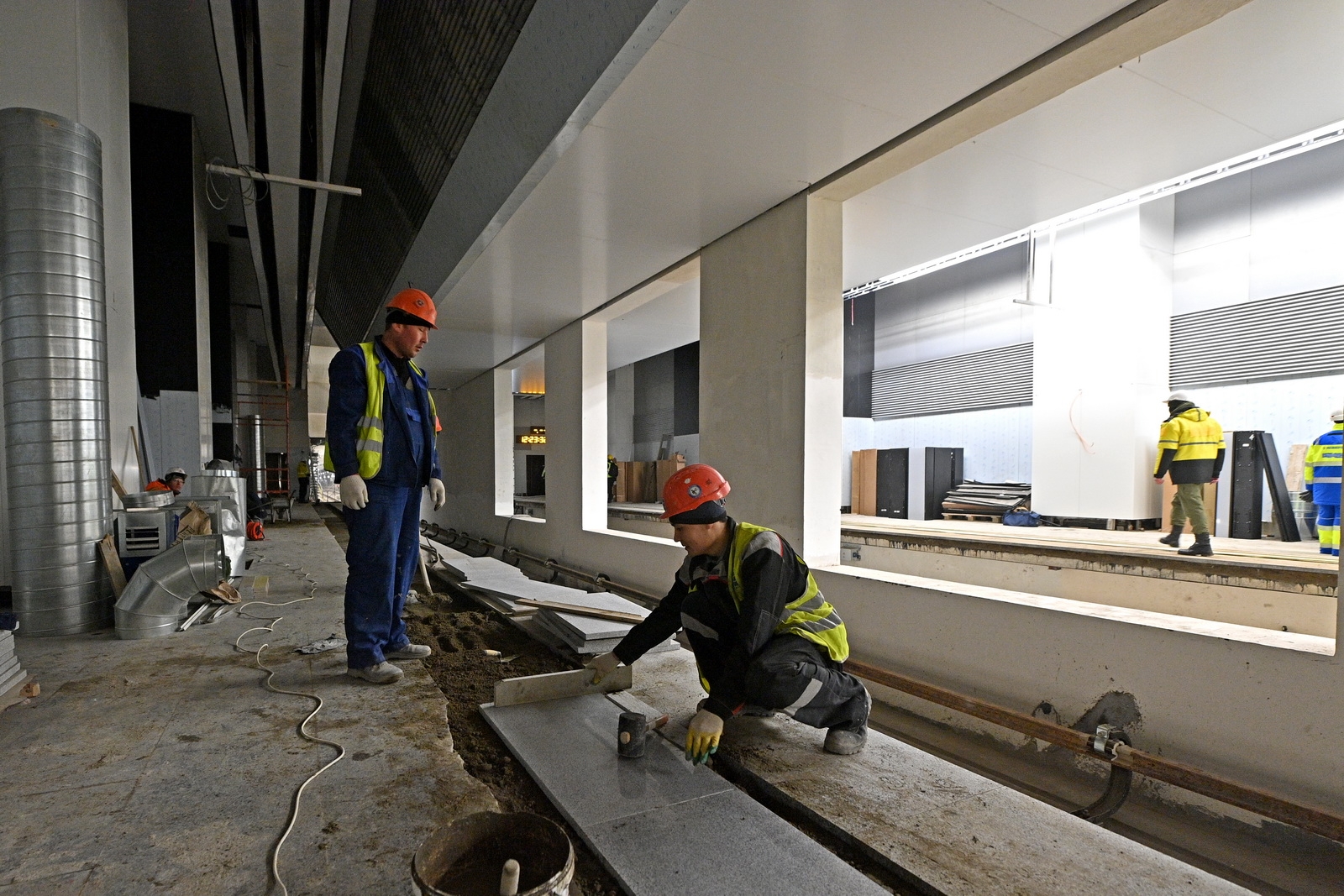 «Отделка ведется в пассажирской и технических зонах. Мы завершаем монтаж архитектурного освещения и оформление платформенной части. Сейчас приступили к установке элементов навигации, включая высококонтрастные указатели и знаки, маршрутно-путевые полосы. Планируется размещение оборудования кассового зала и турникетов», – пояснил Константин Маслаков.