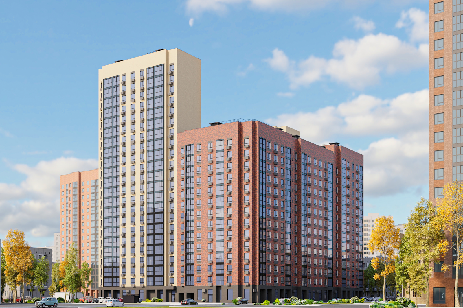Для отделки фасадов используют пиленый кирпич коричневого и бежевого цвета. На них установят металлические корзины под кондиционеры. Входную группу оформят витражным остеклением. В подземном уровне разместится стоянка для автомобилей.