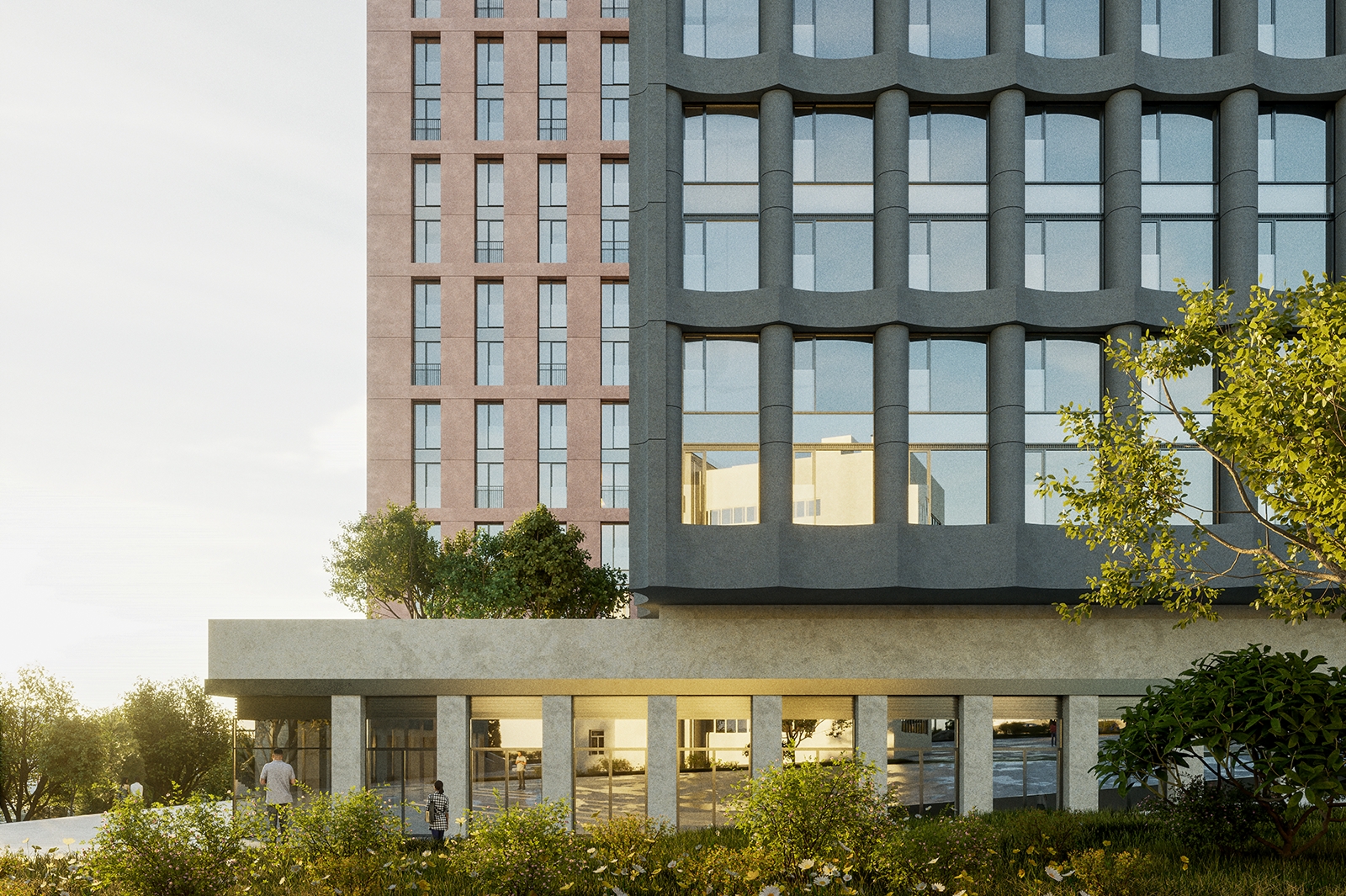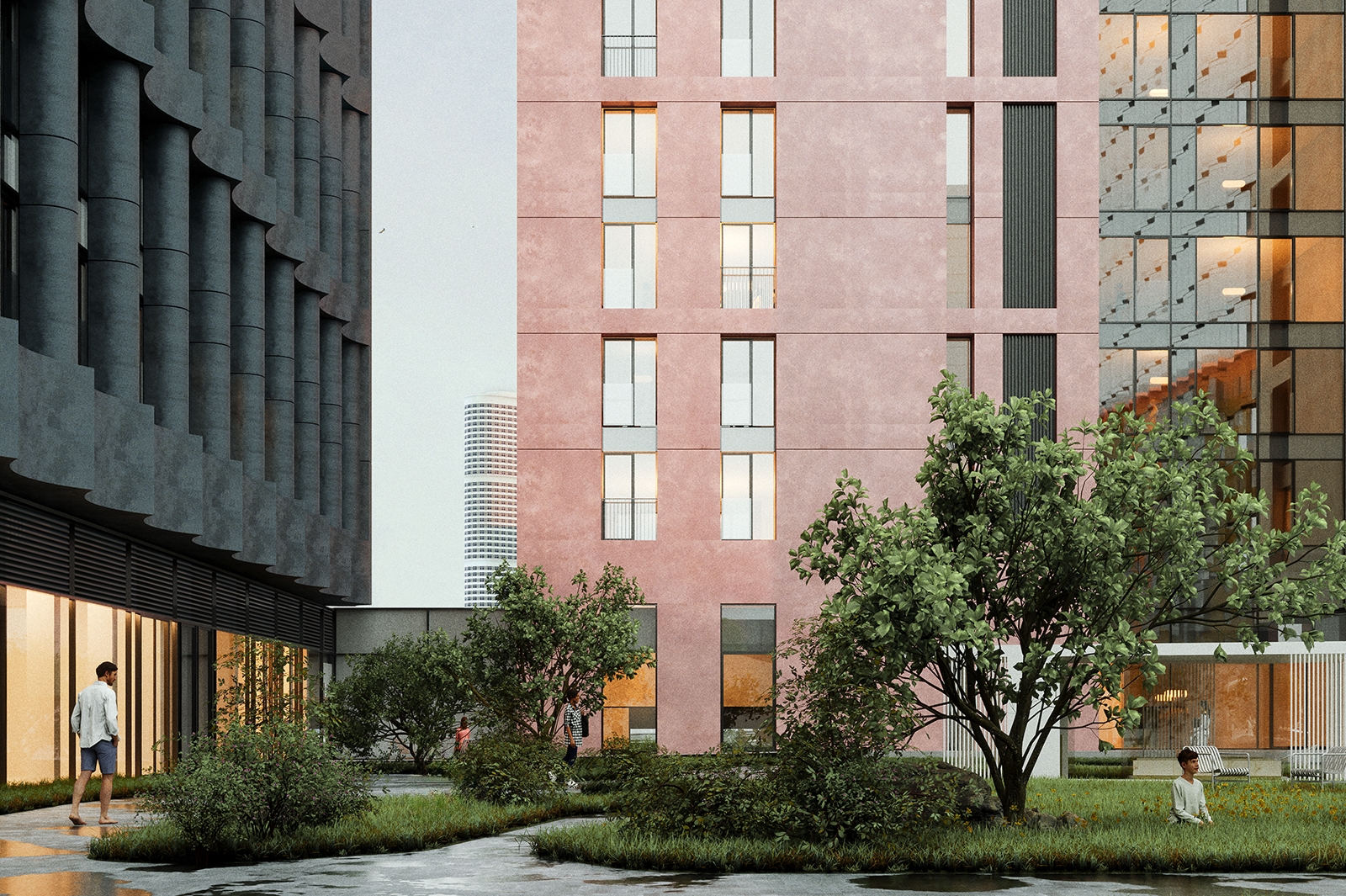 «Розовый оттенок появился не как декоративная прихоть, а как результат поиска цвета, способного смягчить масштаб высотной башни и одновременно придать ей характер. Мы рассматривали десятки вариантов – от лабораторных образцов до полноразмерных фрагментов фасада, наблюдая, как цвет реагирует на свет в разное время дня. Итоговый оттенок оказался достаточно теплым, чтобы вступить в диалог с окружающей архитектурой района, и достаточно выразительным, чтобы придать башне силуэт маяка», – пояснил партнер бюро Kleinewelt Architekten Сергей Переслегин.