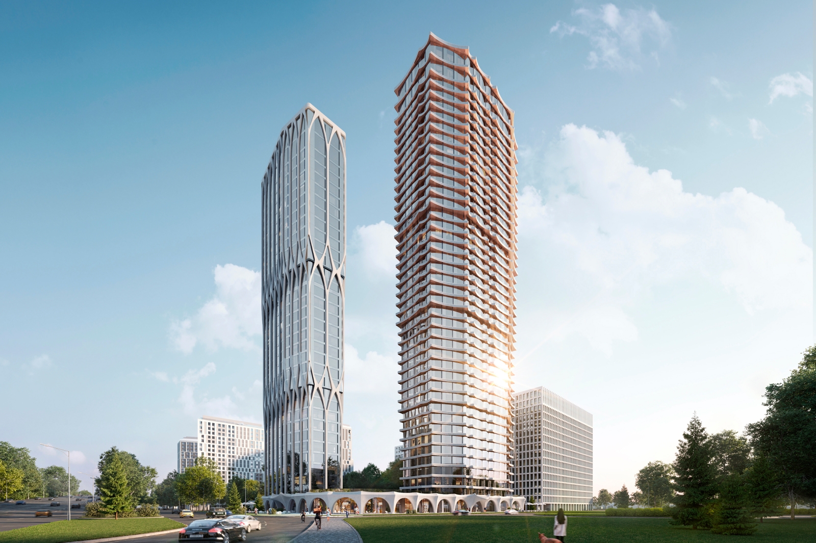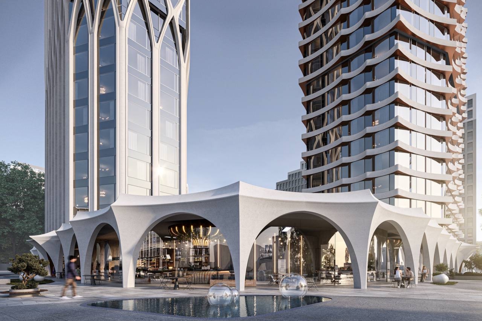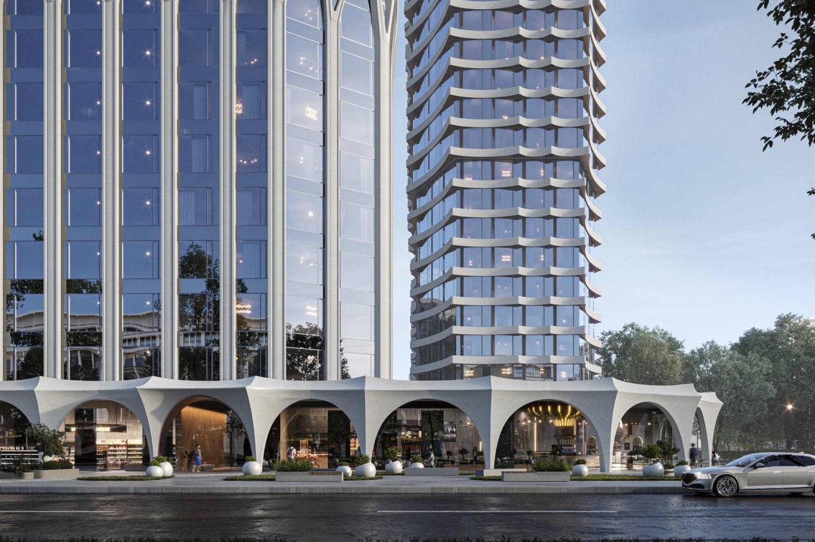 Одноэтажный стилобат, соединяющий обе секции, также оформят крупными светлыми панелями, которые образуют аркаду со скульптурными навесами.