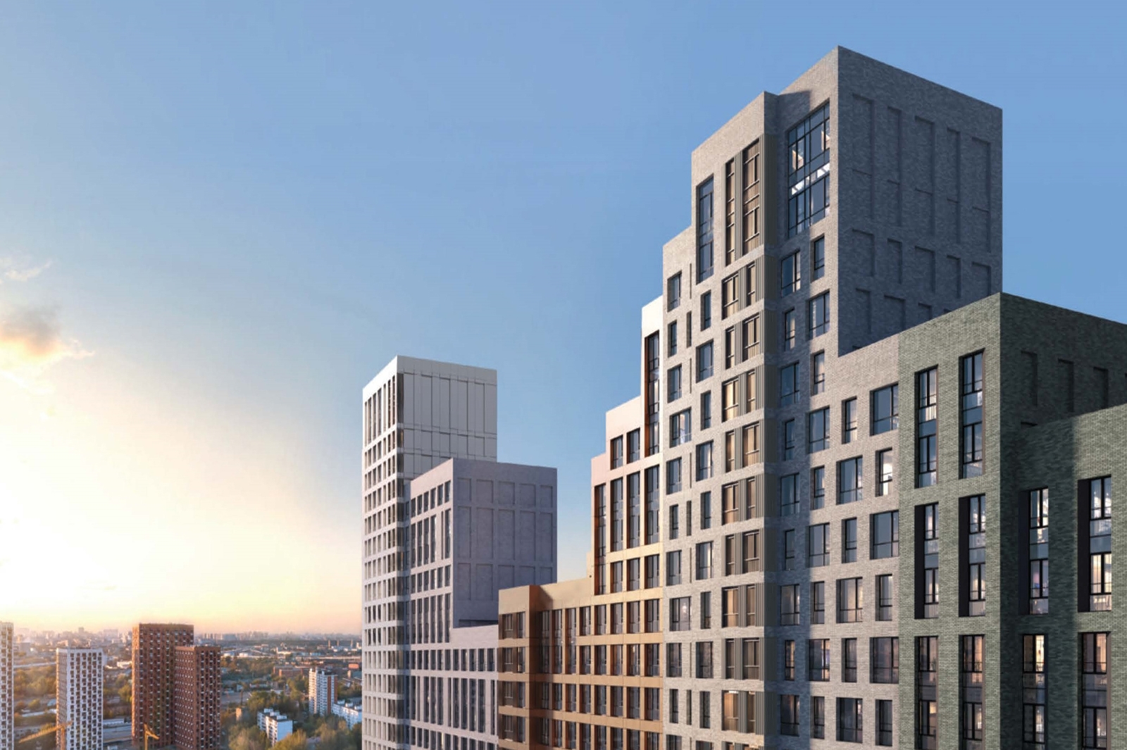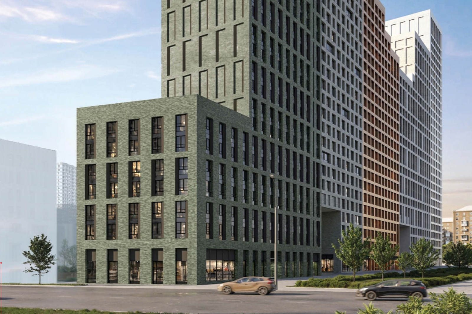 «Общая площадь комплекса с подземным паркингом на 263 машино-места составит более 63,3 тыс. кв. метров. Он рассчитан на 874 квартиры. Для отделки фасадов будут использовать бетонную плитку темно-зеленого и светло-серого оттенков, алюминиевые панели желтого, белого и черного цветов, для оформления отдельных элементов также применят матовый антрацитово-серый стемалит», – сказал Сергей Кузнецов.