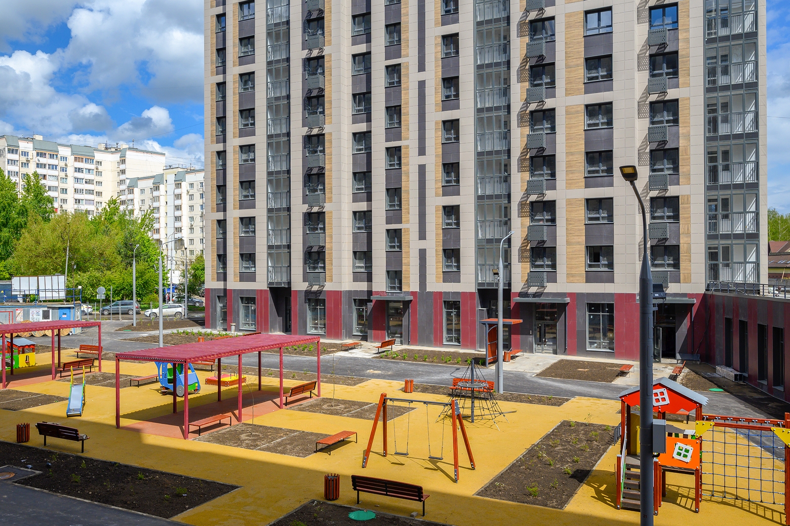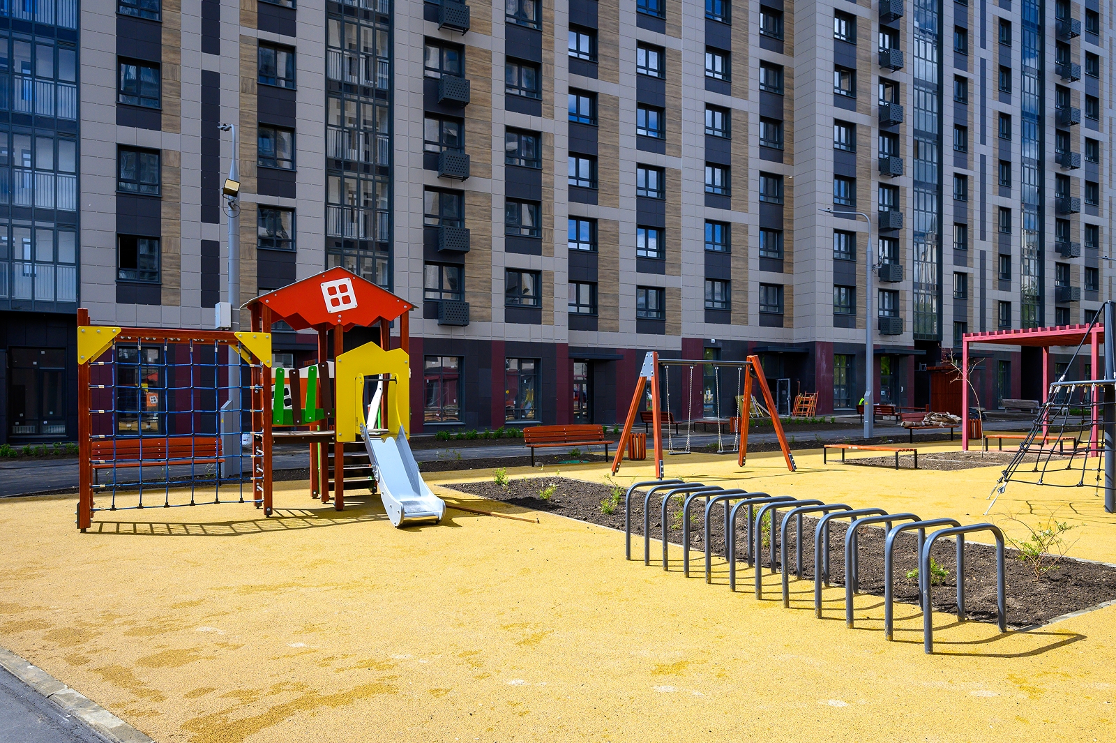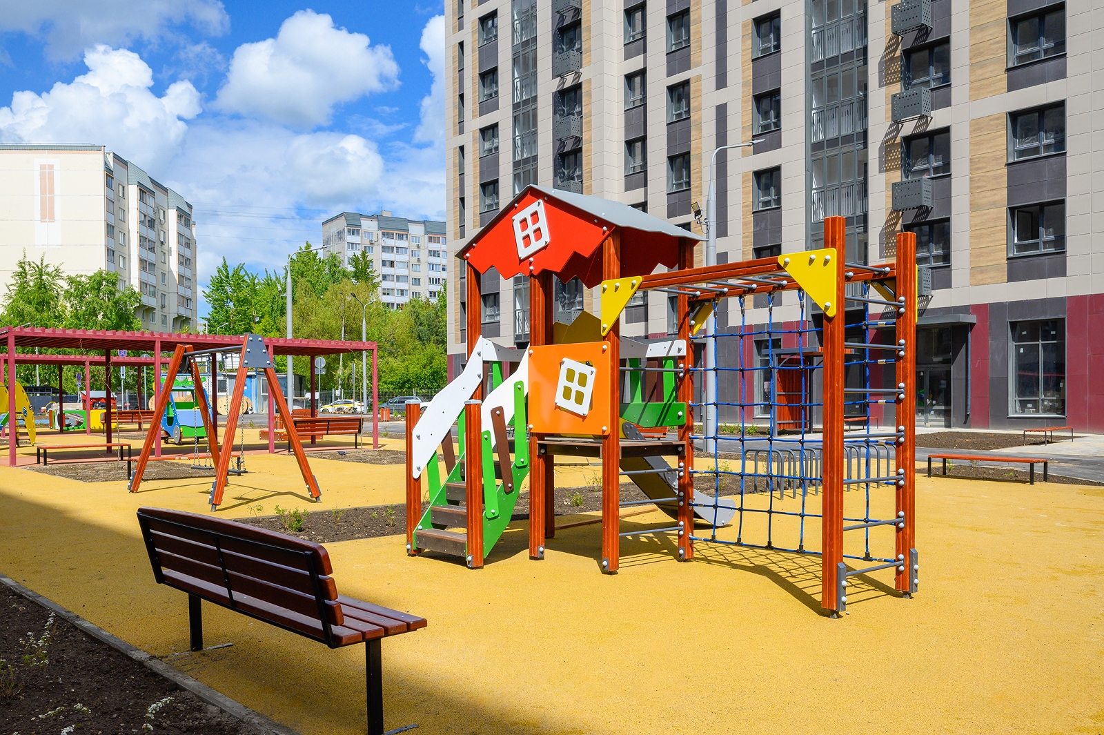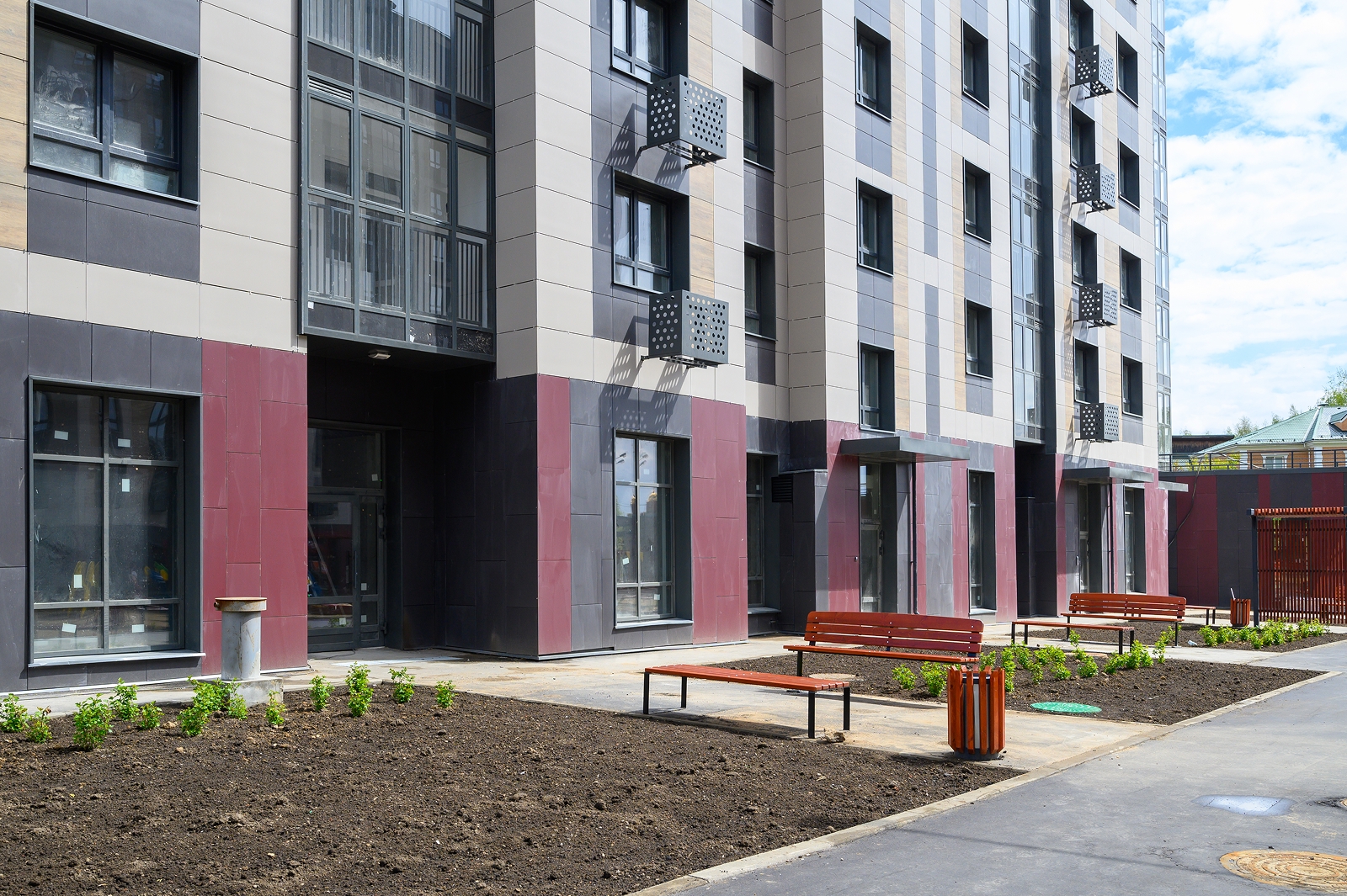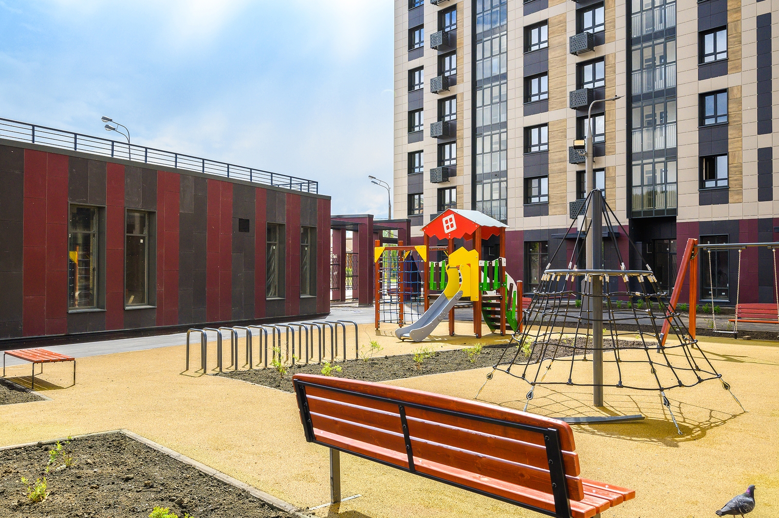 Во дворе жилого комплекса провели комплексное озеленение, оборудовали спортивную, а также детскую площадку с безопасным покрытием, зоны отдыха.