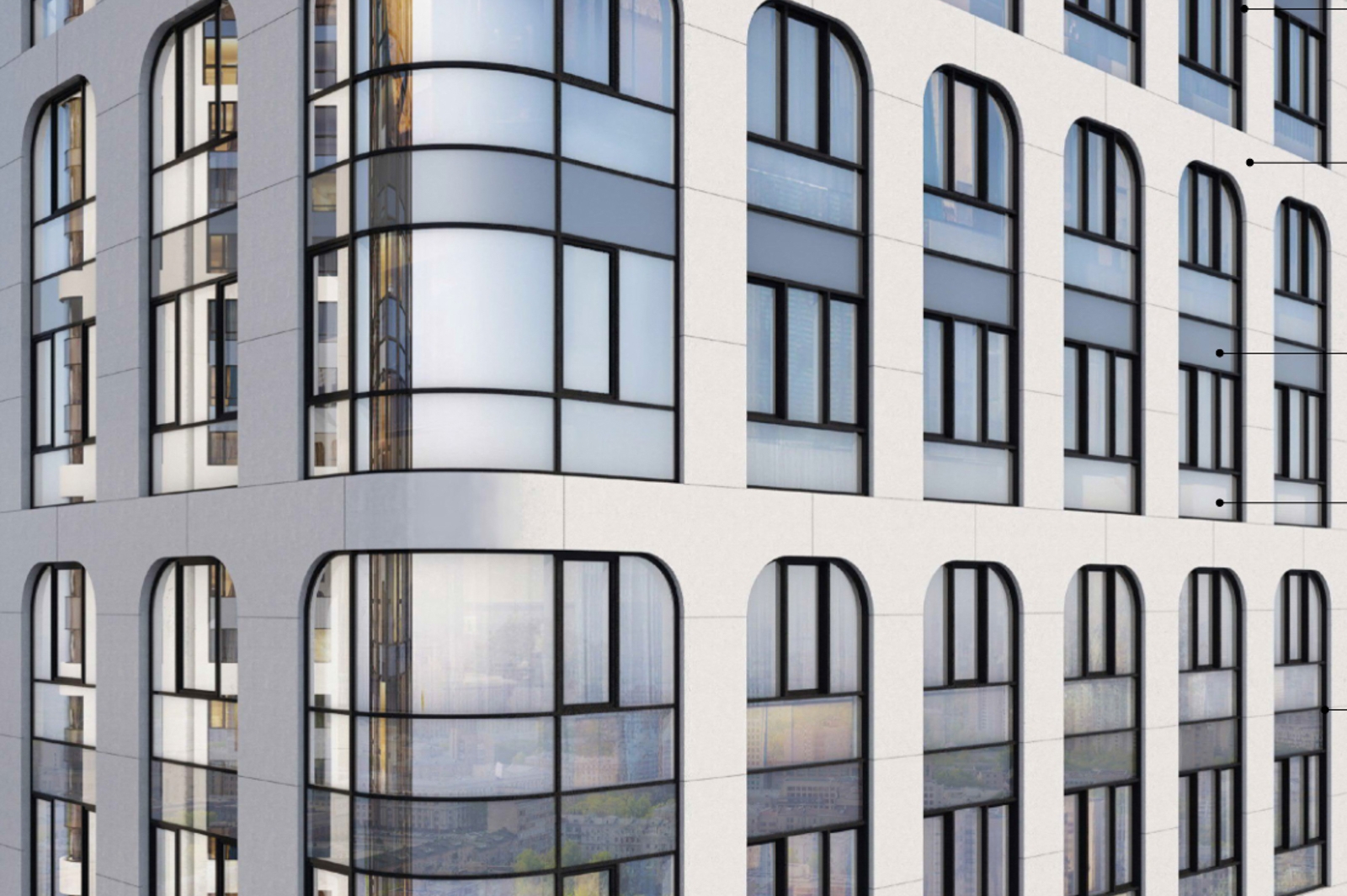 «Для отделки фасадов используют матовый стеклофибробетон и металлические кассеты светлого цвета. Верхнюю часть комплекса оформят широкими арочными проемами. Общественная зона расположится на кровле стилобата», – пояснил Сергей Кузнецов.