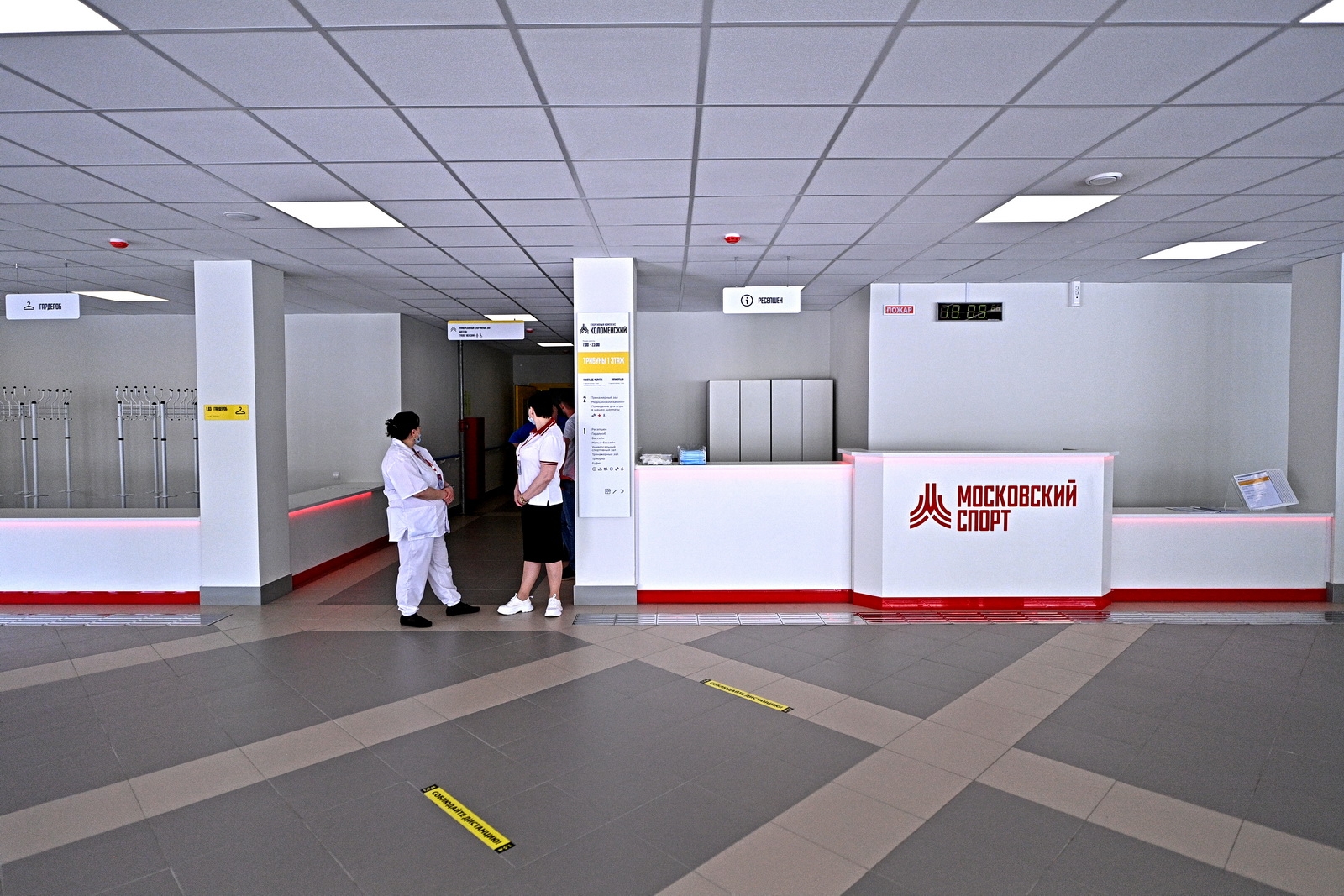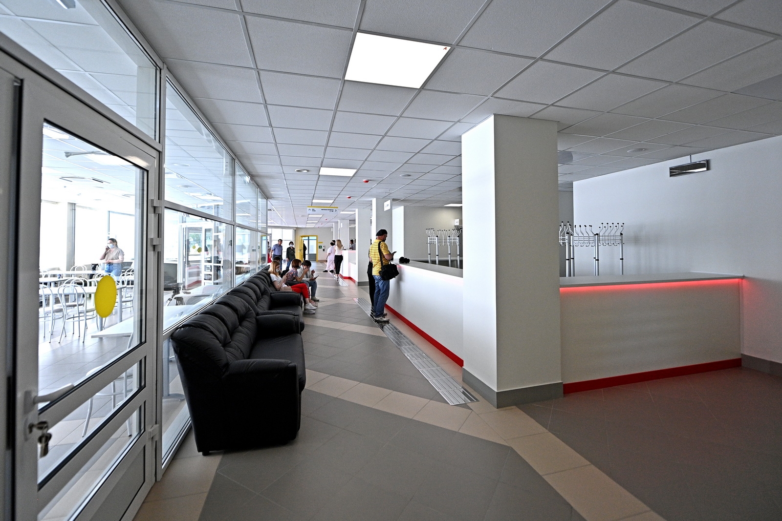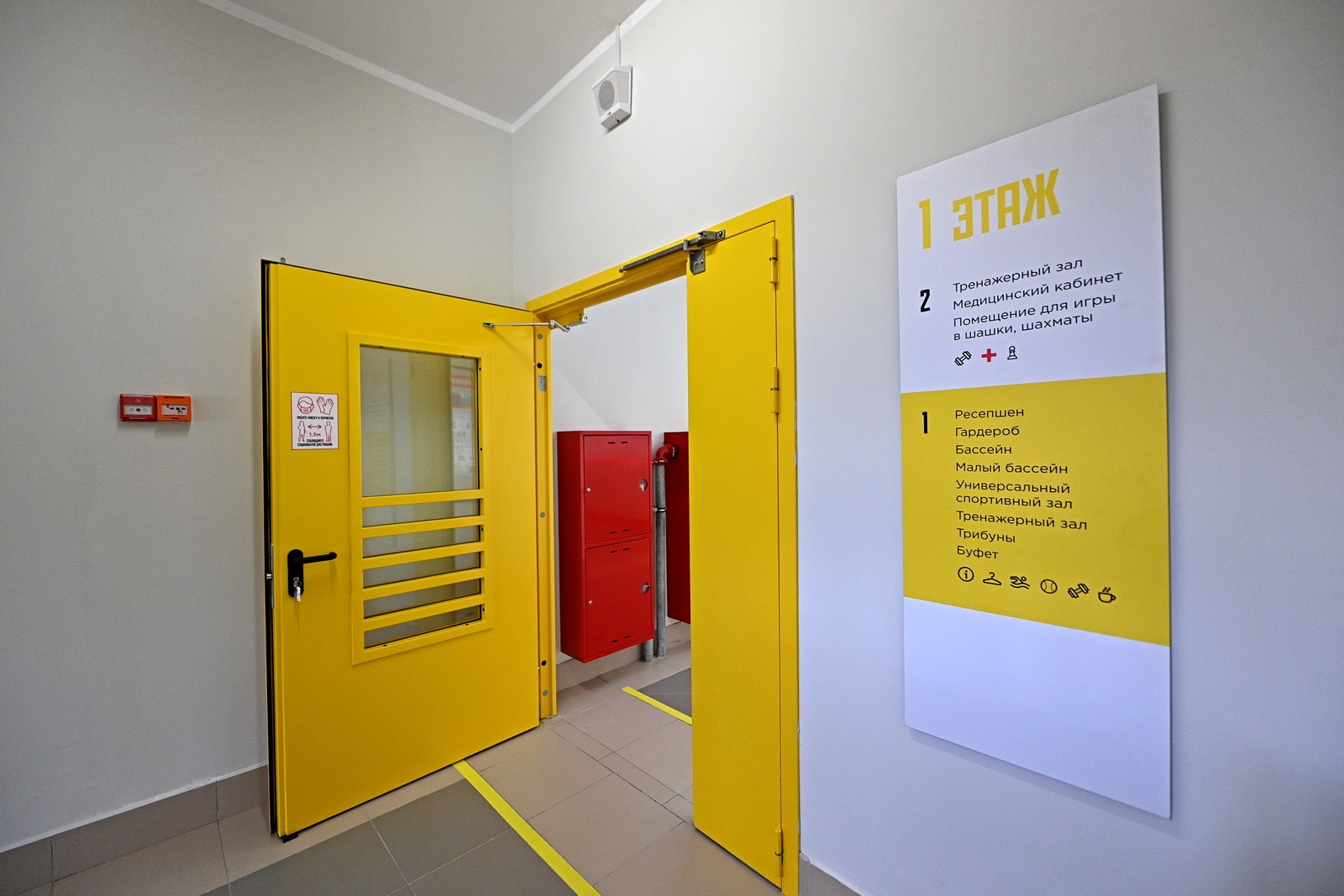 У входа расположена зона для мойки инвалидных колясок, а в самом здании в навигации преобладает желтый цвет. Он используется для обозначения объектов для маломобильных людей.