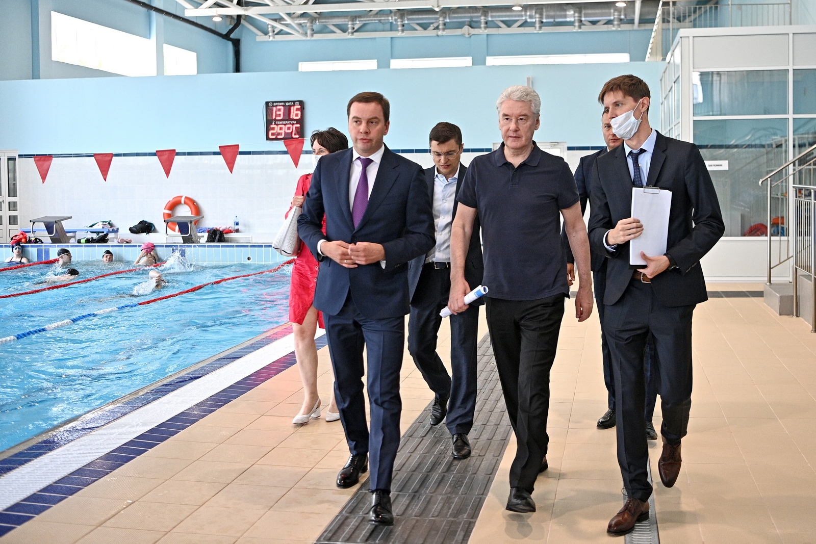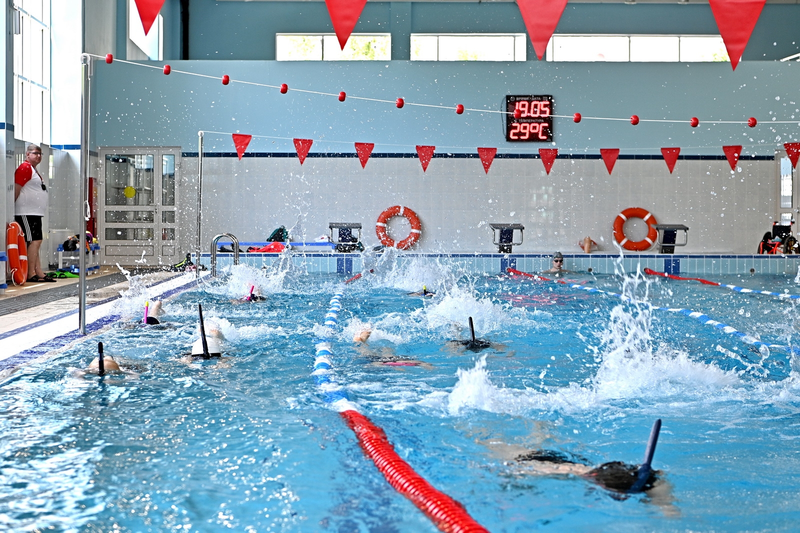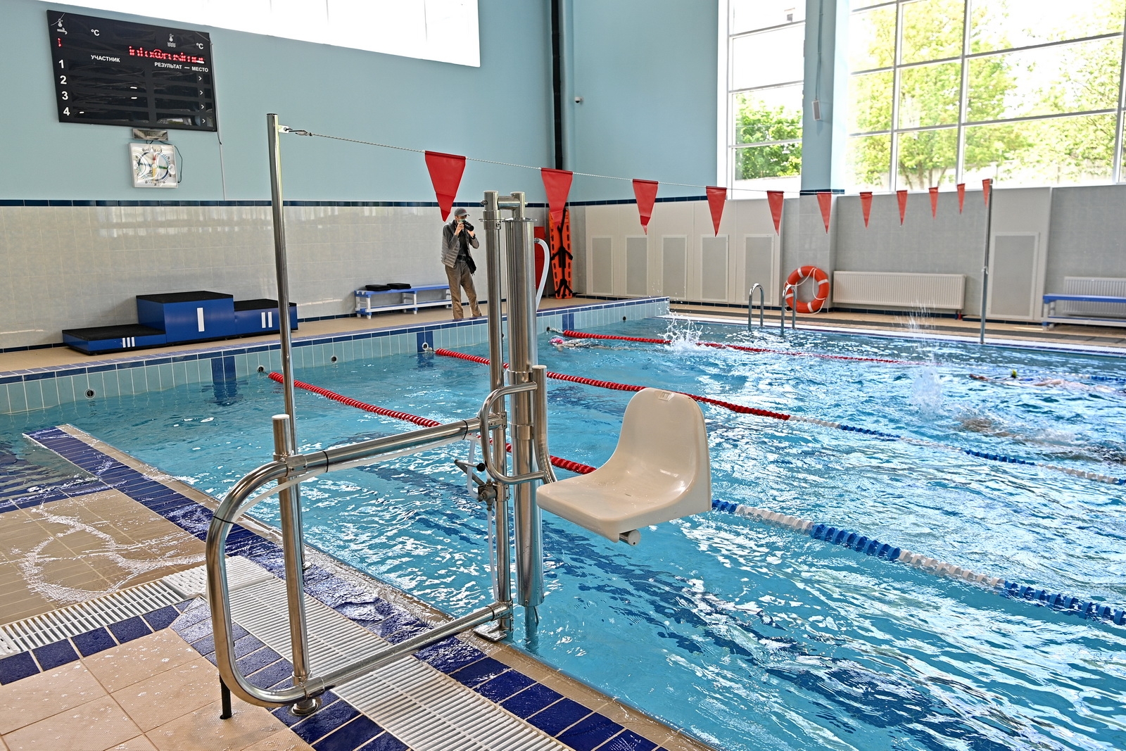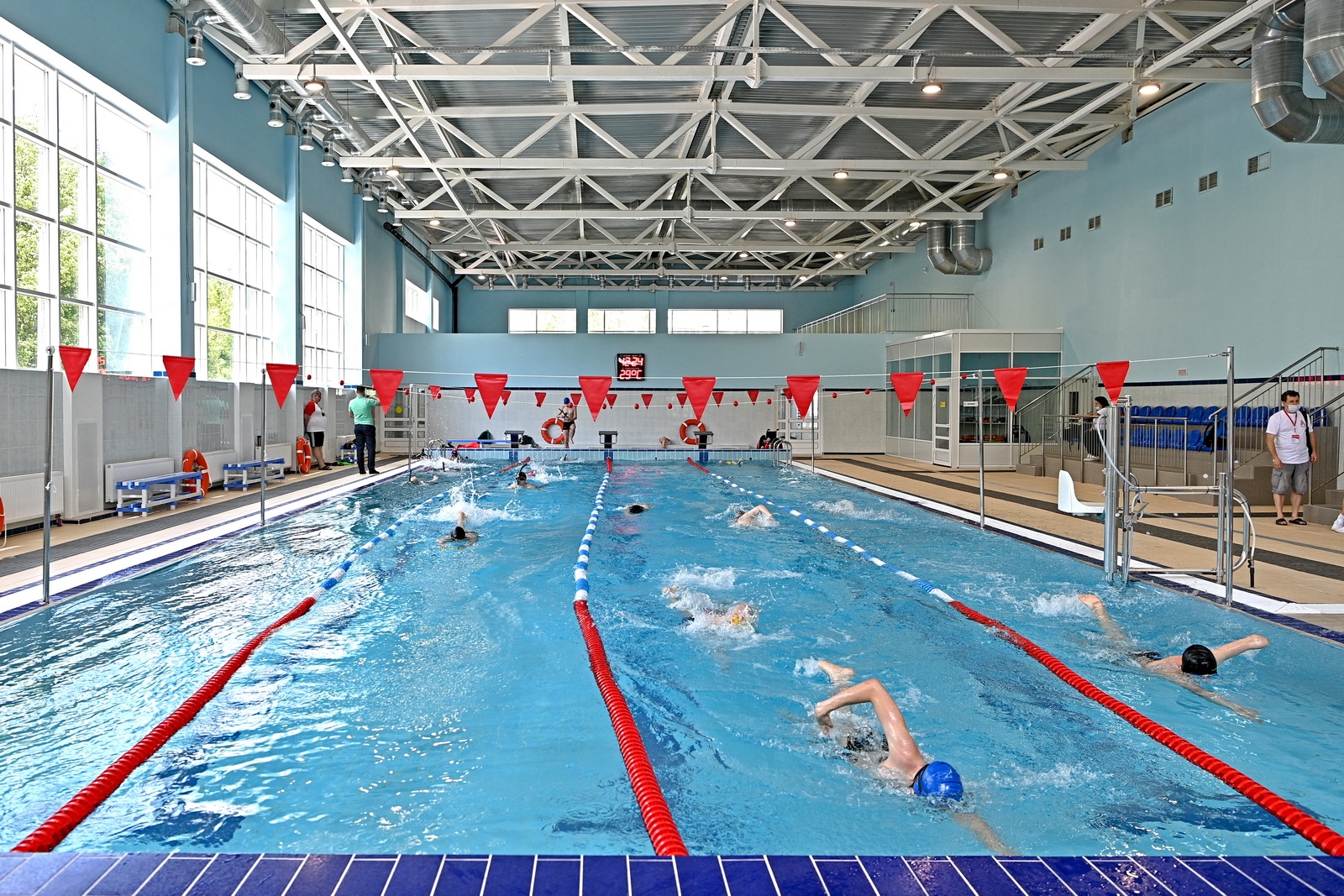 У крытого бассейна установлены трибуны на 56 мест, оборудованы раздевалки, кабинеты массажа и медицинского работника.