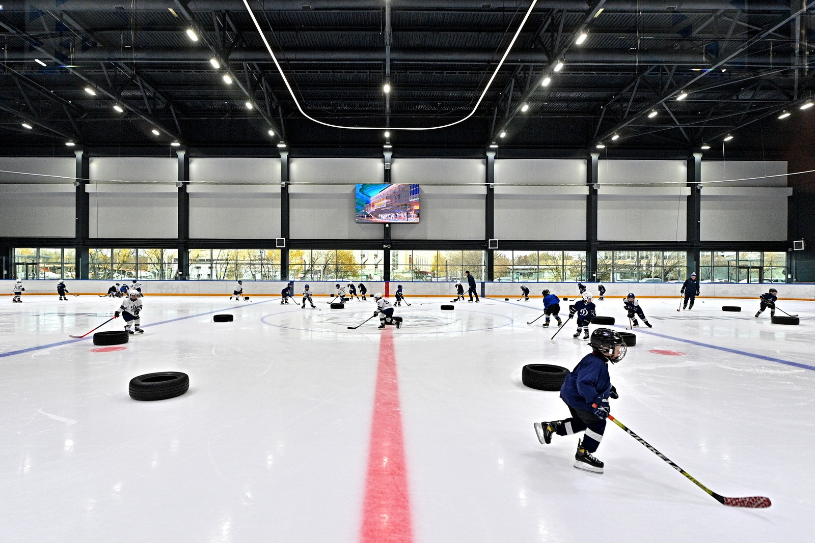 В здании находятся ледовая арена с двумя площадками – олимпийского и североамериканского стандартов. Для зрителей обустроены трибуны на 210 и 126 мест. Идеальное ледовое покрытие на обеих площадках станет залогом успешных тренировок профессионалов. Также есть прокат коньков с пунктом заточки.
