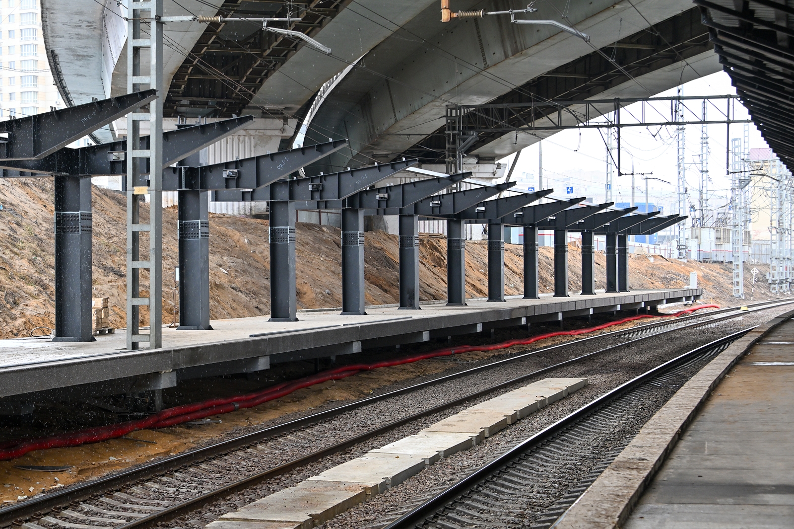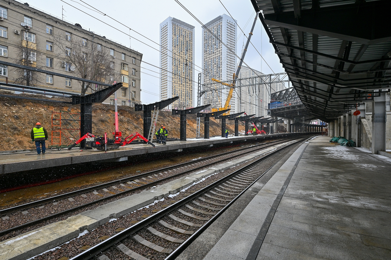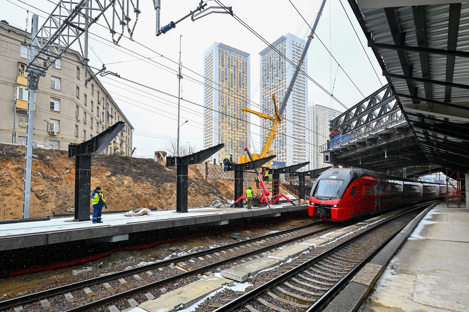 Работы ведутся в условиях плотной городской застройки и интенсивного автомобильного трафика, при этом движение поездов не прекращается. Для пассажиров возвели временные объекты – платформу и пешеходный мост через пути МЦД-1 и МЦД-4.
