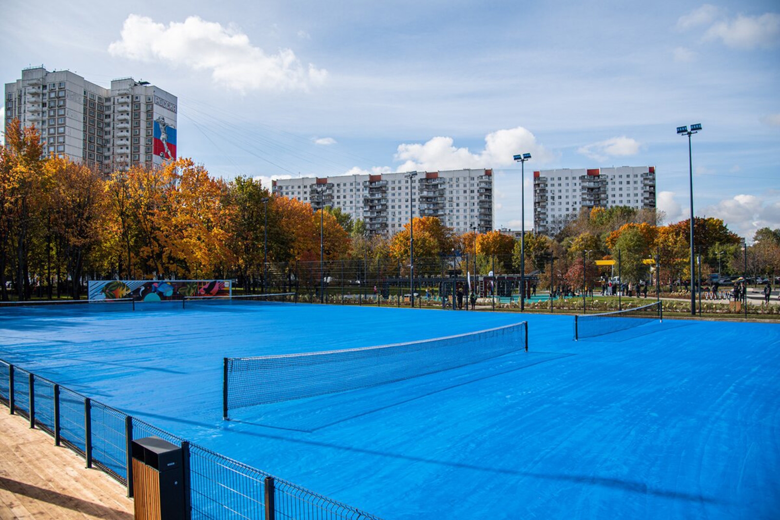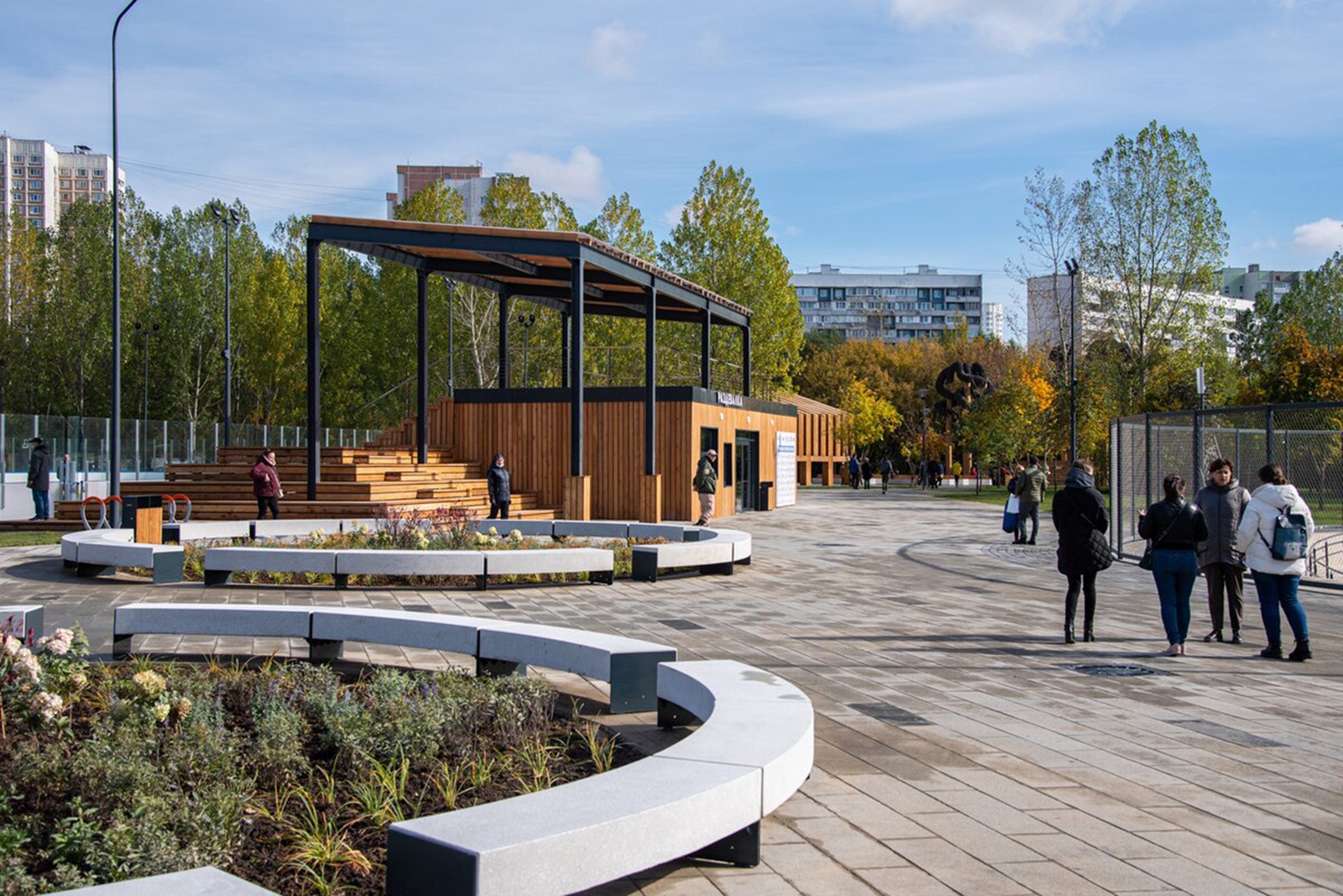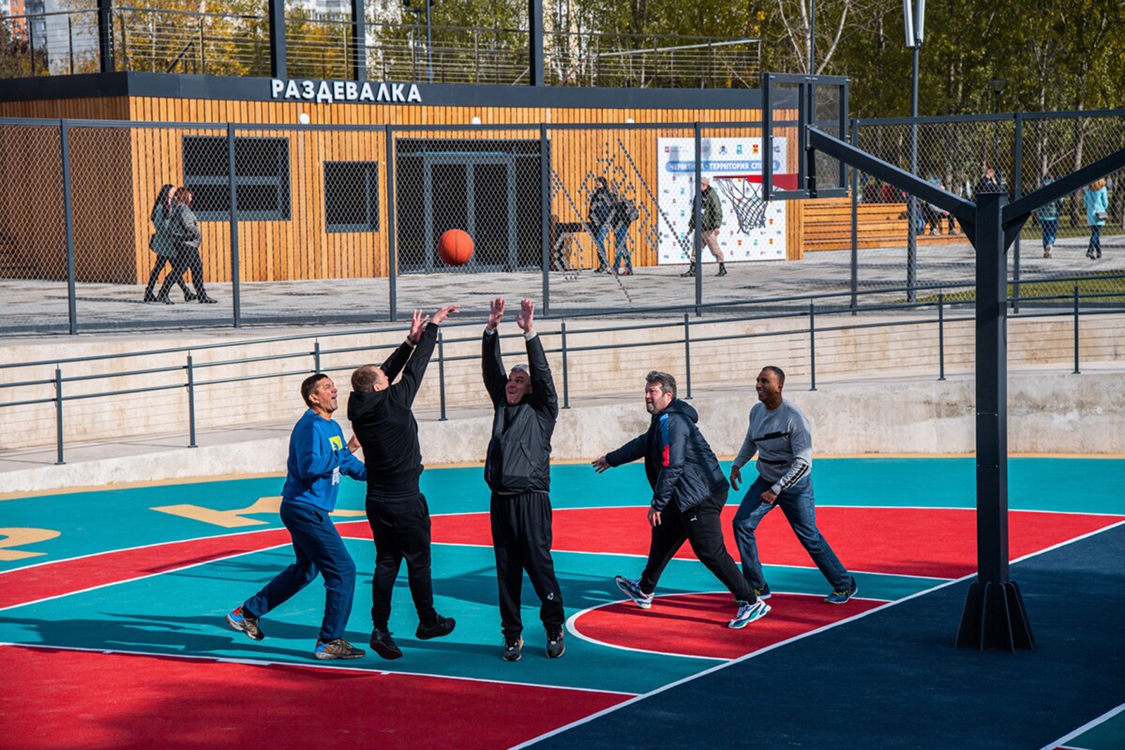 В зоне стритбола разместились трибуны в виде амфитеатра. Хоккейную площадку с искусственным льдом и местами для зрителей в летнее время можно будет использовать для игры в мини-футбол.
