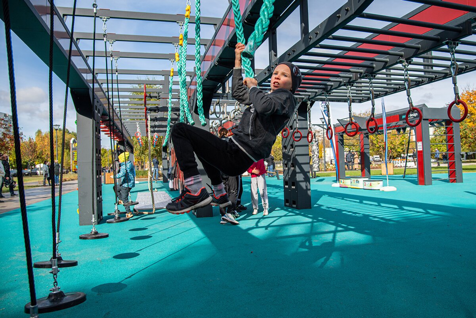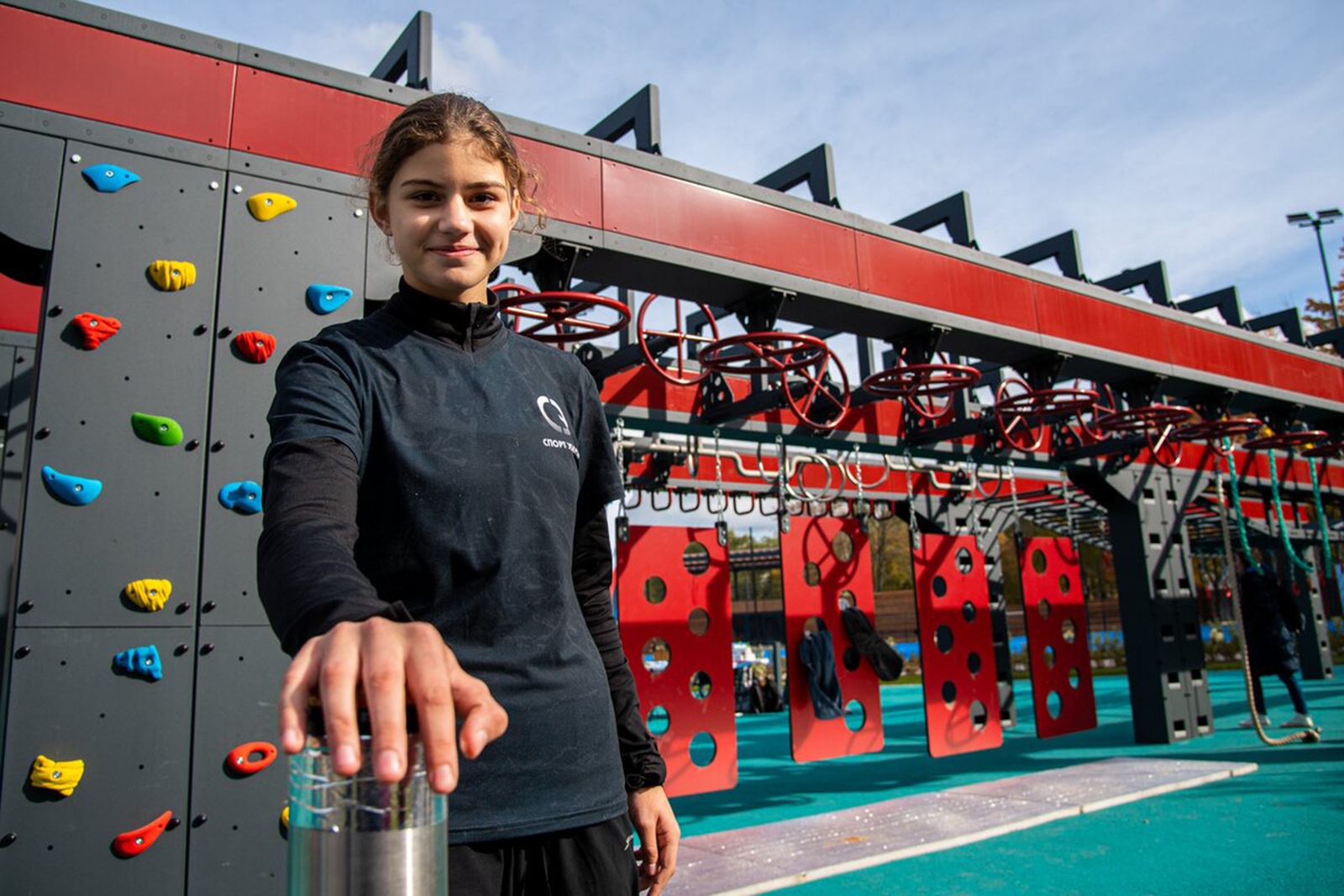 Уникальная спортивная рама длиной 24 метра для занятий по дисциплине «Русский ниндзя» с шестью вариантами маршрутов в зависимости от сложности препятствий расположилась на воркаут-площадке.