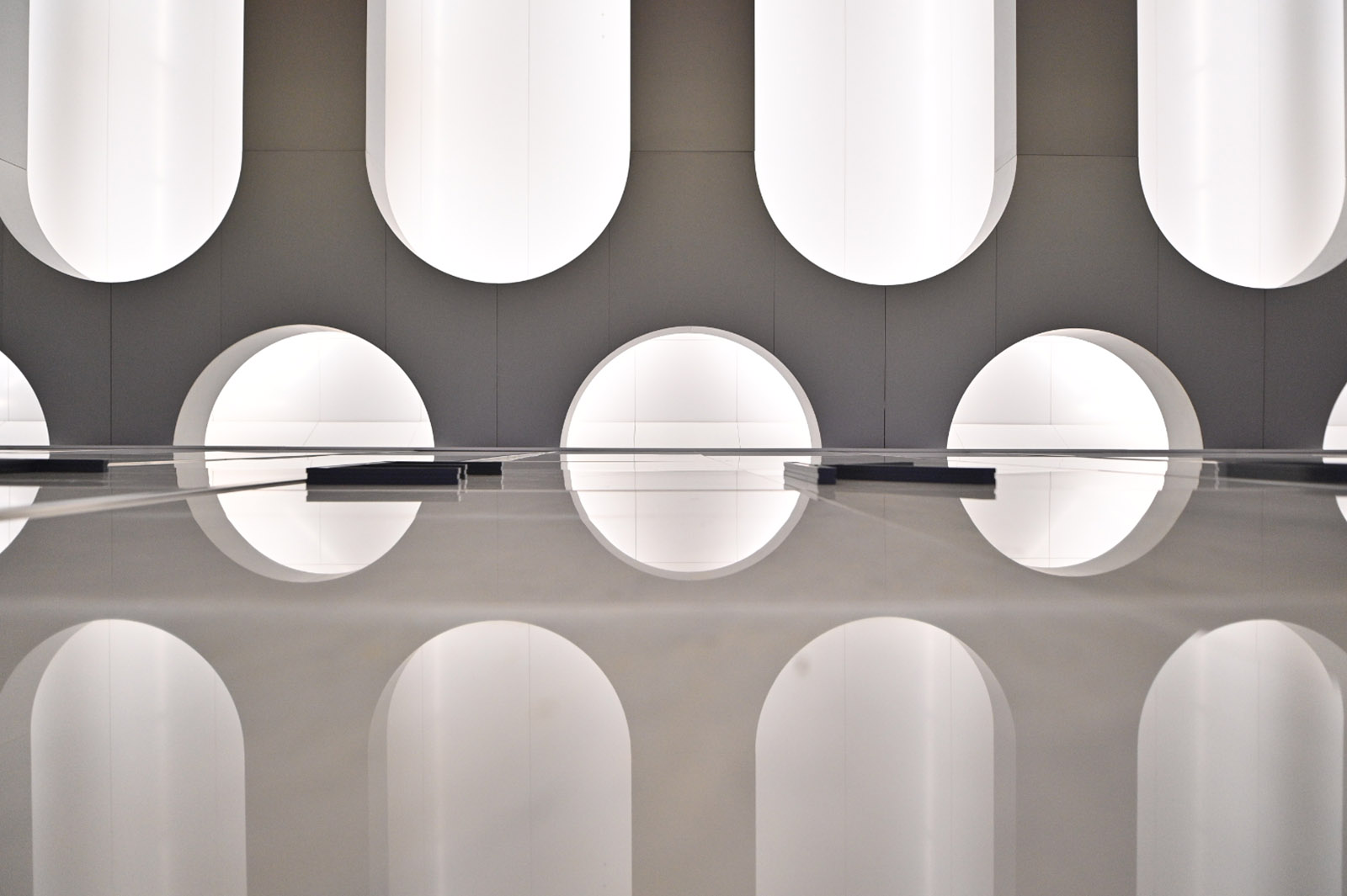 Платформа с органичной пластикой свода потолка создает узнаваемый силуэт, характерный для традиционных элементов русского зодчества, визуально удваиваясь в зеркальной части отделки стен.