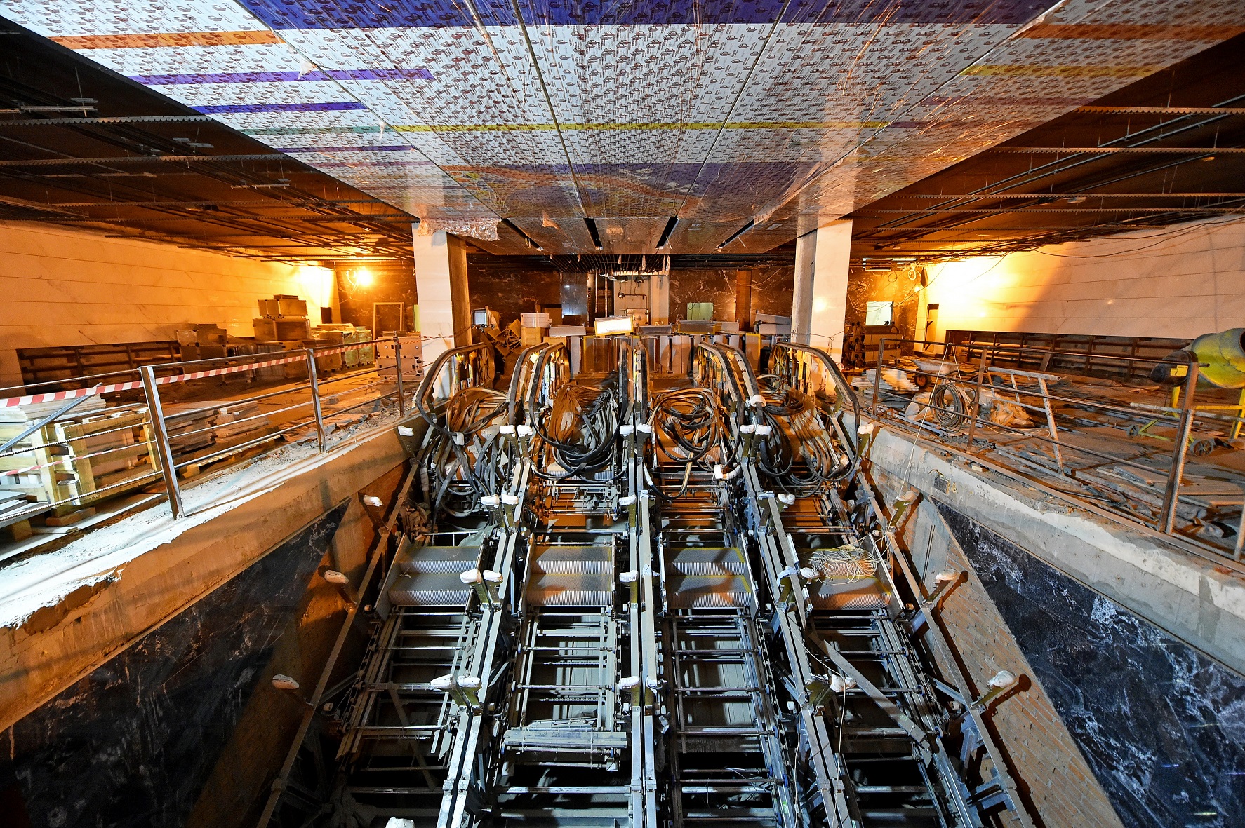 Так будет выглядеть вестибюль станции. Сейчас яркая отделка спрятана от пыли и грязи.