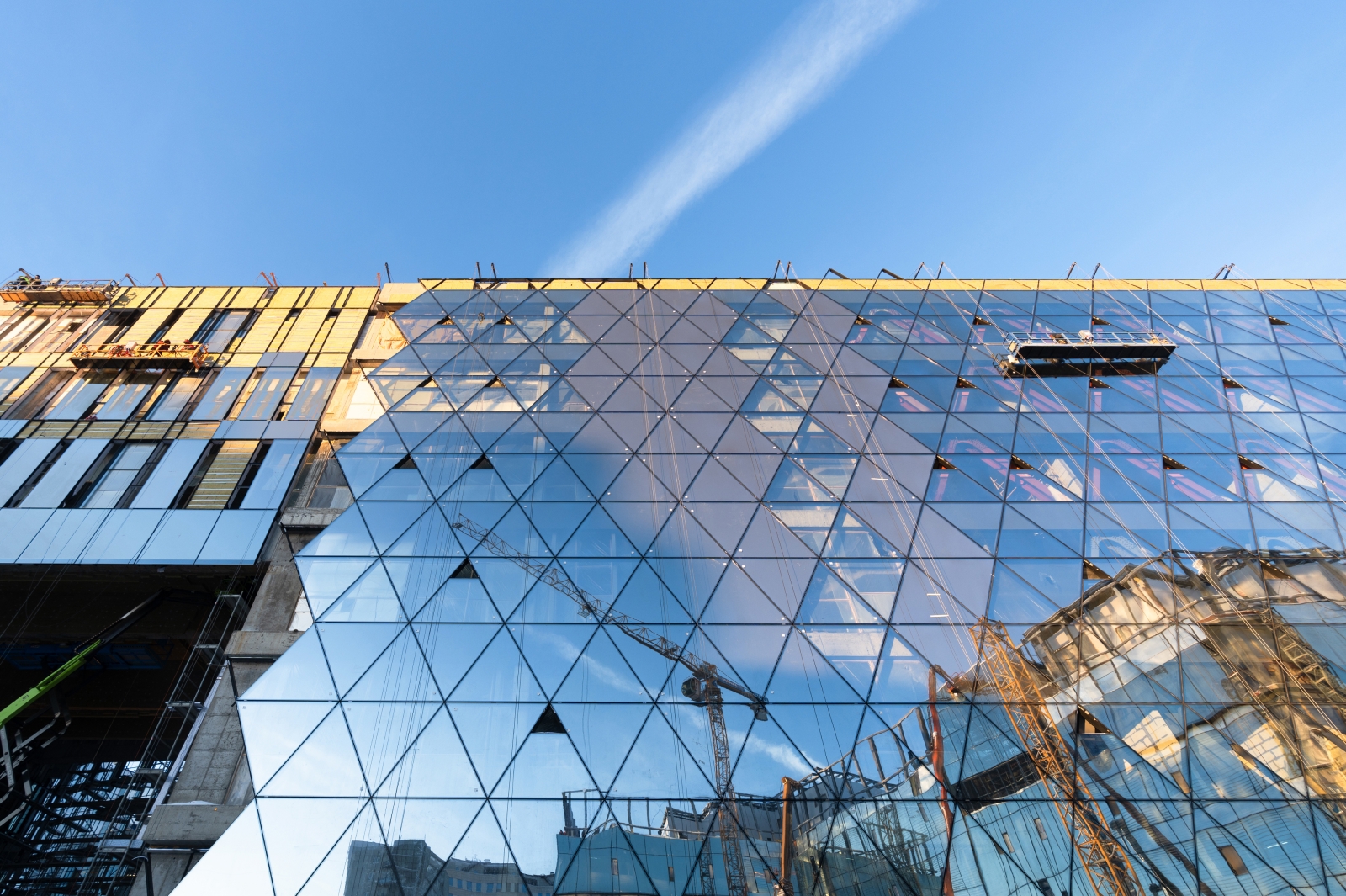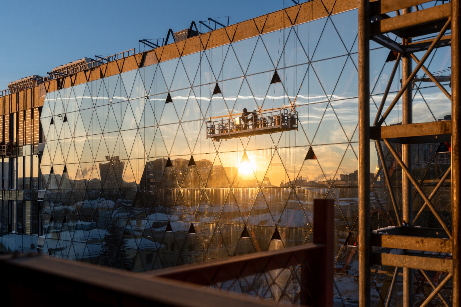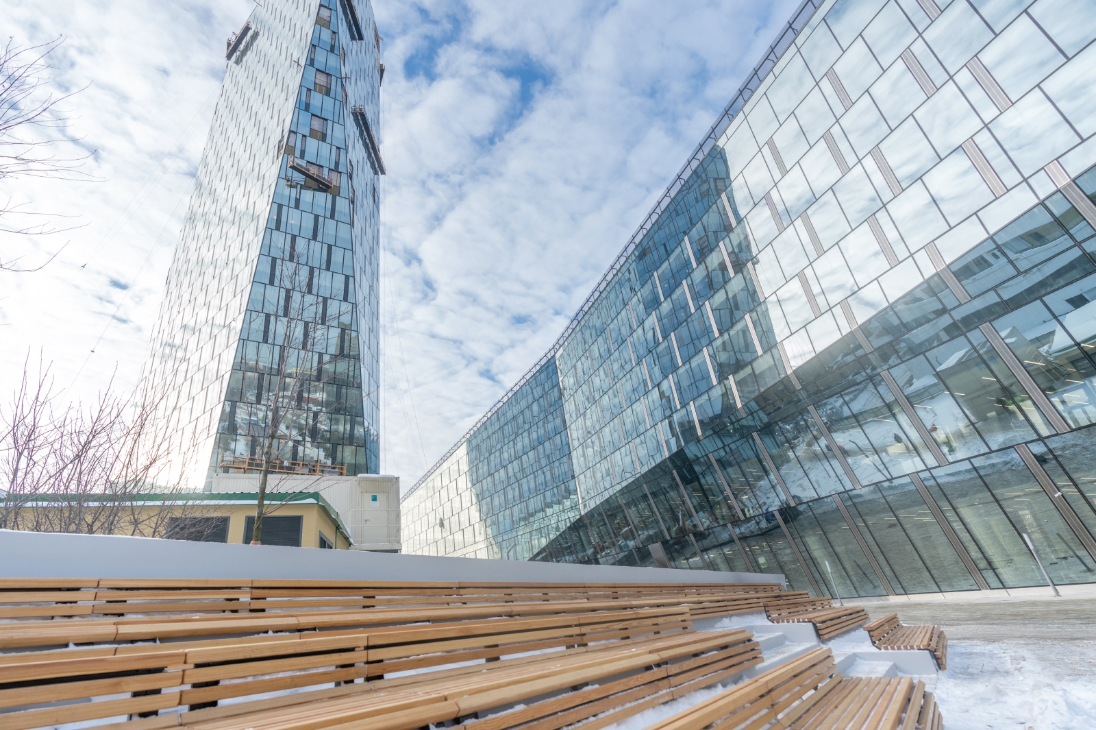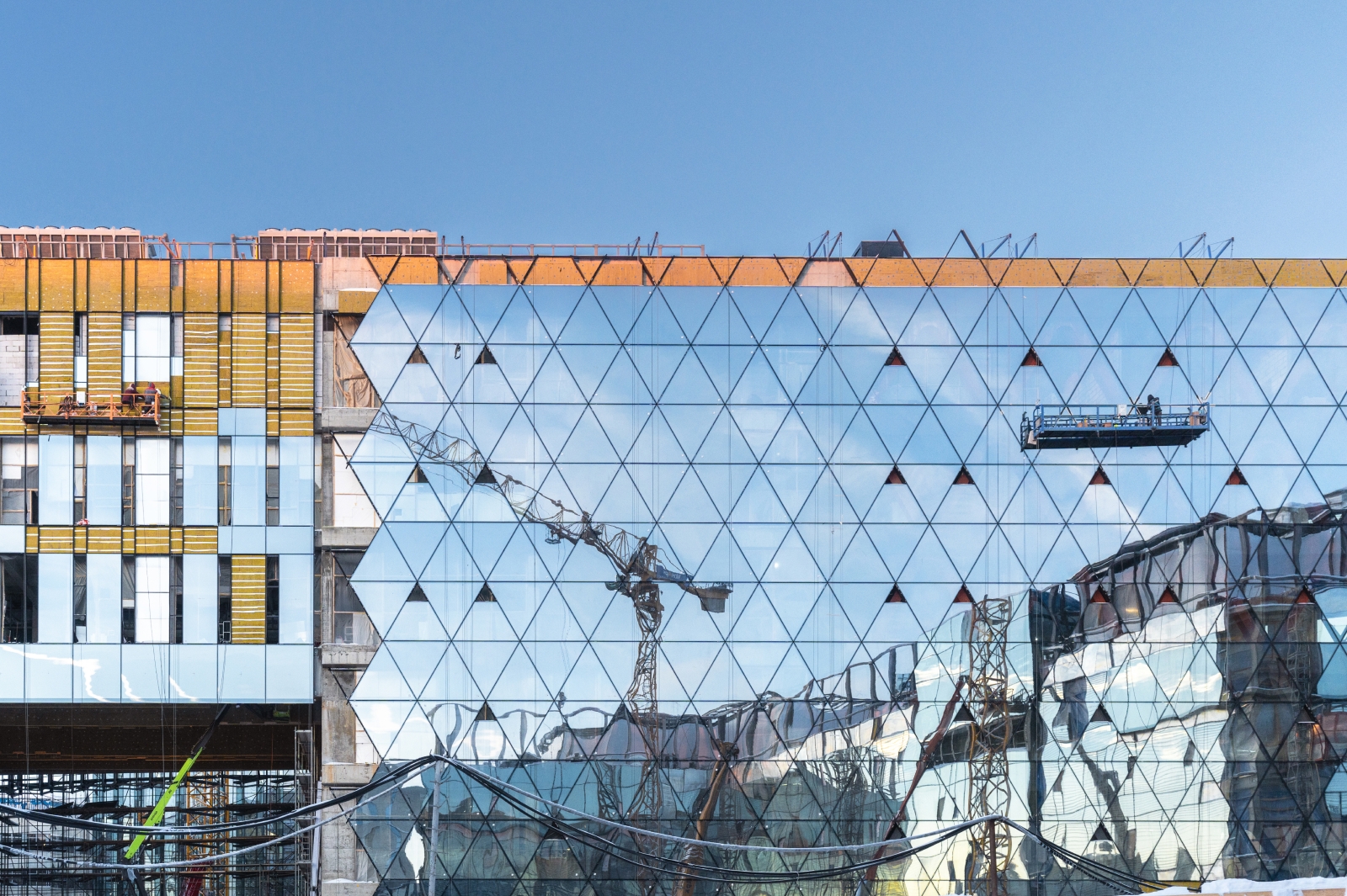 Также к завершению близится строительство центрального кластера, который будет состоять из пяти зданий высотой 4-6 этажей. Архитекторы решили украсить фасадное стекло научными формулами, чтобы визуально разделить пространство.
