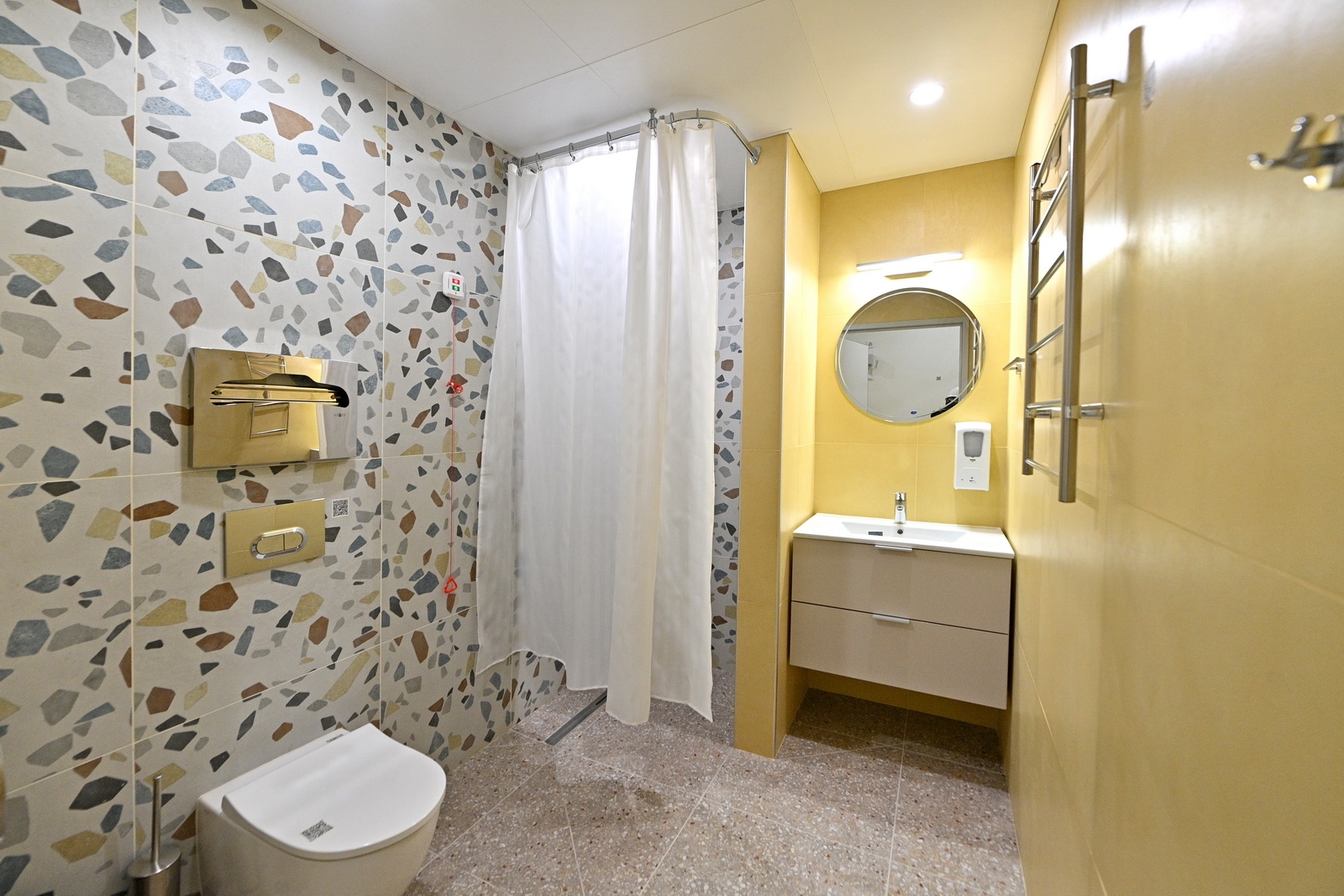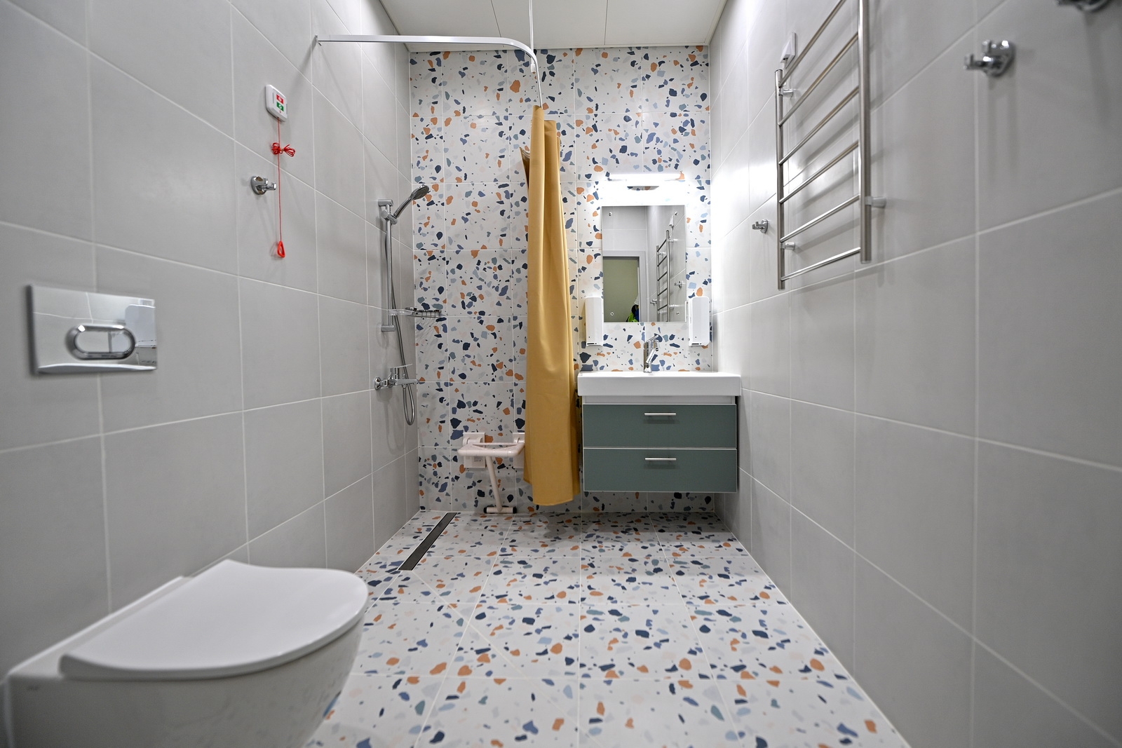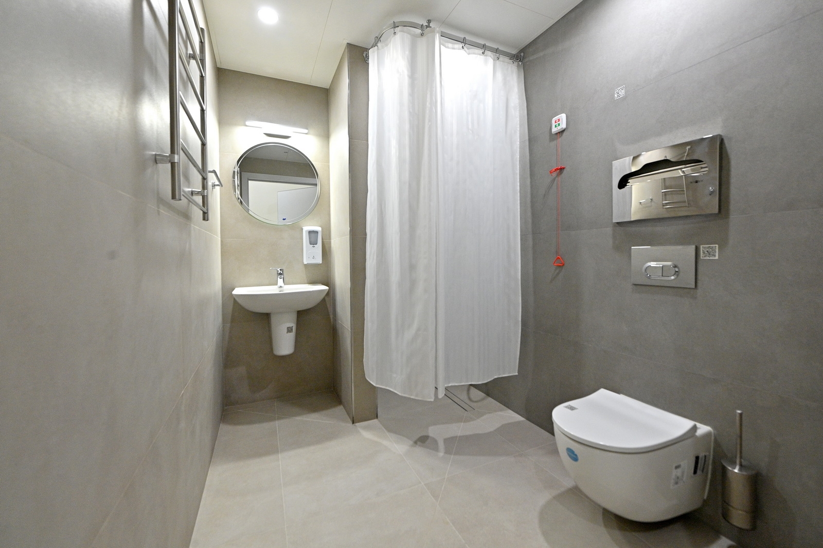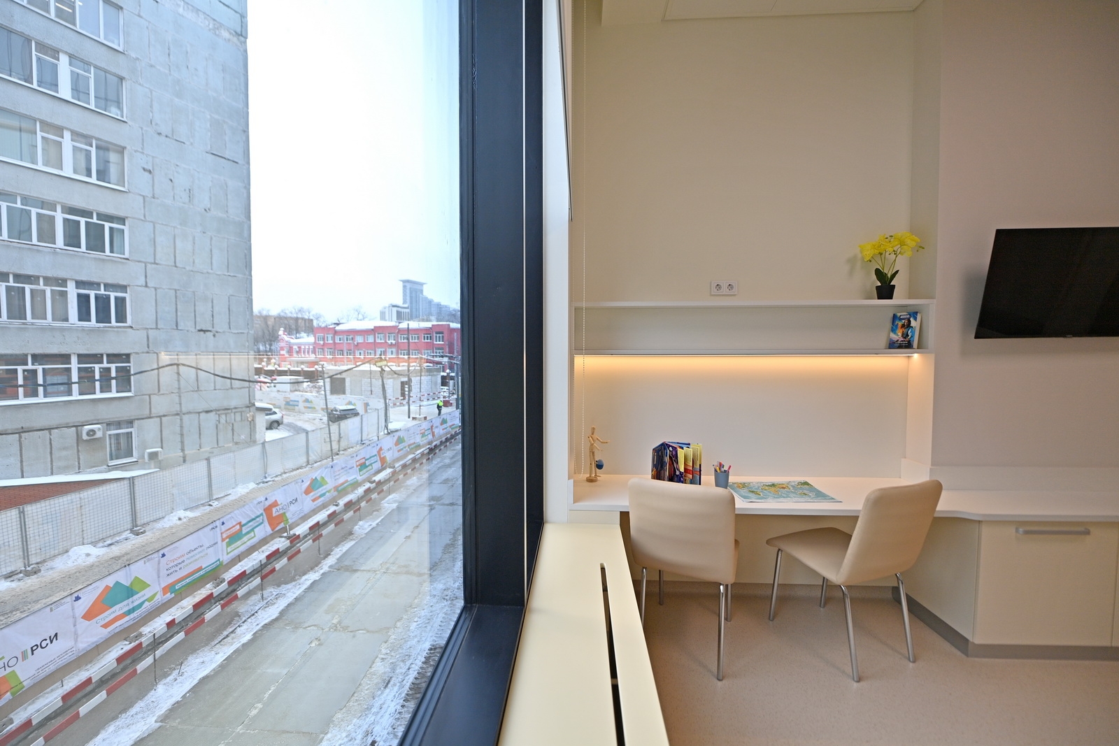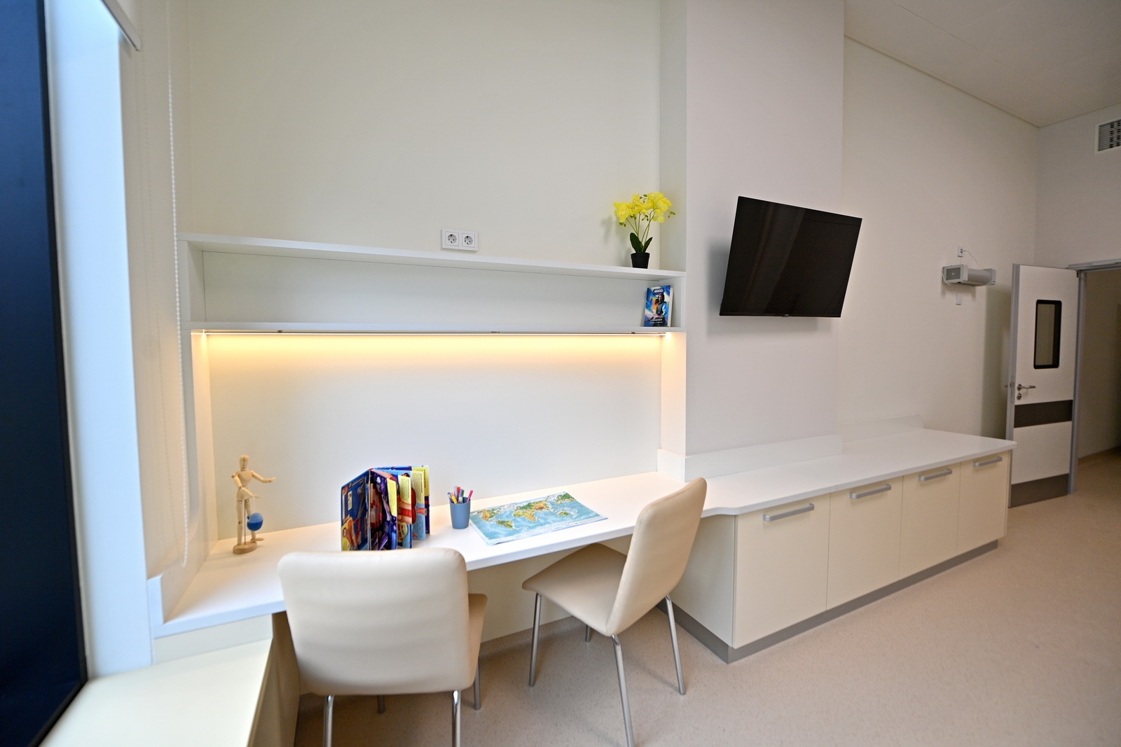 В каждой палате предусмотрены ванная комната с душем, телевизор, зона для уроков или дополнительных занятий.