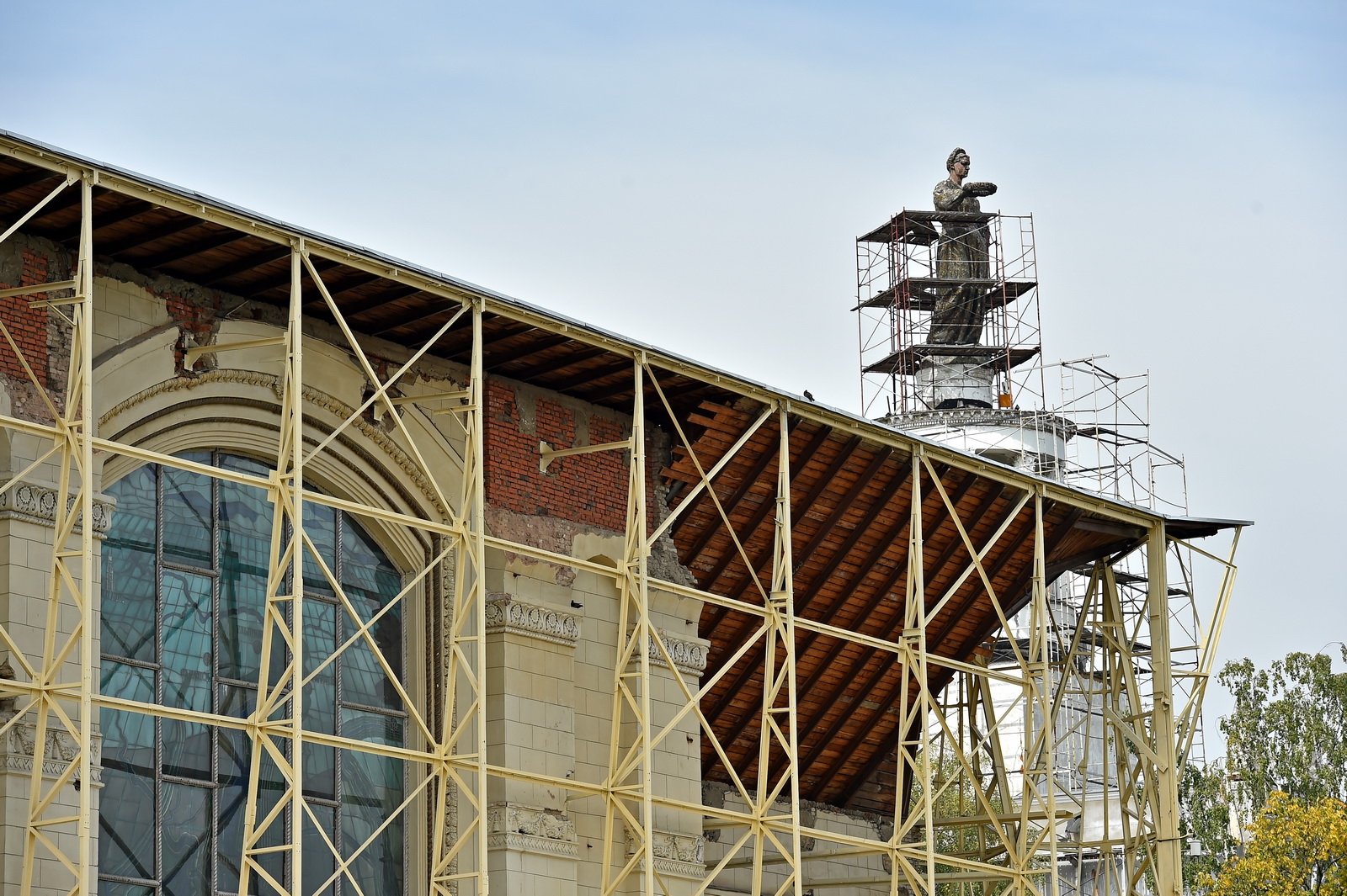 Арку с боковыми корпусами построили в 1954 году по проекту архитектора И.Д. Мельчакова. Сейчас реставрация на ее фасадах уже завершена. Здесь обновили пилоны и кессонированные потолки центральной арки. Восстановили покрытие золотой смальты центральной скульптурной группы «Тракторист и колхозница».