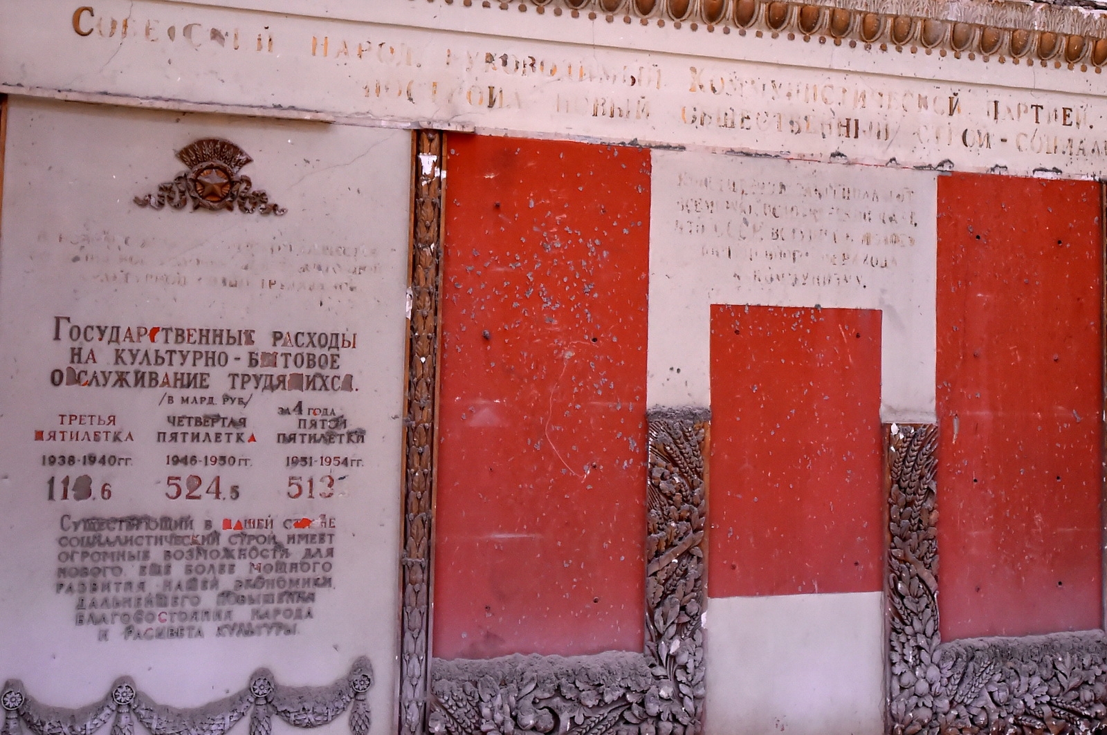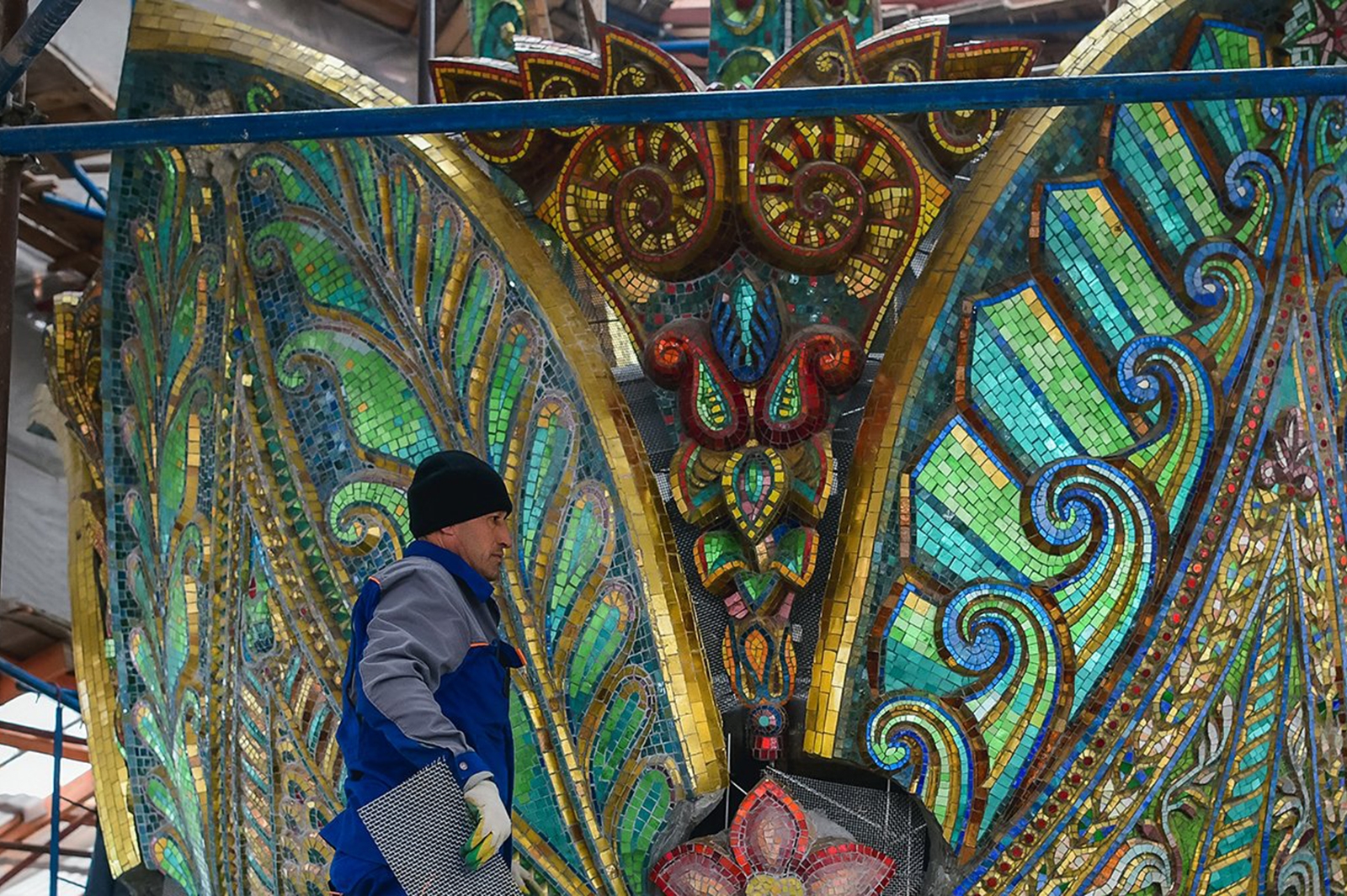 Когда специалисты сняли его в рамках комплексной реставрации, им открылись стены, украшенные этническими майоликовыми узорами и советской символикой.