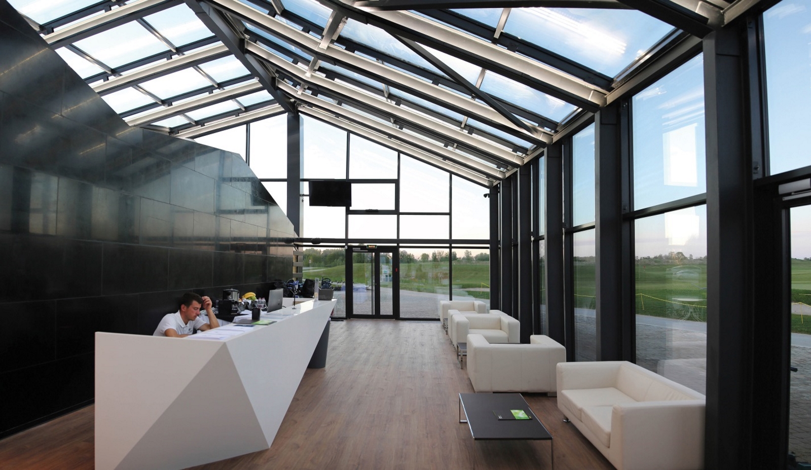 Часть здания со стороны поля полностью остеклена, включая кровлю, для создания эффекта максимального взаимодействия с природой.