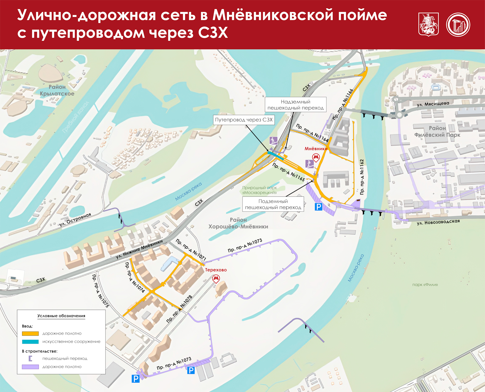 Кроме того, в Мнёвниковской пойме открылись новые дороги, в том числе путепровод через основной ход Северо-Западной хорды (СЗХ).