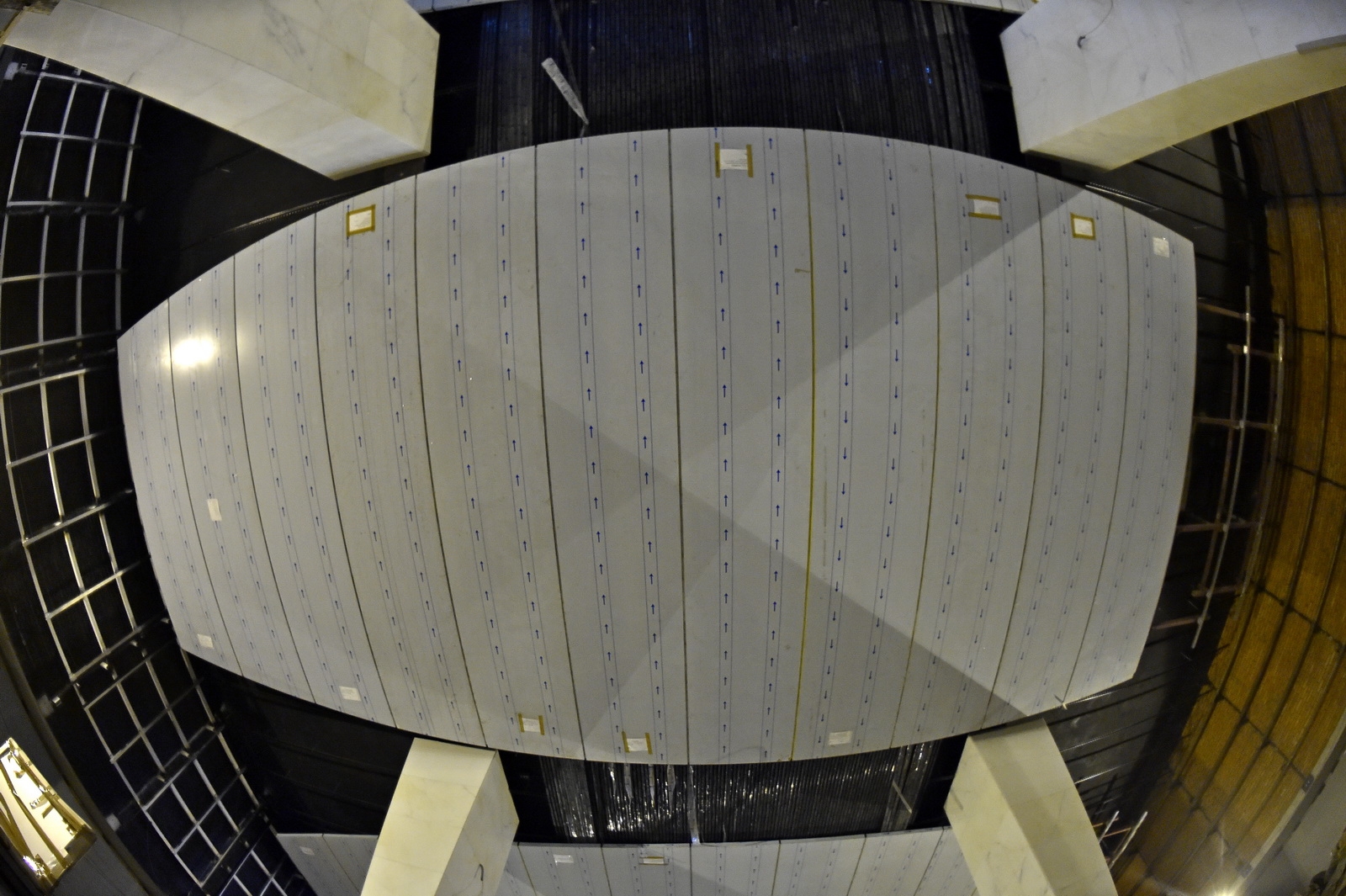 Пол и стены выполнены из гранита и мрамора в светло-серых тонах. Белый светоотражающий подвесной потолок визуально расширяет пространство станции.
