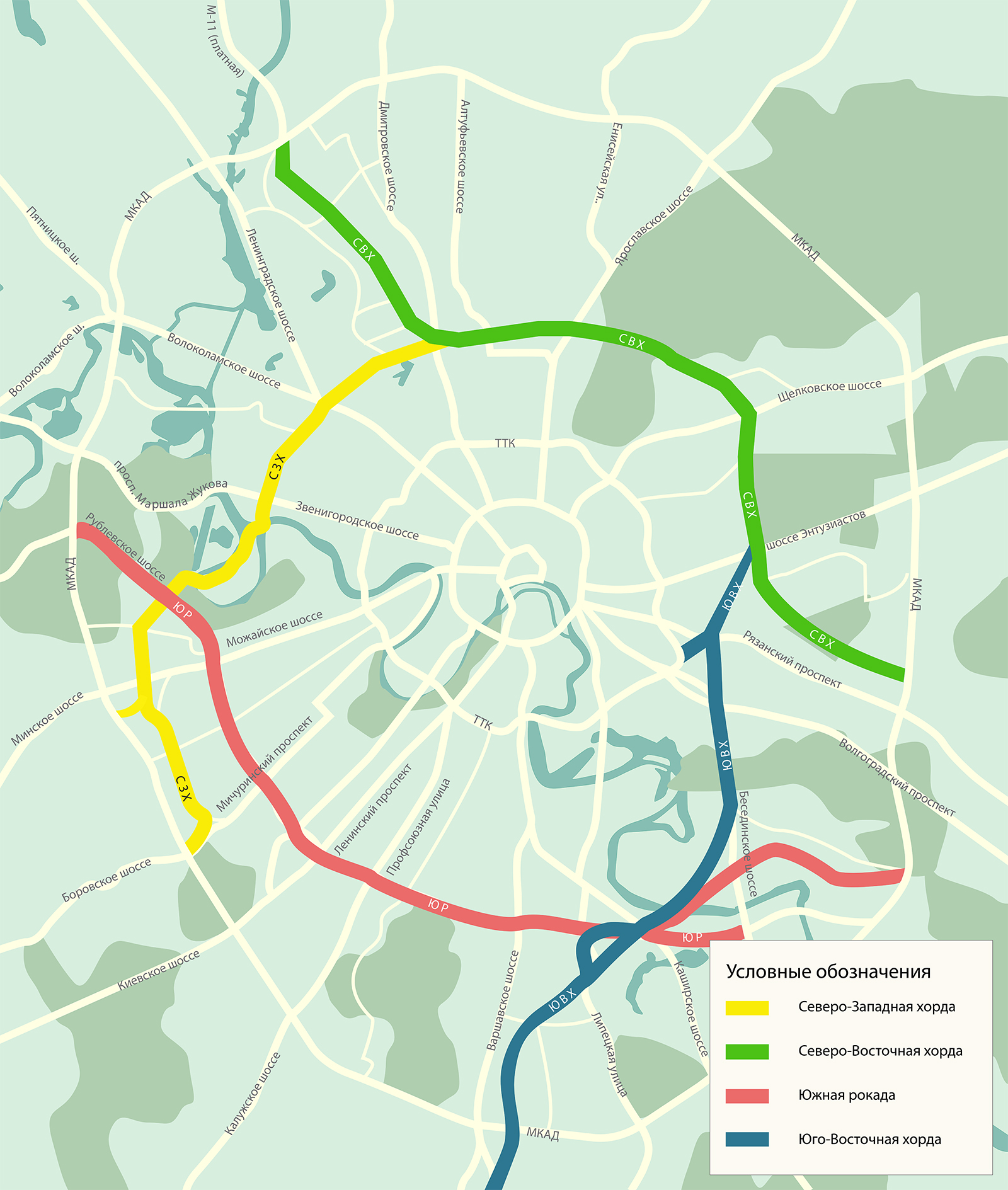 Хорда пройдет через 10 районов Москвы, пересечет Рязанский проспект, Волгоградский проспект, Каширское шоссе, Липецкую улицу, Варшавское шоссе, пройдет через 35-й км МКАД и выйдет на магистраль Солнцево – Бутово – Варшавское шоссе.