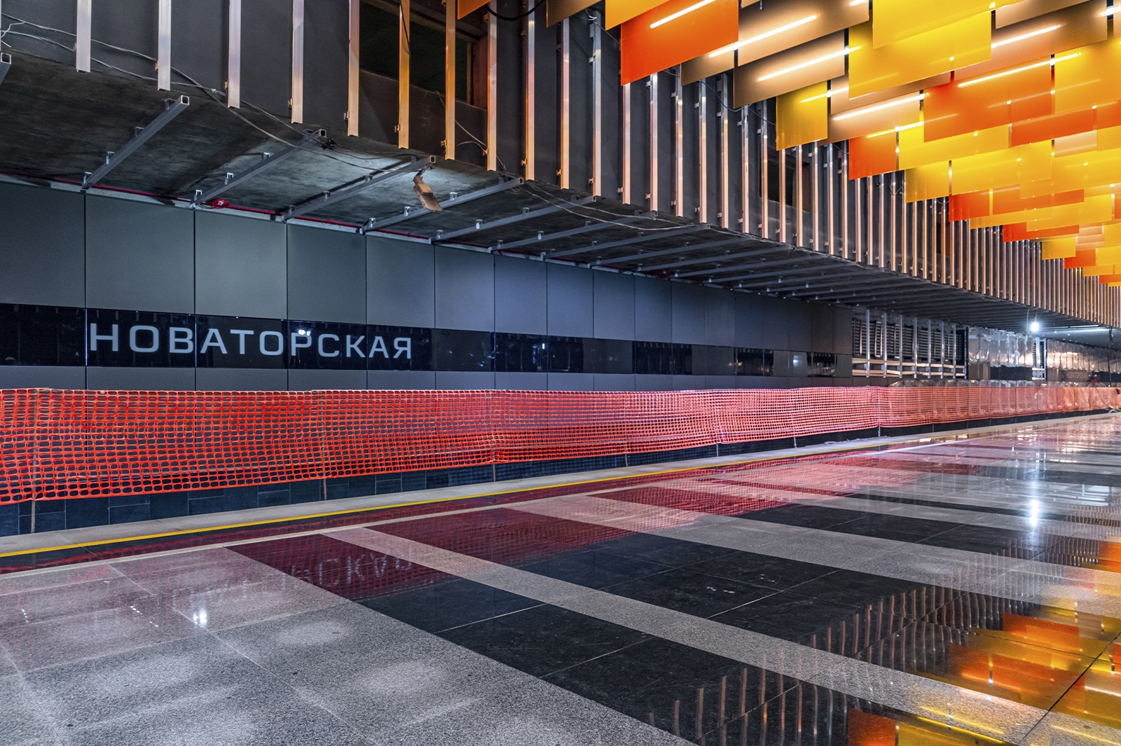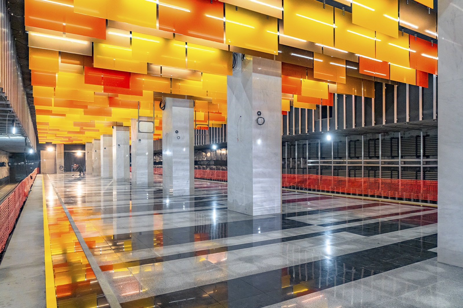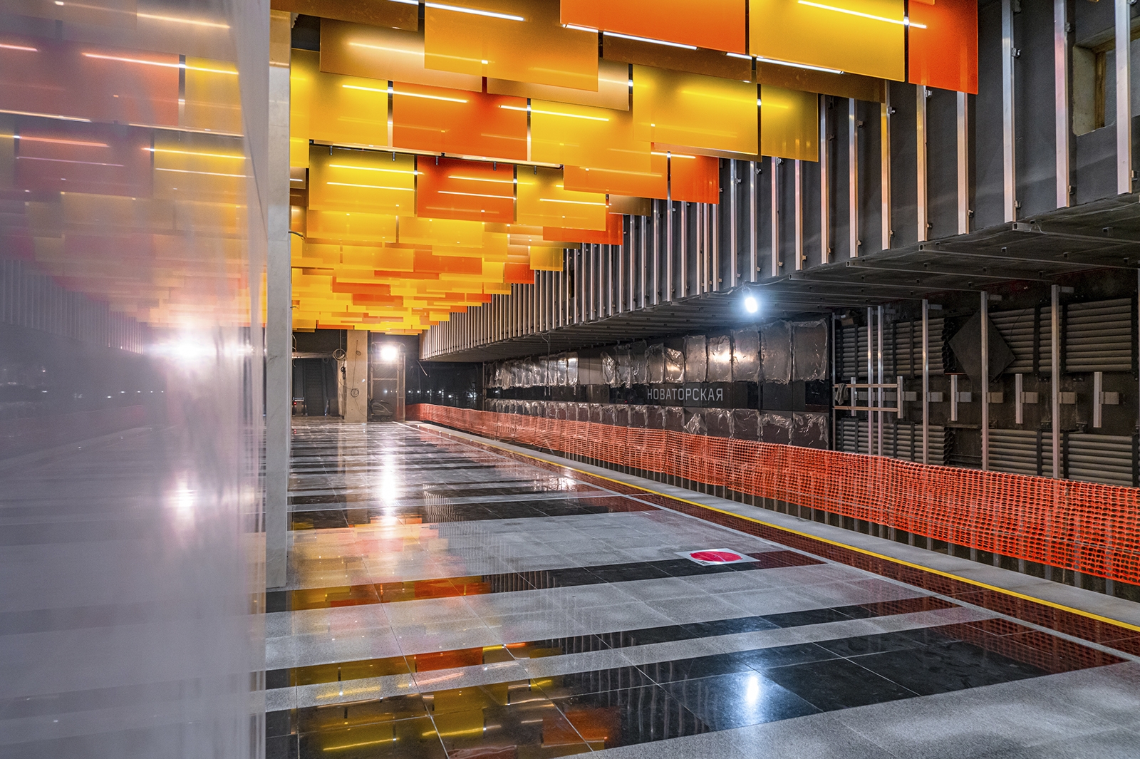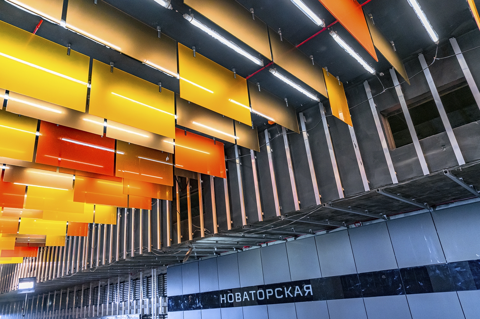 При типовой конструкции «Новаторская» имеет индивидуальный образ с узнаваемым колористическим решением. Главным ее акцентом стал подвесной потолок, который выложили панелями разного формата из триплекса с пленкой оранжевого цвета трех оттенков.