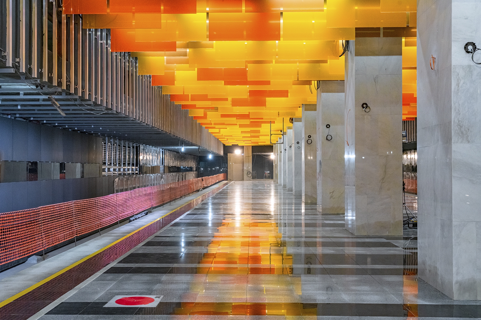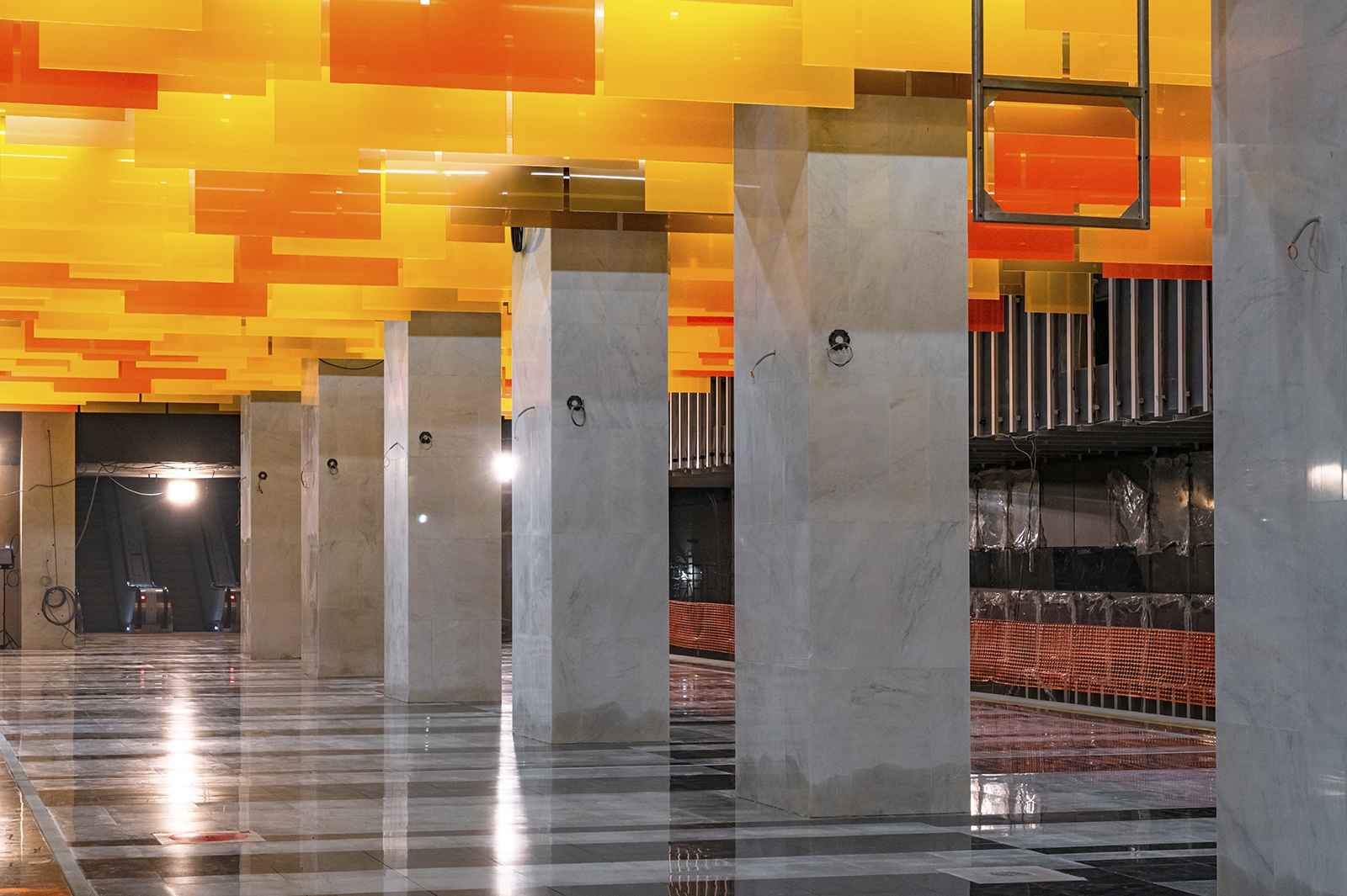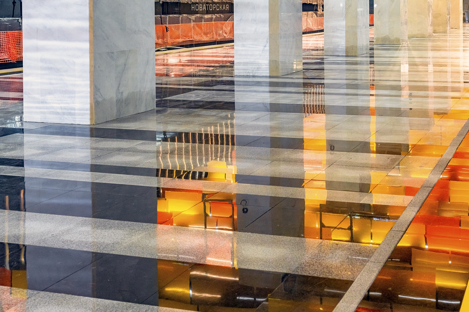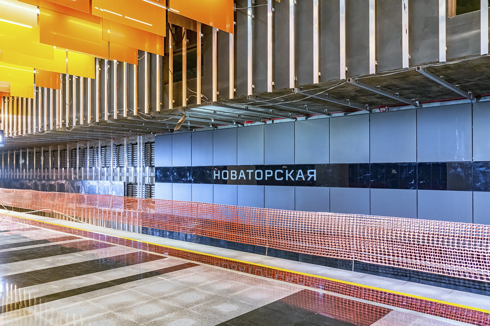 При типовой конструкции «Новаторская» имеет индивидуальный образ с узнаваемым колористическим решением. Главным ее акцентом стал подвесной потолок, который выложили панелями разного формата из триплекса с пленкой оранжевого цвета трех оттенков.
