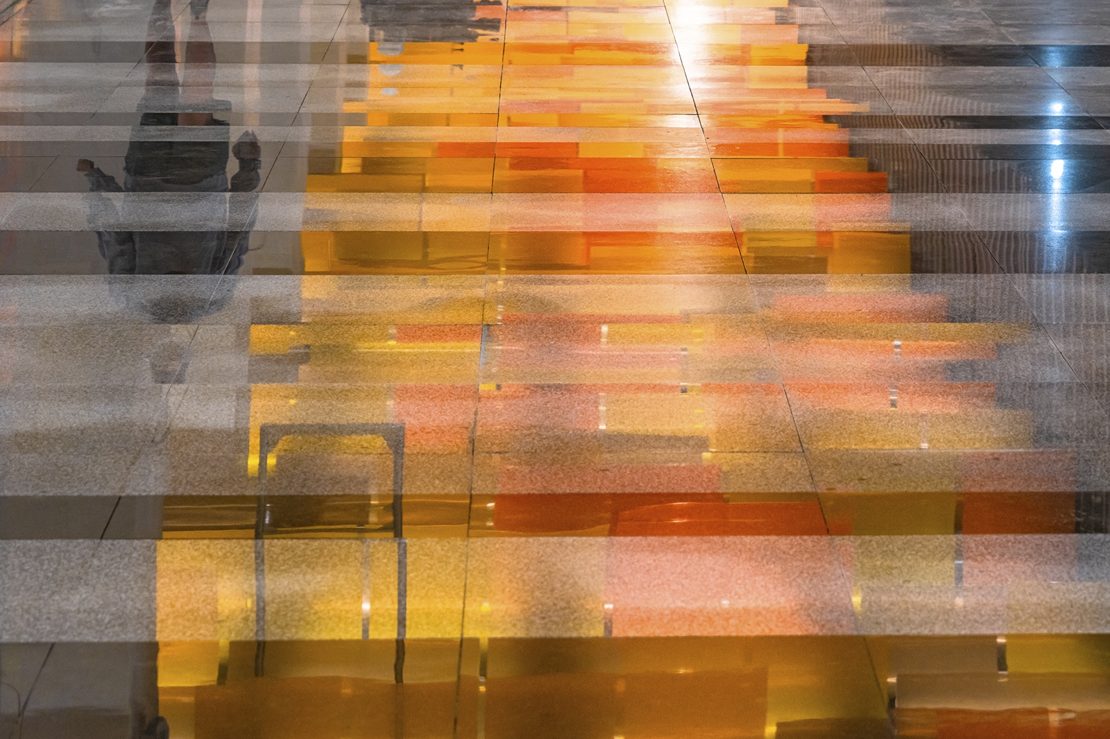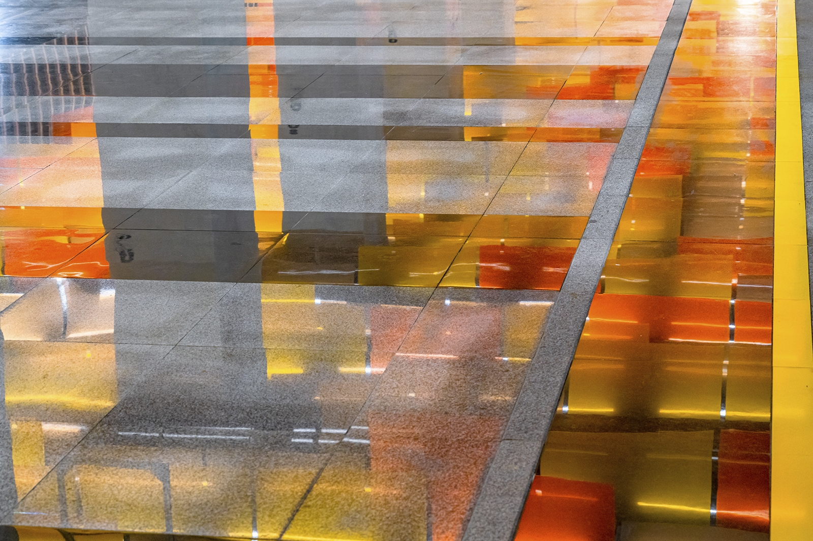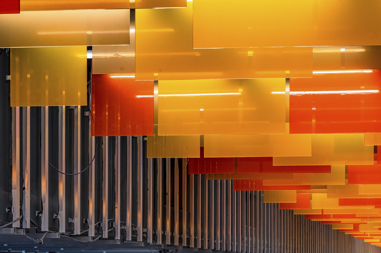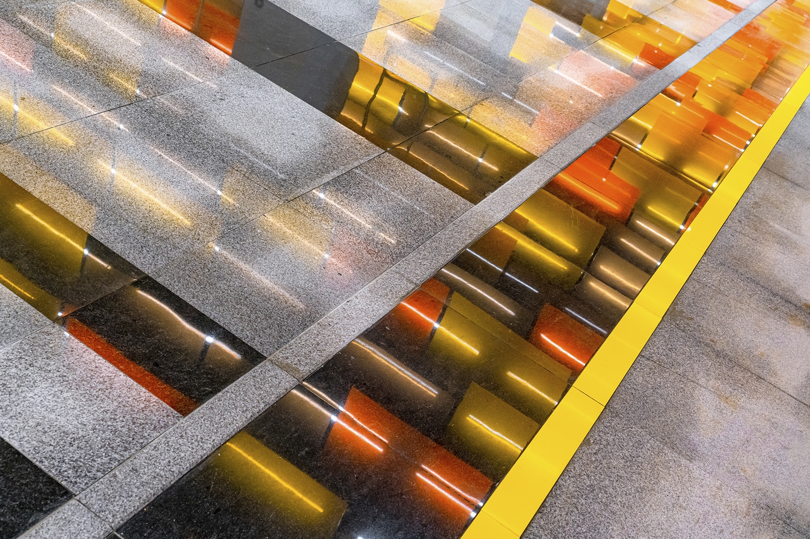 При типовой конструкции «Новаторская» имеет индивидуальный образ с узнаваемым колористическим решением. Главным ее акцентом стал подвесной потолок, который выложили панелями разного формата из триплекса с пленкой оранжевого цвета трех оттенков.