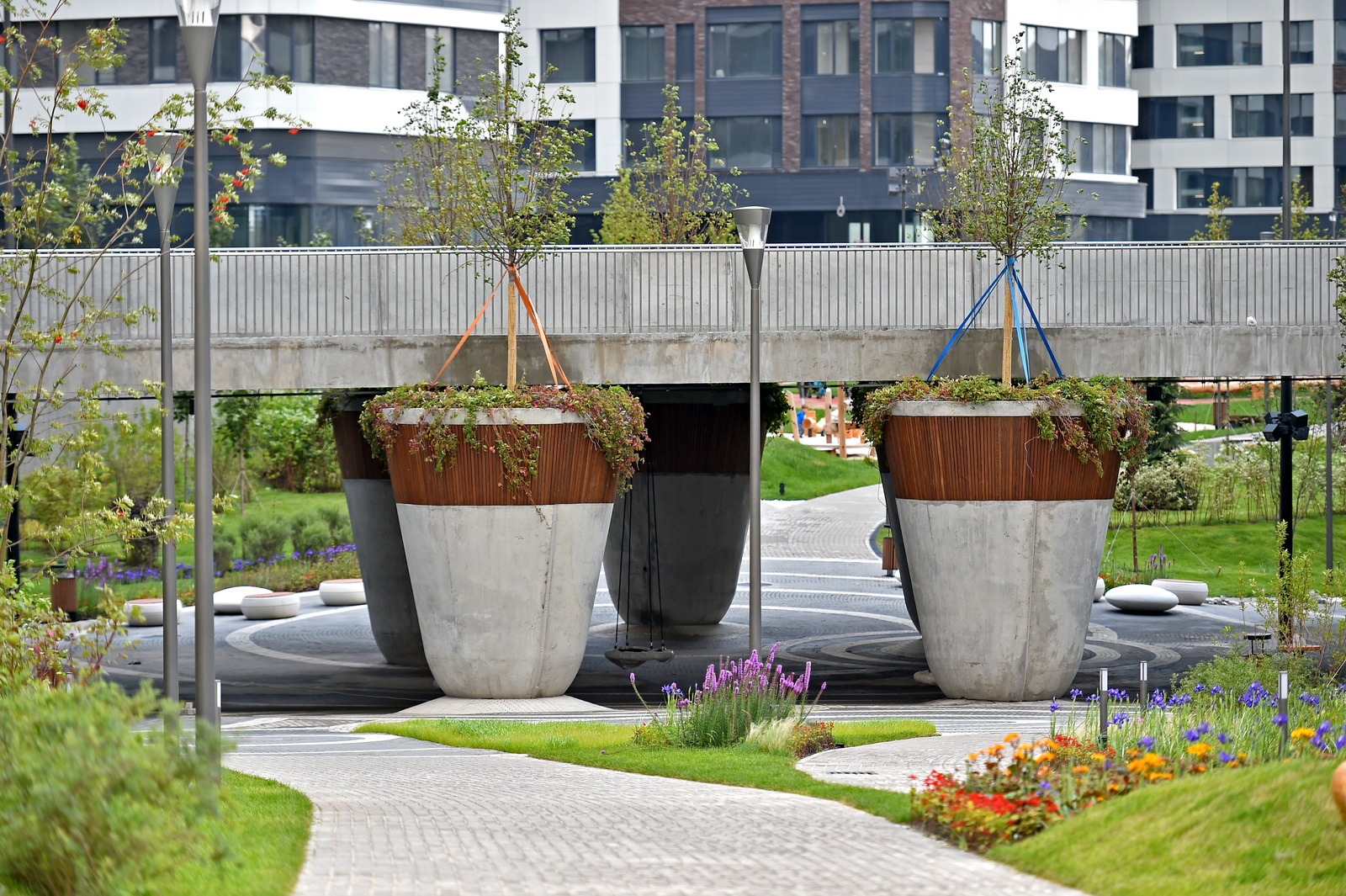 В опоры-кадки высажены европейские липы высотой около 4,5 метра и вьющийся девичий виноград, который разрастется и сформирует под мостом «висячие сады».