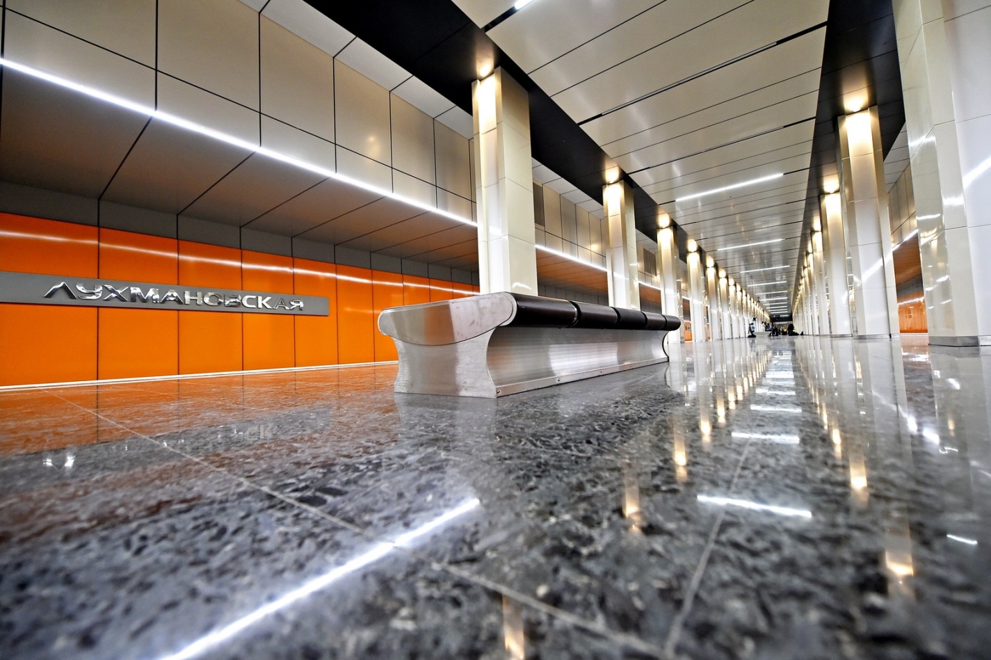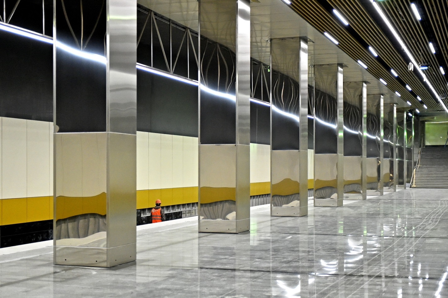 Пол украсил гранит. На платформенные колонны установили алюминиевые панели цвета «бриллиантово-шампанский металлик».