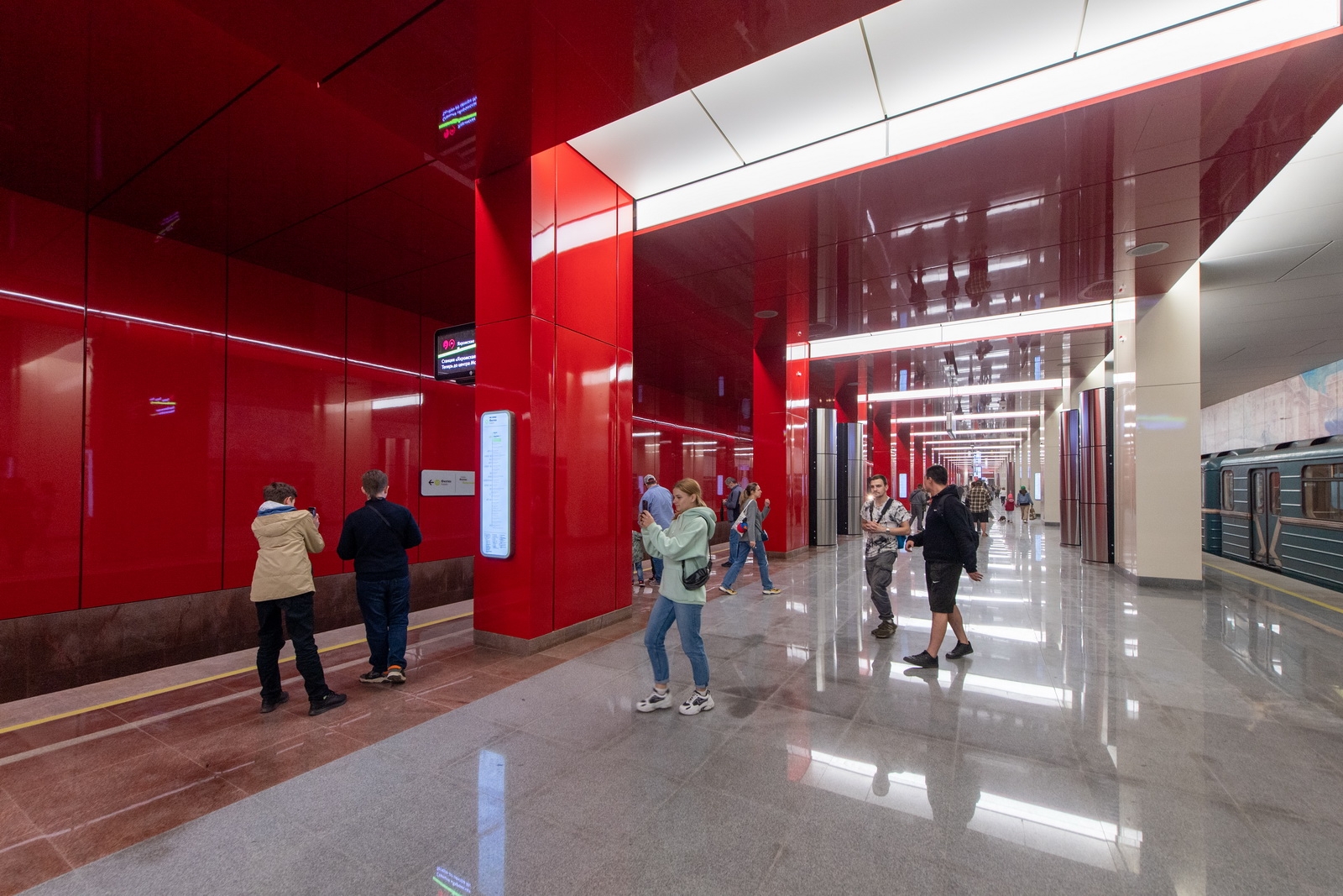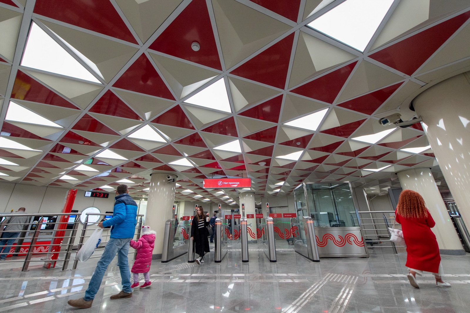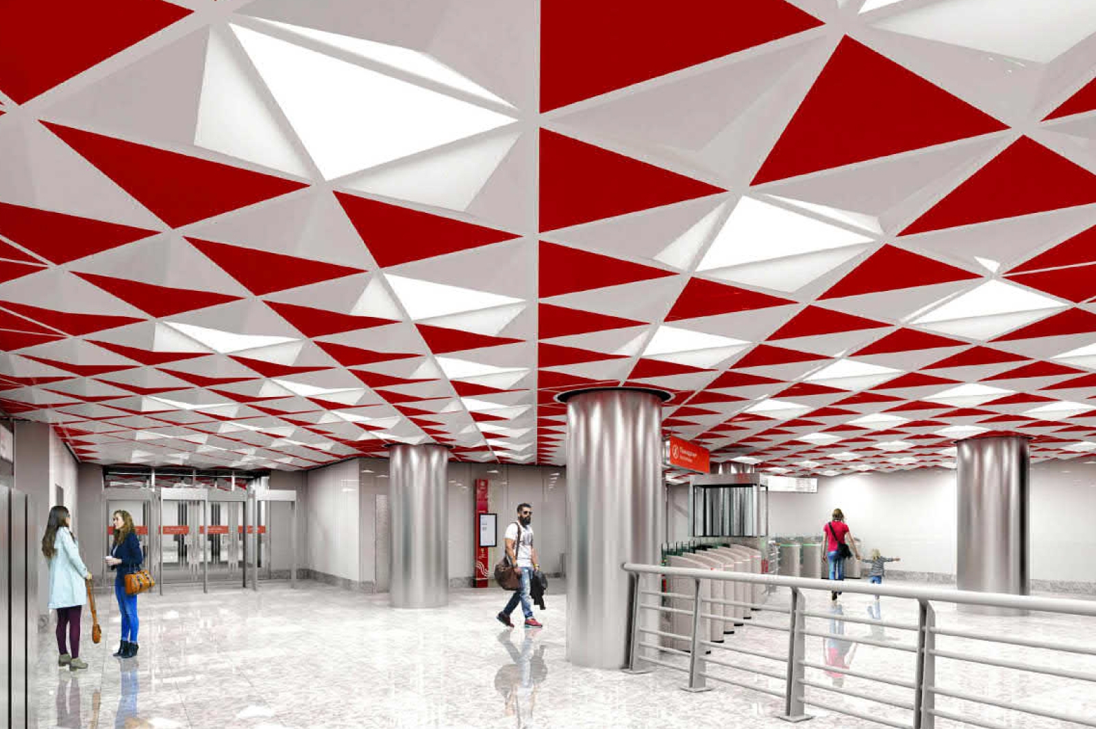 В вестибюлях пассажиры смогут полюбоваться ромбическими элементами со встроенными светильниками на потолке – они повторяют декор луковиц-куполов храма Василия Блаженного.