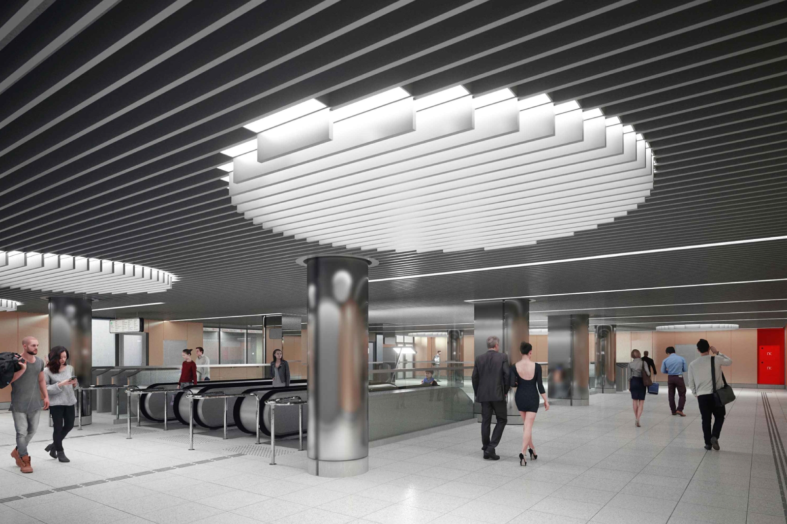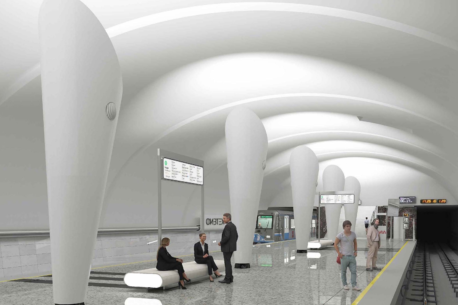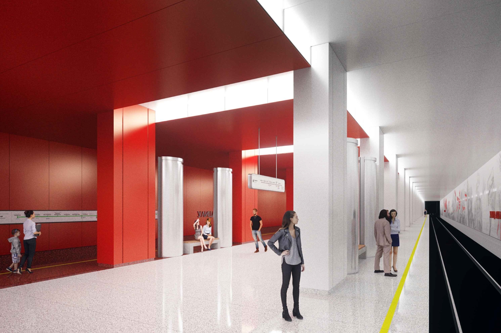 В вестибюлях пассажиры смогут полюбоваться ромбическими элементами со встроенными светильниками на потолке – они повторяют декор луковиц-куполов храма Василия Блаженного.