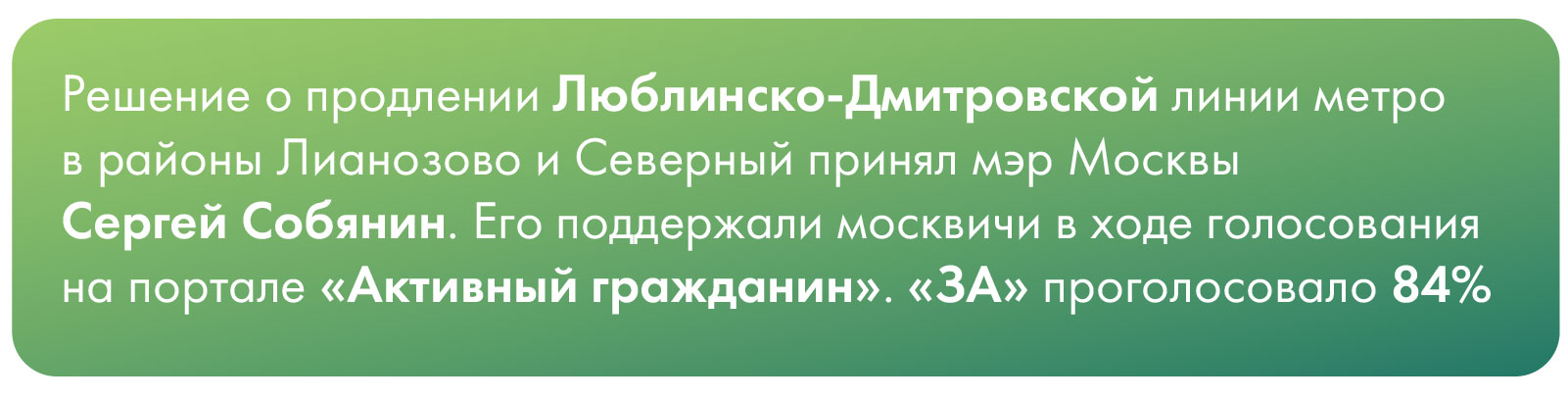Новые станции салатовой ветки метро улучшили транспортное обслуживание более 500 тыс. человек, проживающих и работающих в районах Бескудниковский, Восточное Дегунино, Дмитровский, Лианозово, Северный, а также города Долгопрудный Подмосковья.