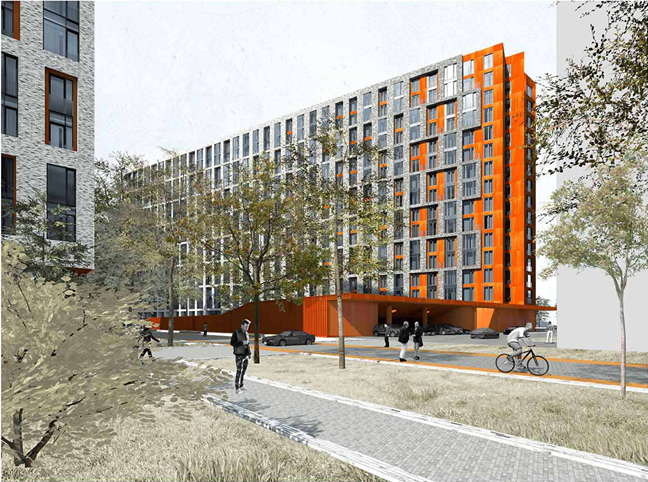 Второй жилой комплекс будет состоять из двух групп жилых домов, связанных общим стилобатом первого нежилого этажа. В него входят 14-этажные односекционные корпуса, 7-этажный двухсекционный корпус с фасадом-гармошкой и 14-этажный трехсекционный корпус.
