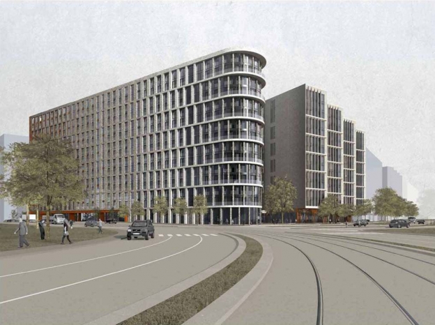 Угловой комплекс представляет собой пятисекционное здание высотой в 15 этажей. В нем предусмотрена двухэтажная подземная часть, где разместятся парковка, технические помещения и супермаркет.
