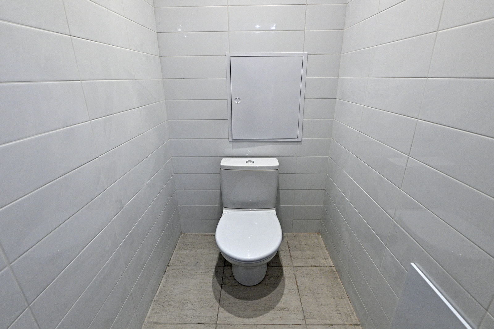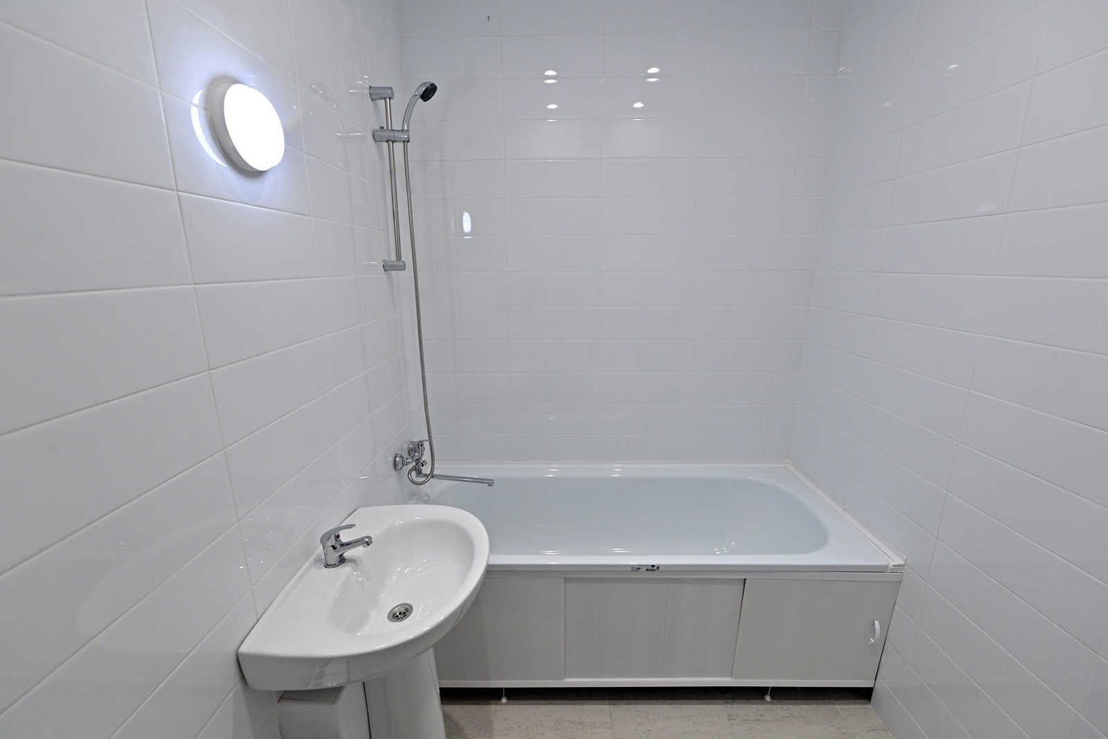 - в санузлах подвесной потолок, керамическую плитку, белую стальную ванну, белую керамическую сантехнику (раковину и унитаз), полотенцесушитель, водостойкий светильник;